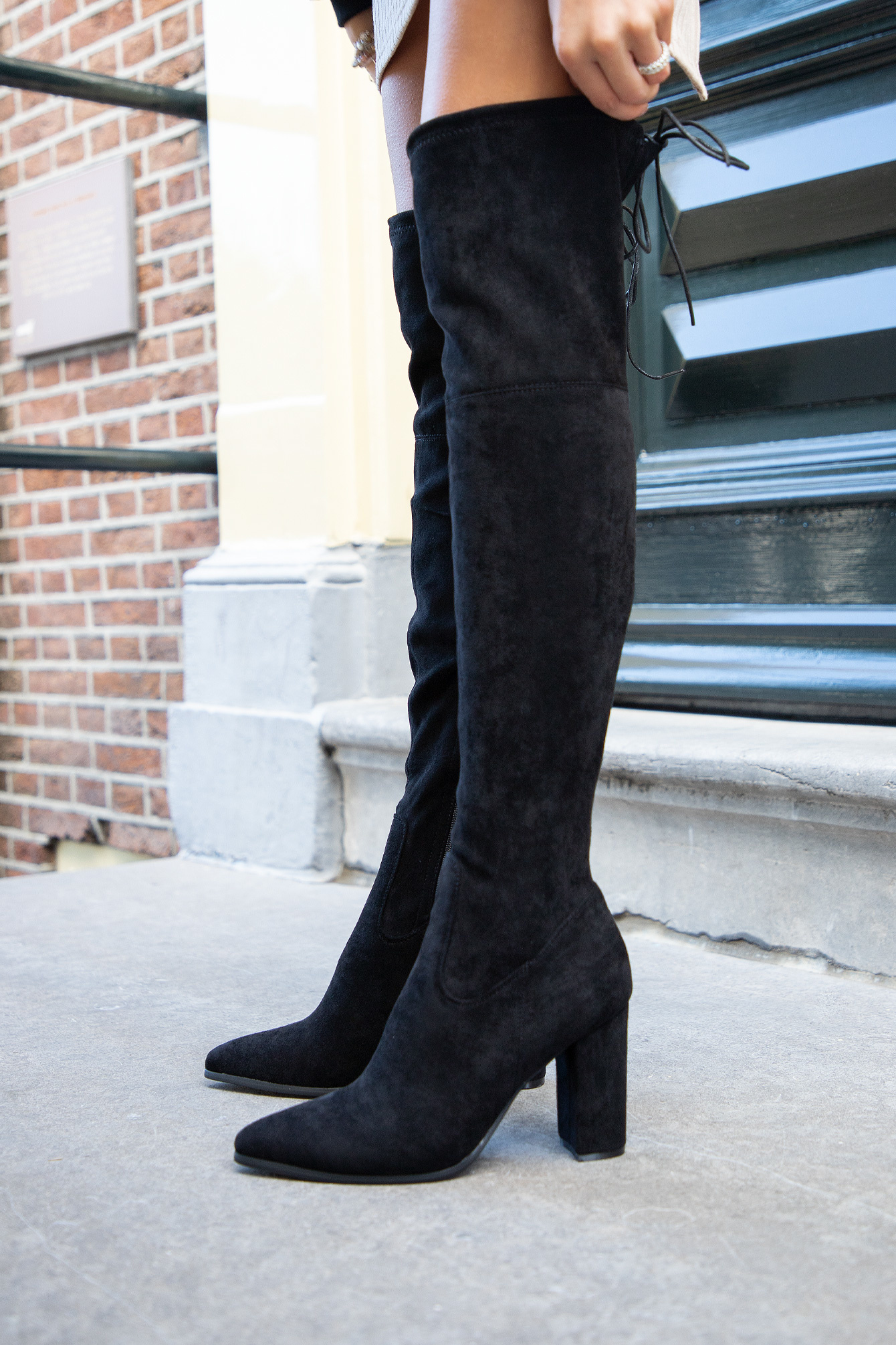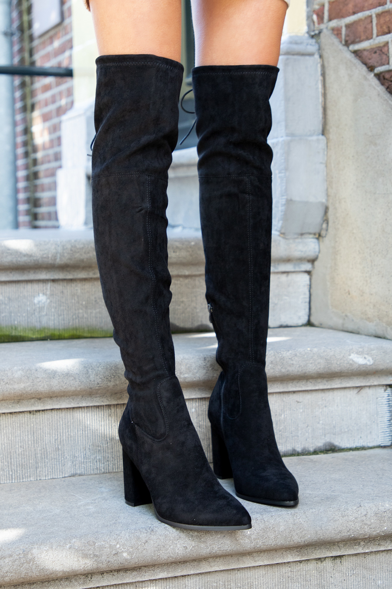 Deze leuke Emma knie laars geeft een feminine look aan je outfit en laat je van top tot teen stralen. Deze hakken hebben een zwarte suède print met een rits aan de zijkant. Door de touwtjes aan de bovenkant van de laars blijft de schoen mooi om de been zitten. Heb jij nog geen over kneeboots in de kast? Dan is dit de perfecte gelegenheid om er een aan te schaffen. Je kan het leuk stylen met een jurkje of een sweater dress!