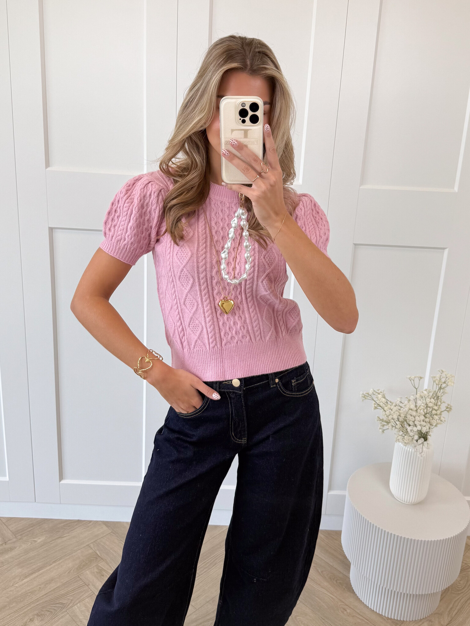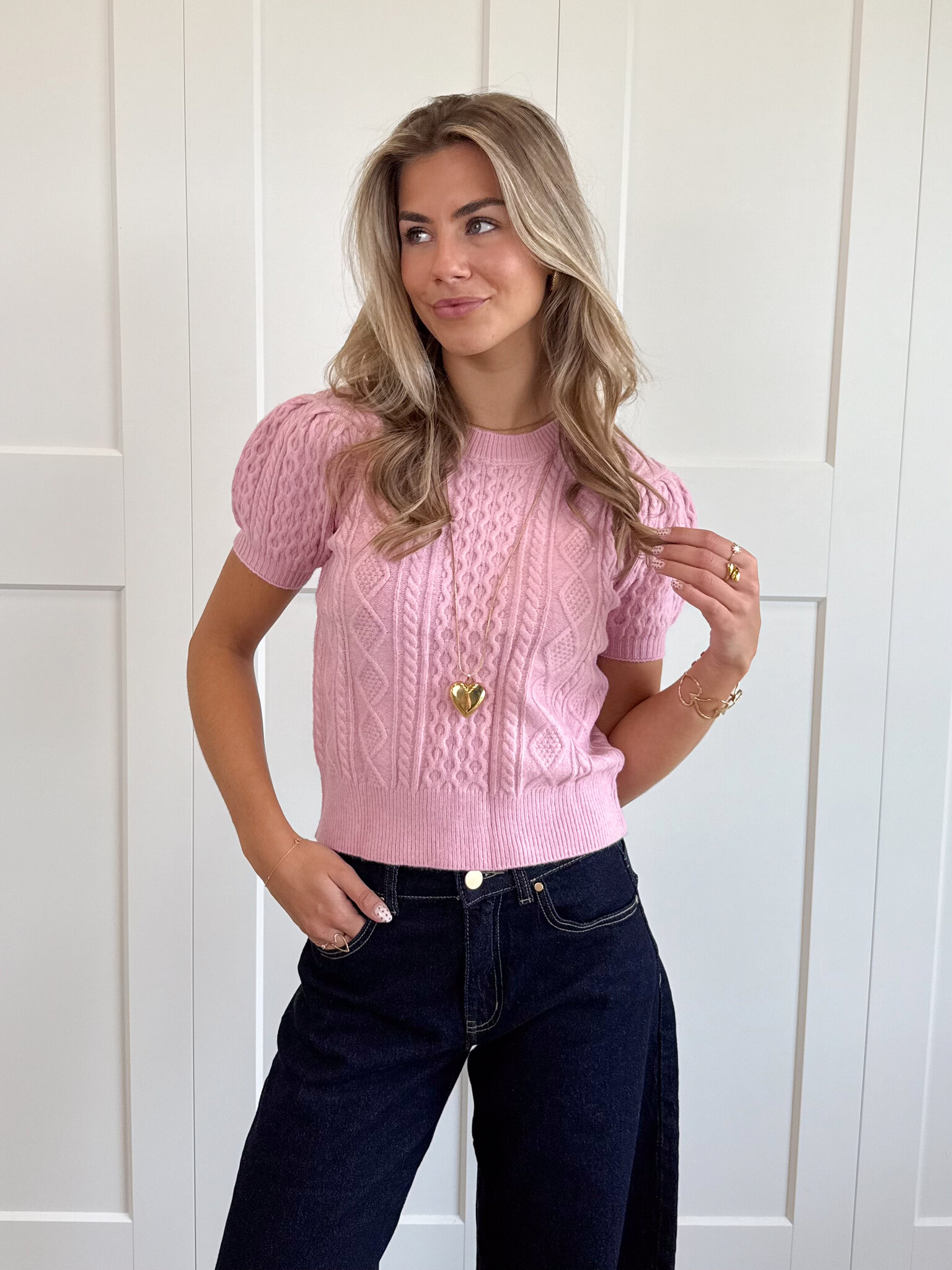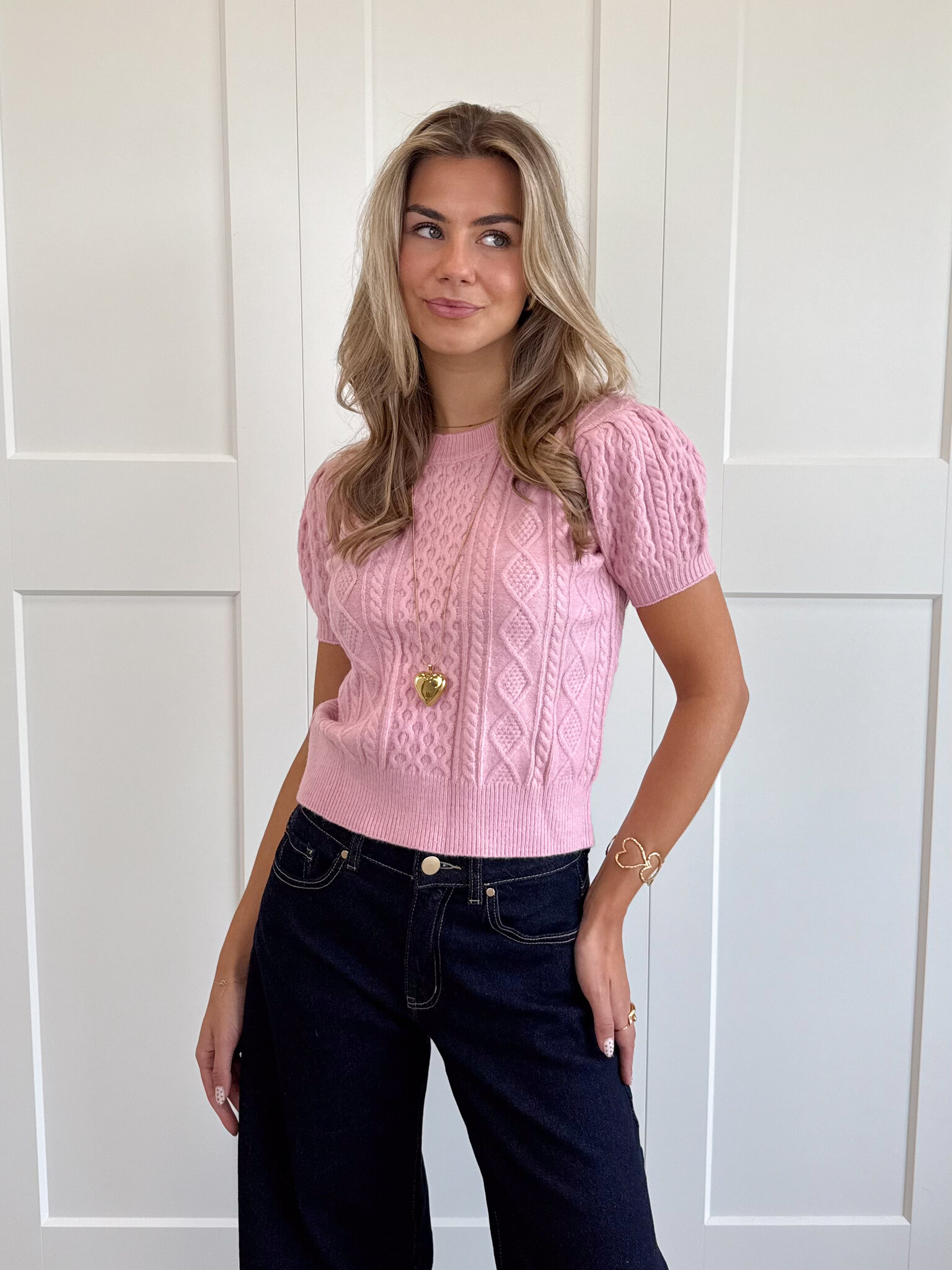 Deze gebreide top is de perfecte mix tussen cozy en stijlvol. Het kabelpatroon geeft de top een klassieke en tijdloze uitstraling, terwijl de korte mouwen zorgen voor een luchtige touch, ideaal voor de seizoenen waarin je net dat beetje warmte nodig hebt, maar geen dikke trui wilt dragen.