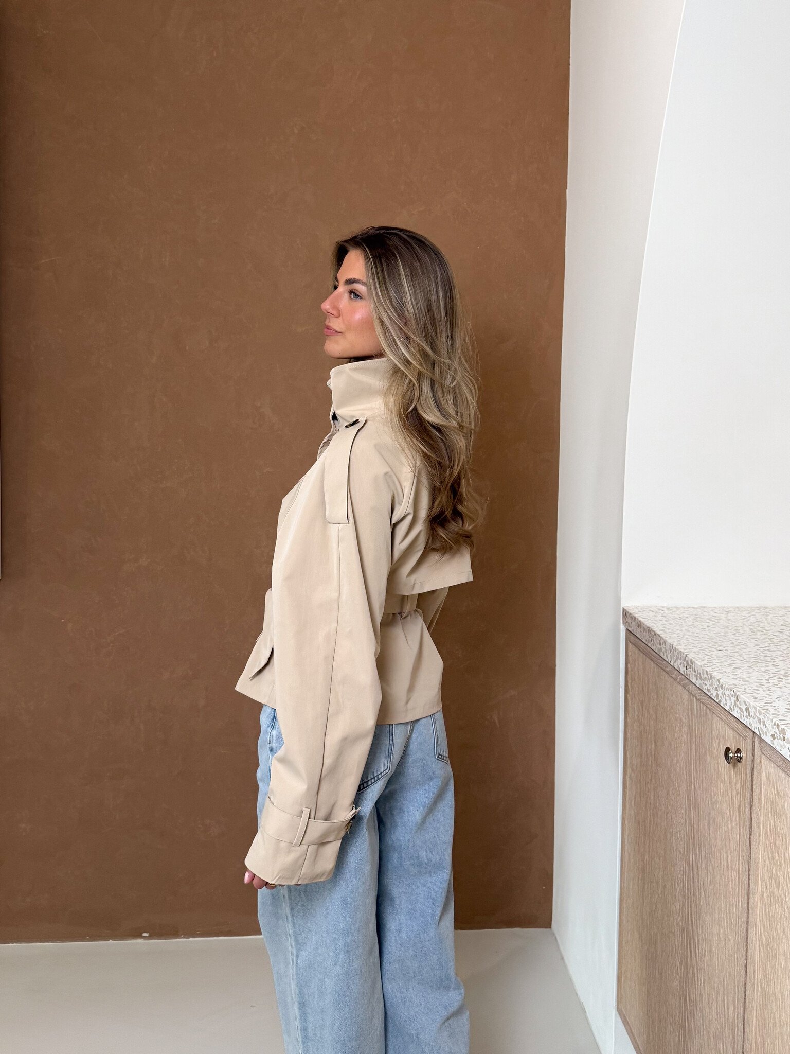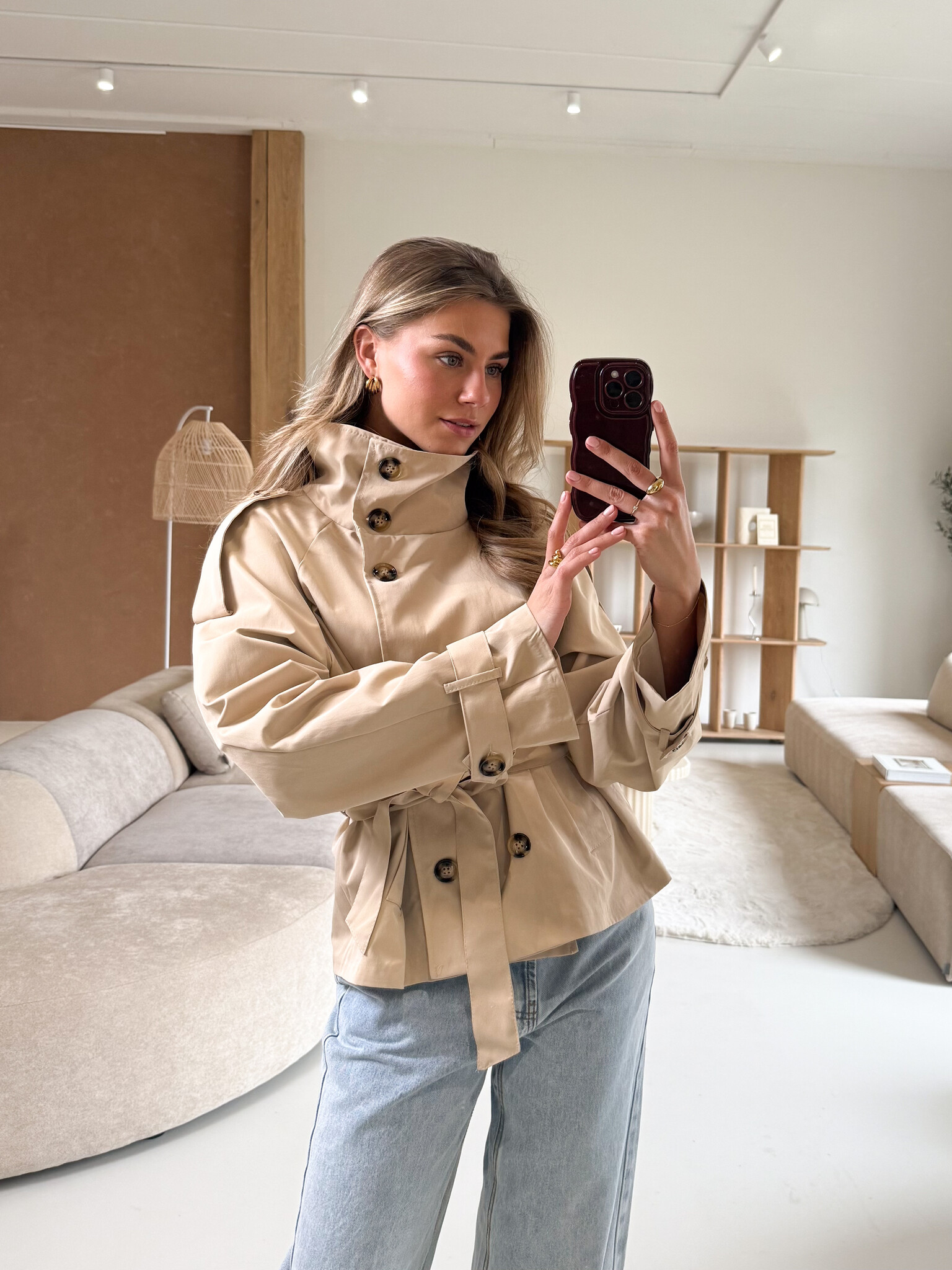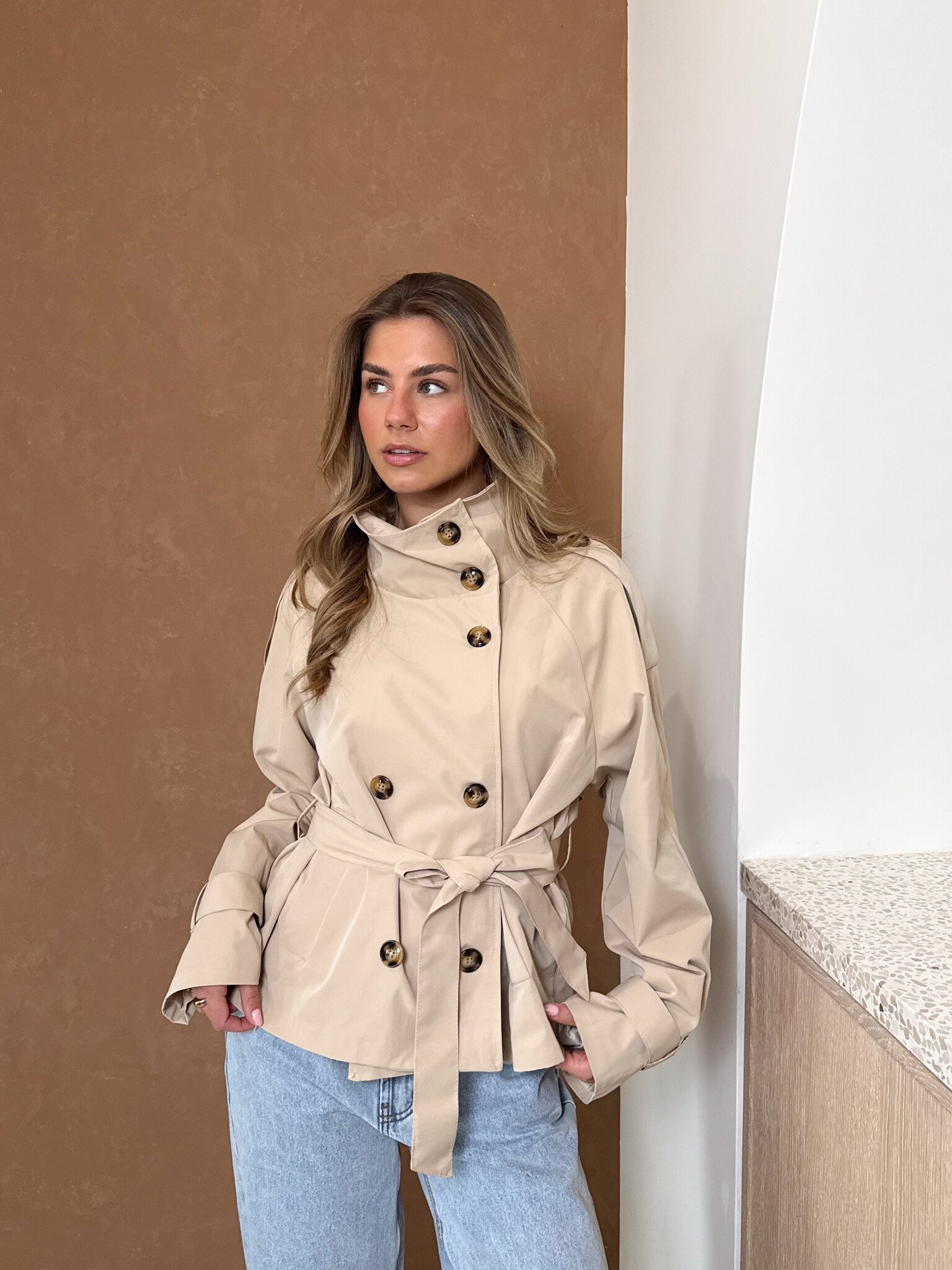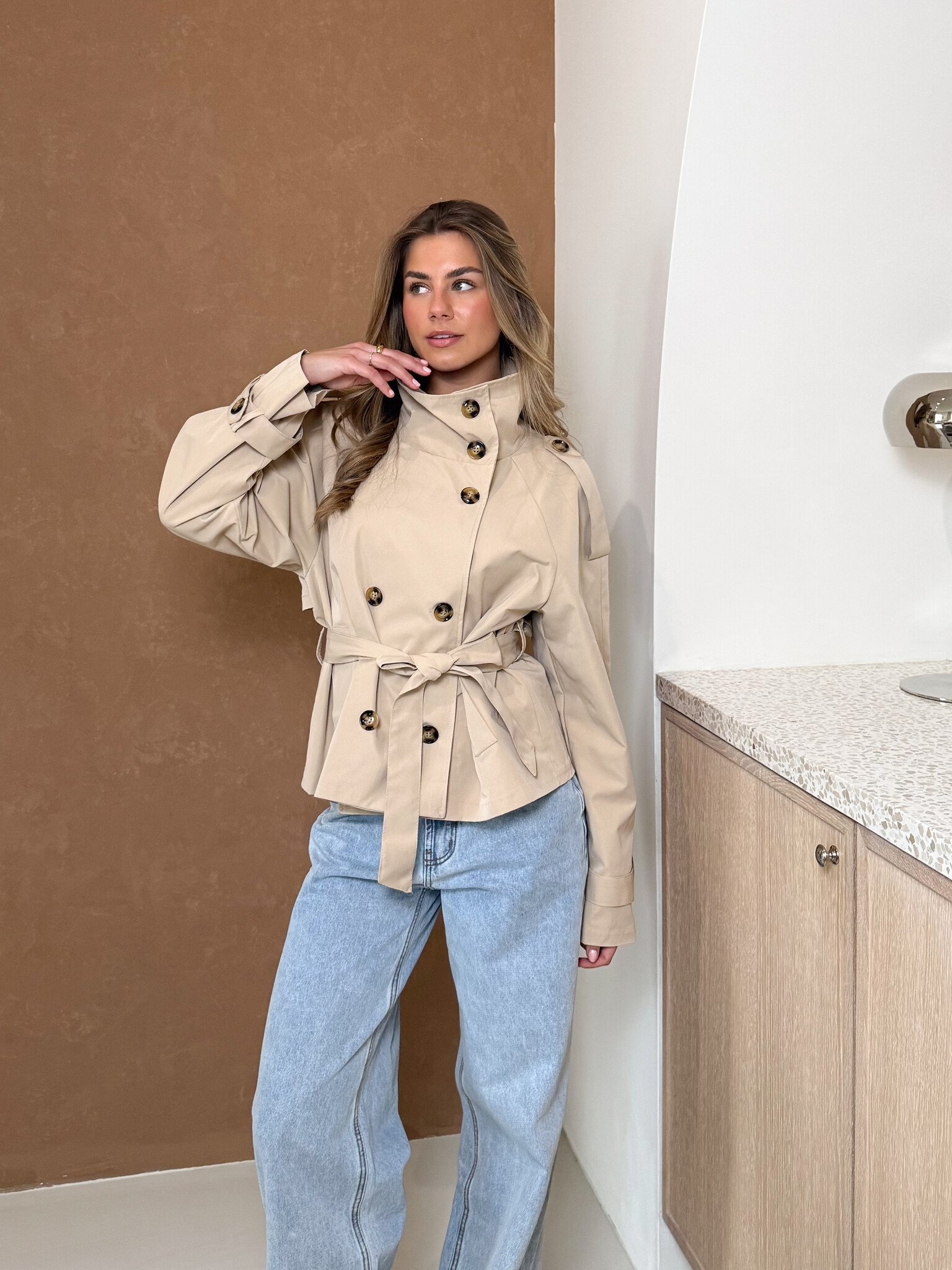 Deze trenchcoat is een tijdloos en elegant item dat elke outfit direct een stijlvolle uitstraling geeft. Het ontwerp is voorzien van een hoge kraag die zorgt voor een chique en moderne look. Aan de voorkant zitten knopen die de jas een klassieke trenchcoat uitstraling geven. De strikceintuur in de taille zorgt ervoor dat je de jas mooi kunt tailleren, waardoor je silhouet op een vrouwelijke manier wordt geaccentueerd. Dit detail geeft de jas een extra girly en elegante touch. De trenchcoat is perfect te combineren met zowel casual als meer geklede outfits. Draag hem over een jeans met sneakers voor een trendy city look of combineer met een jurk en hakken voor een meer classy outfit. Ideaal voor een werkdag, een lunchdate of een frisse dag in de stad. Een echte wardrobe classic die nooit uit de mode raakt.