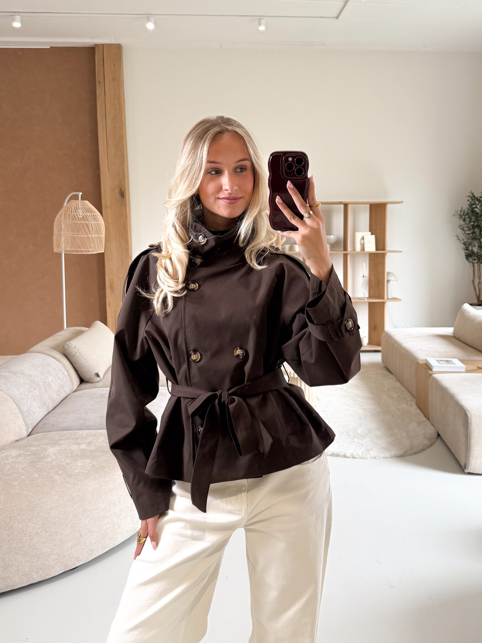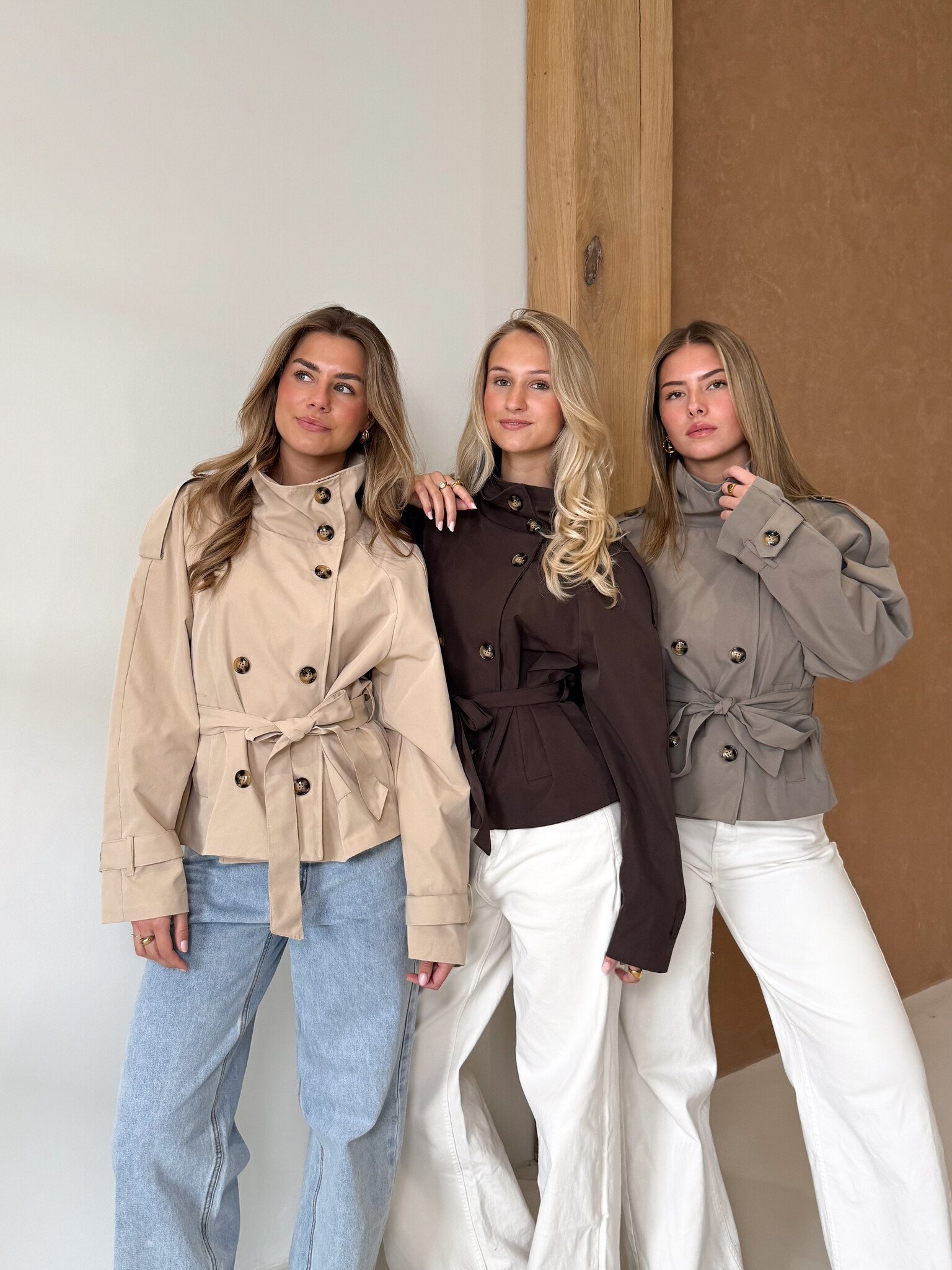Deze trenchcoat is een tijdloos en elegant item dat elke outfit direct een stijlvolle uitstraling geeft. Het ontwerp is voorzien van een hoge kraag die zorgt voor een chique en moderne look. Aan de voorkant zitten knopen die de jas een klassieke trenchcoat uitstraling geven. De strikceintuur in de taille zorgt ervoor dat je de jas mooi kunt tailleren, waardoor je silhouet op een vrouwelijke manier wordt geaccentueerd. Dit detail geeft de jas een extra girly en elegante touch. De trenchcoat is perfect te combineren met zowel casual als meer geklede outfits. Draag hem over een jeans met sneakers voor een trendy city look of combineer met een jurk en hakken voor een meer classy outfit. Ideaal voor een werkdag, een lunchdate of een frisse dag in de stad. Een echte wardrobe classic die nooit uit de mode raakt.