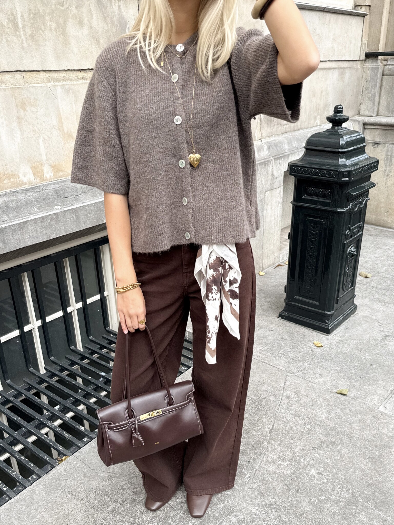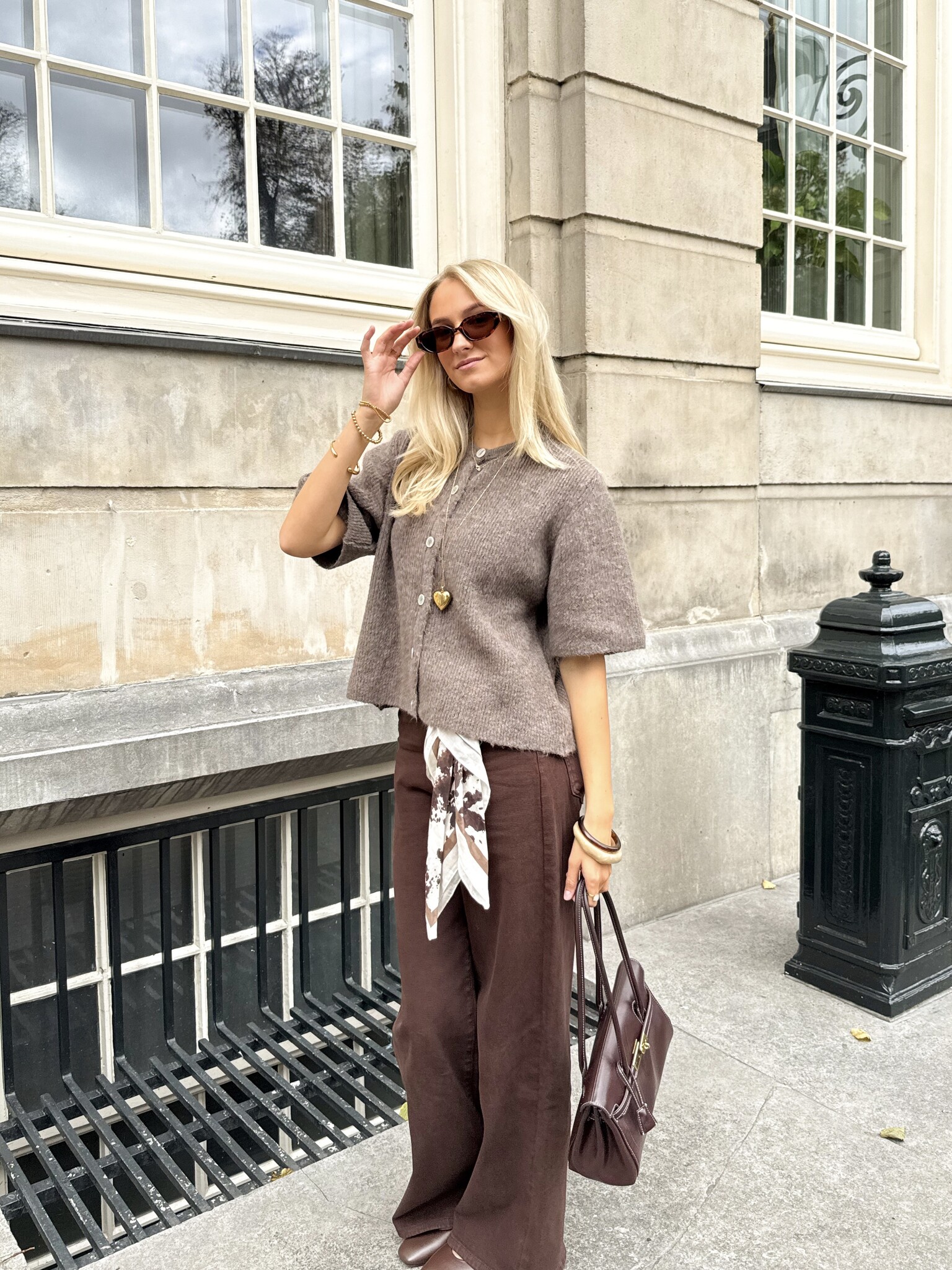 Dit zachte korte mouwen vestje is een musthave voor het nieuwe seizoen. De zachte wollen stof voelt heerlijk en comfortabel aan en geeft je outfit een cozy uitstraling. De korte mouwen maken het perfect voor de herfst. De knoopsluiting aan de voorkant geeft een mooie touch terwijl de pasvorm mooi aansluit zonder strak te zitten. Combineer het met een leuke jeans voor een casual look. Of je nu een dagje gat shoppen, koffie drinkt met vriendinnen of een casual werkdagje hebt. Dit vestje past bij elke gelegenheid en voegt net dat beetje zachtheid toe aan je outfit.