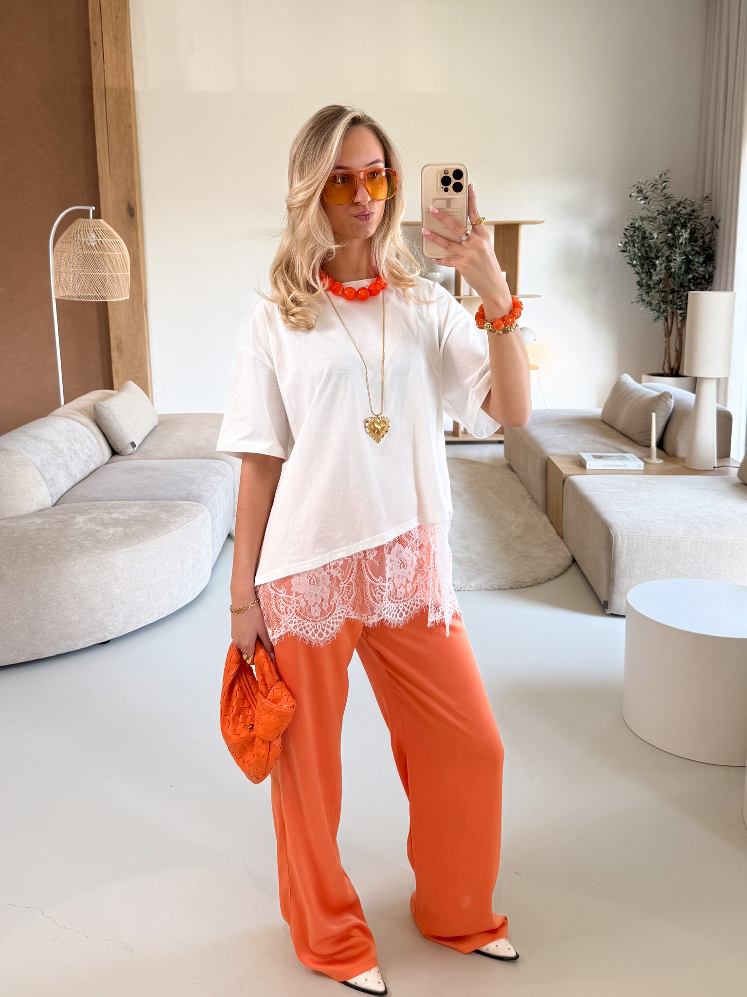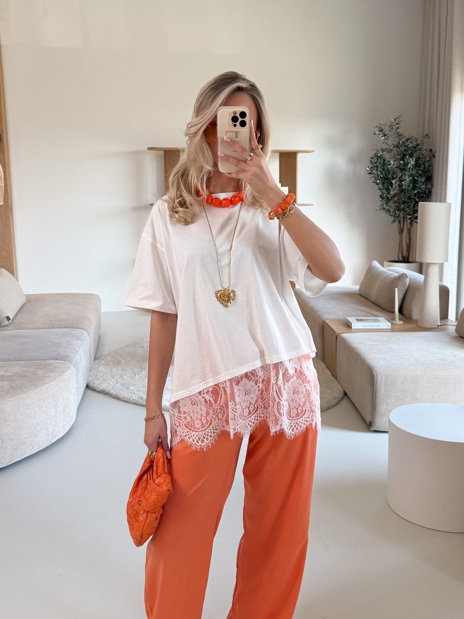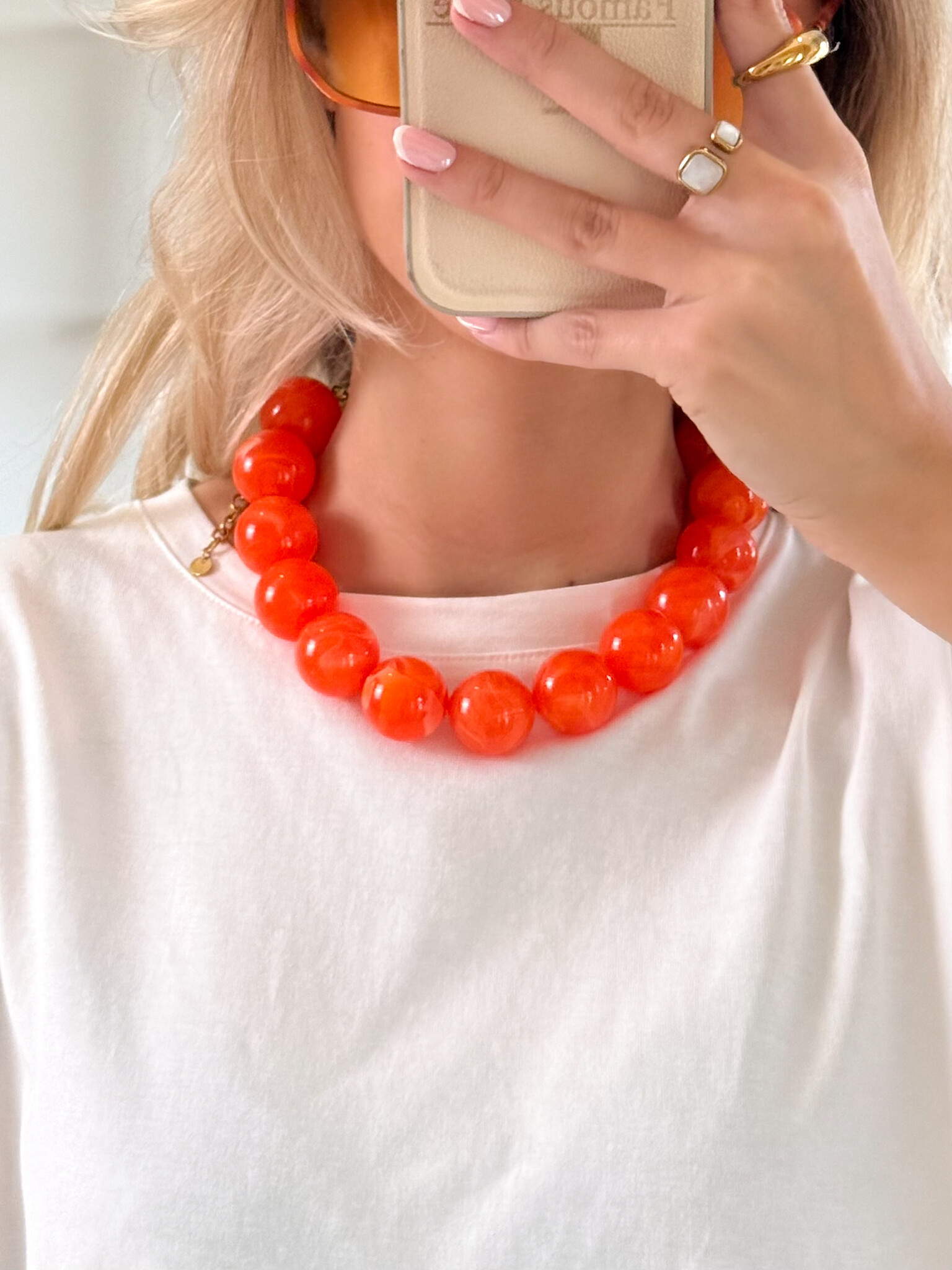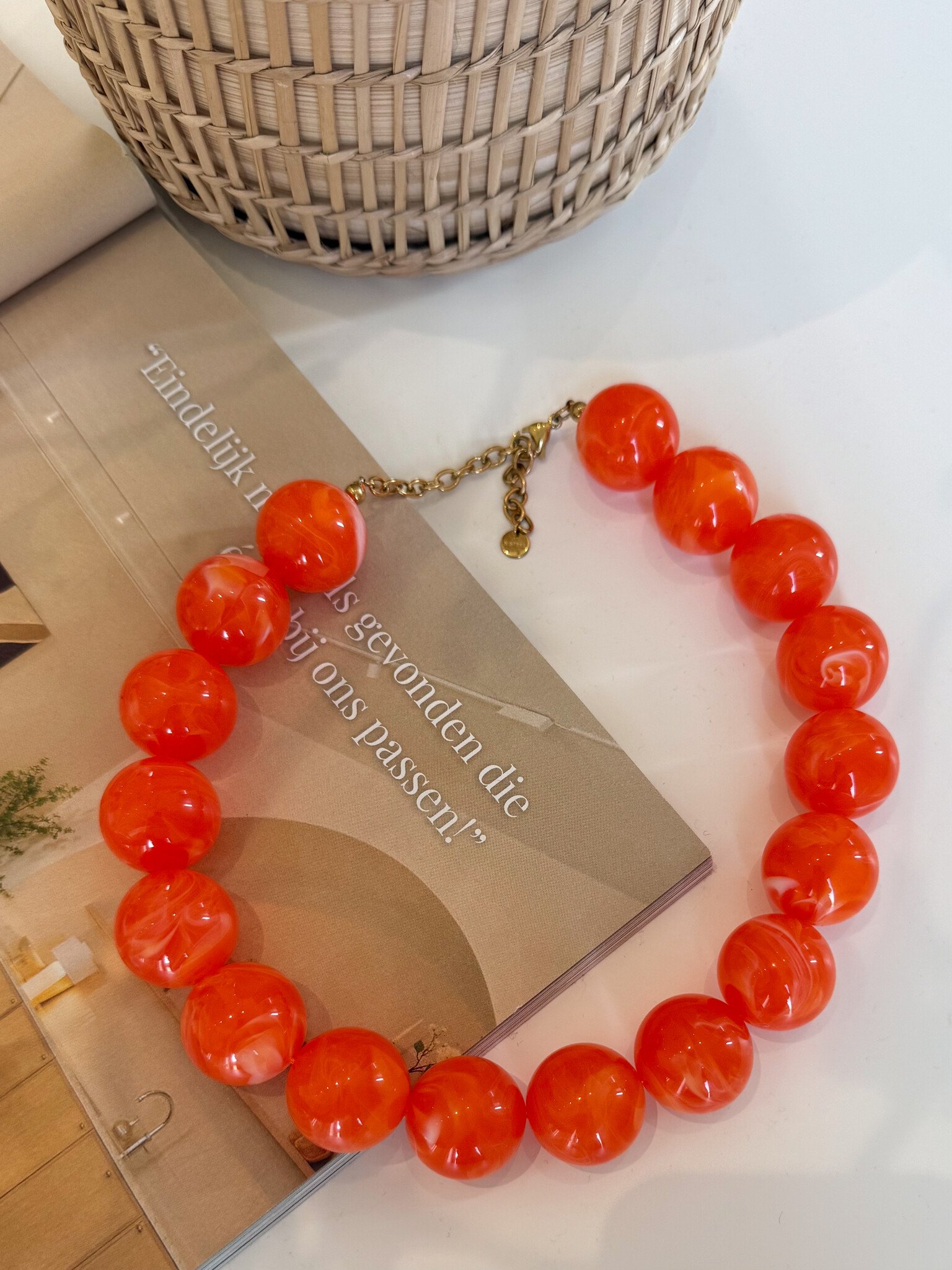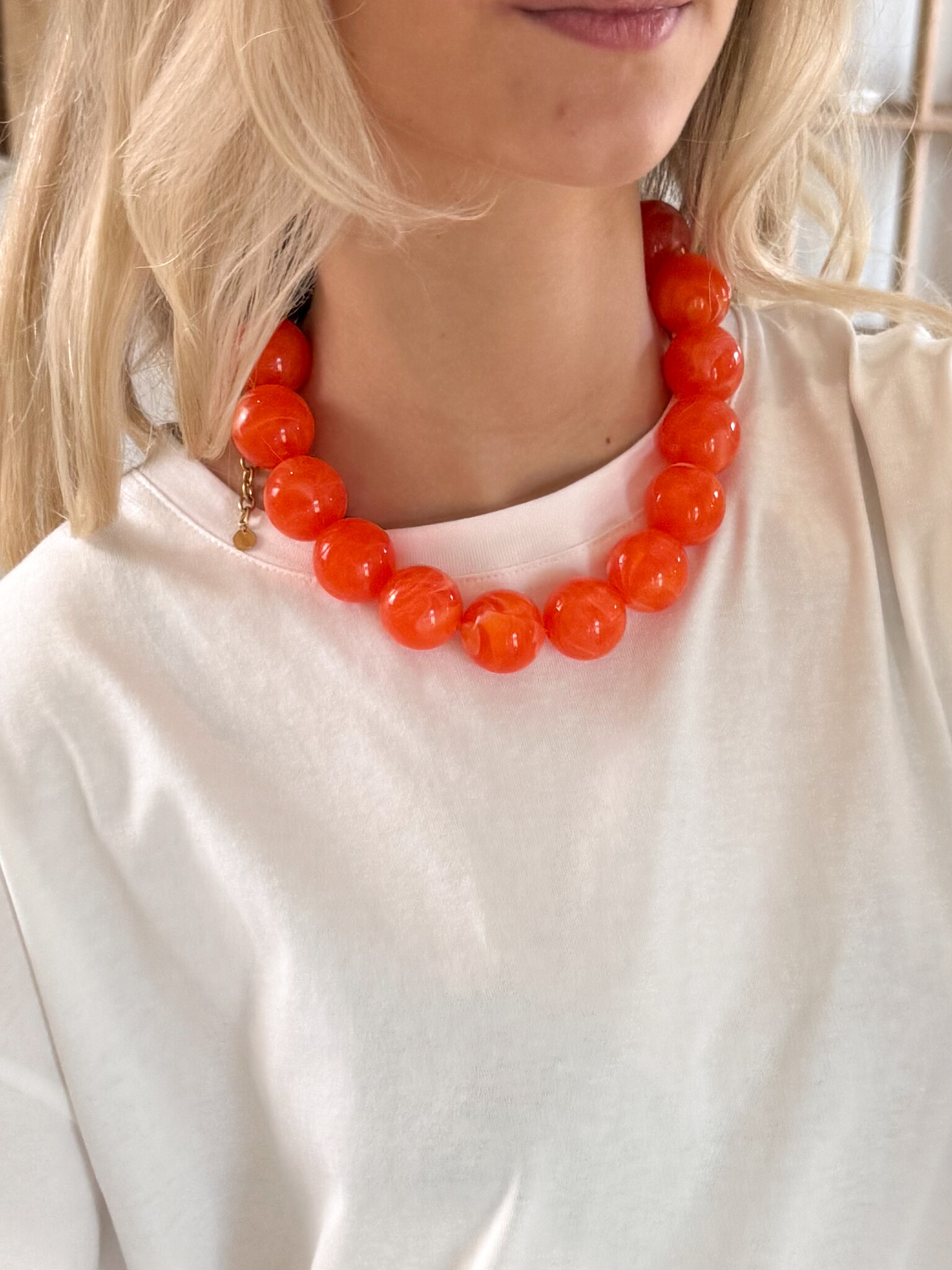 Deze grove oranje kralenketting is een echte eyecatcher en voegt een speelse, girly touch toe aan elke outfit. De grotere kralen geven een opvallend statement terwijl de warme oranje tint direct zomerse vibes uitstraalt. Perfect om je basic top, blouse of jurk mee op te vrolijken. De ketting is licht van gewicht en comfortabel te dragen, waardoor hij ideaal is voor festivals, citytrips of een casual dagje uit. Combineer met andere accessoires voor een bohemian layered look of draag solo voor een kleurrijk statement. Een vrolijk en veelzijdig sieraad dat elke outfit een zonnige en trendy boost geeft.