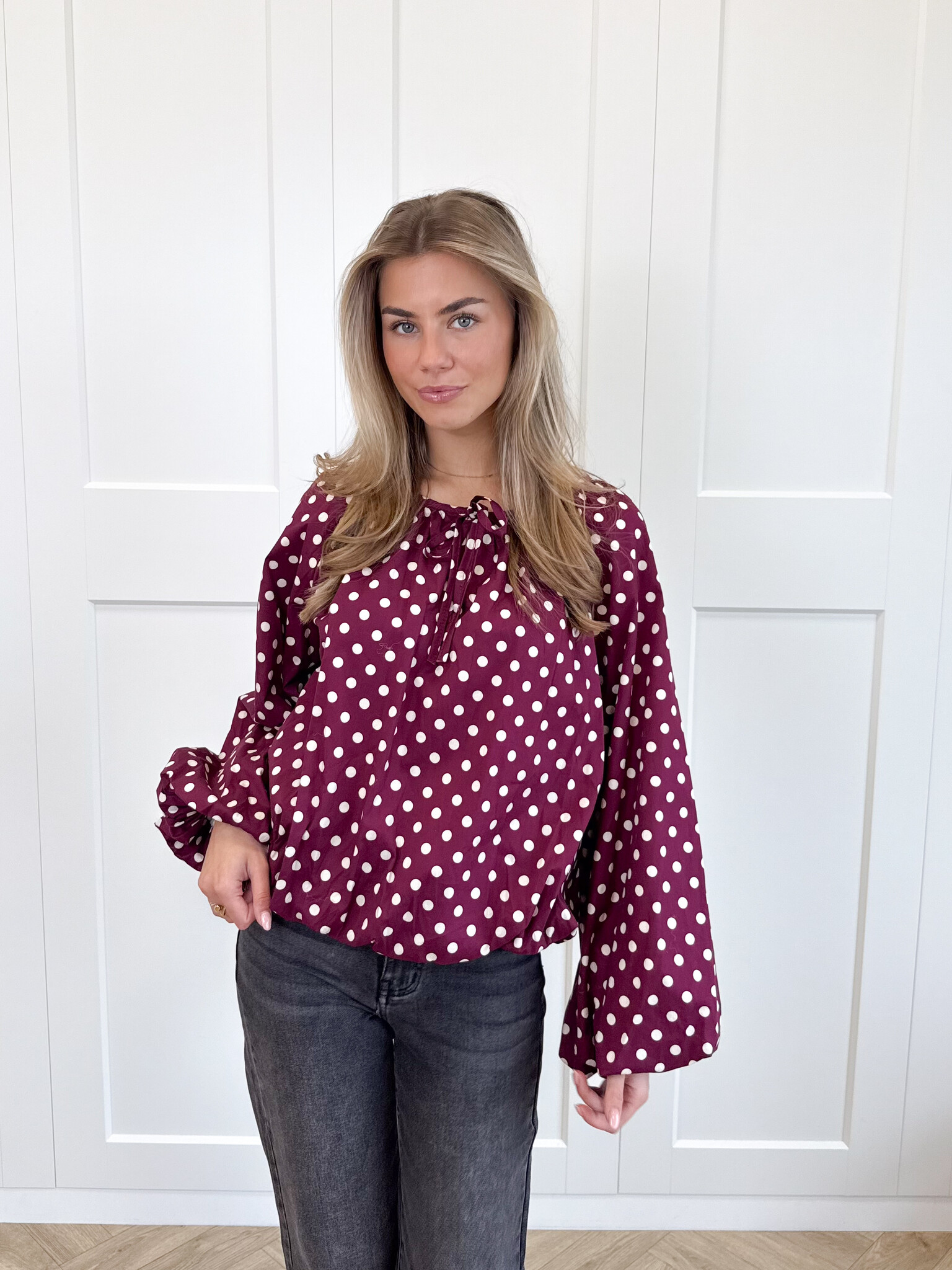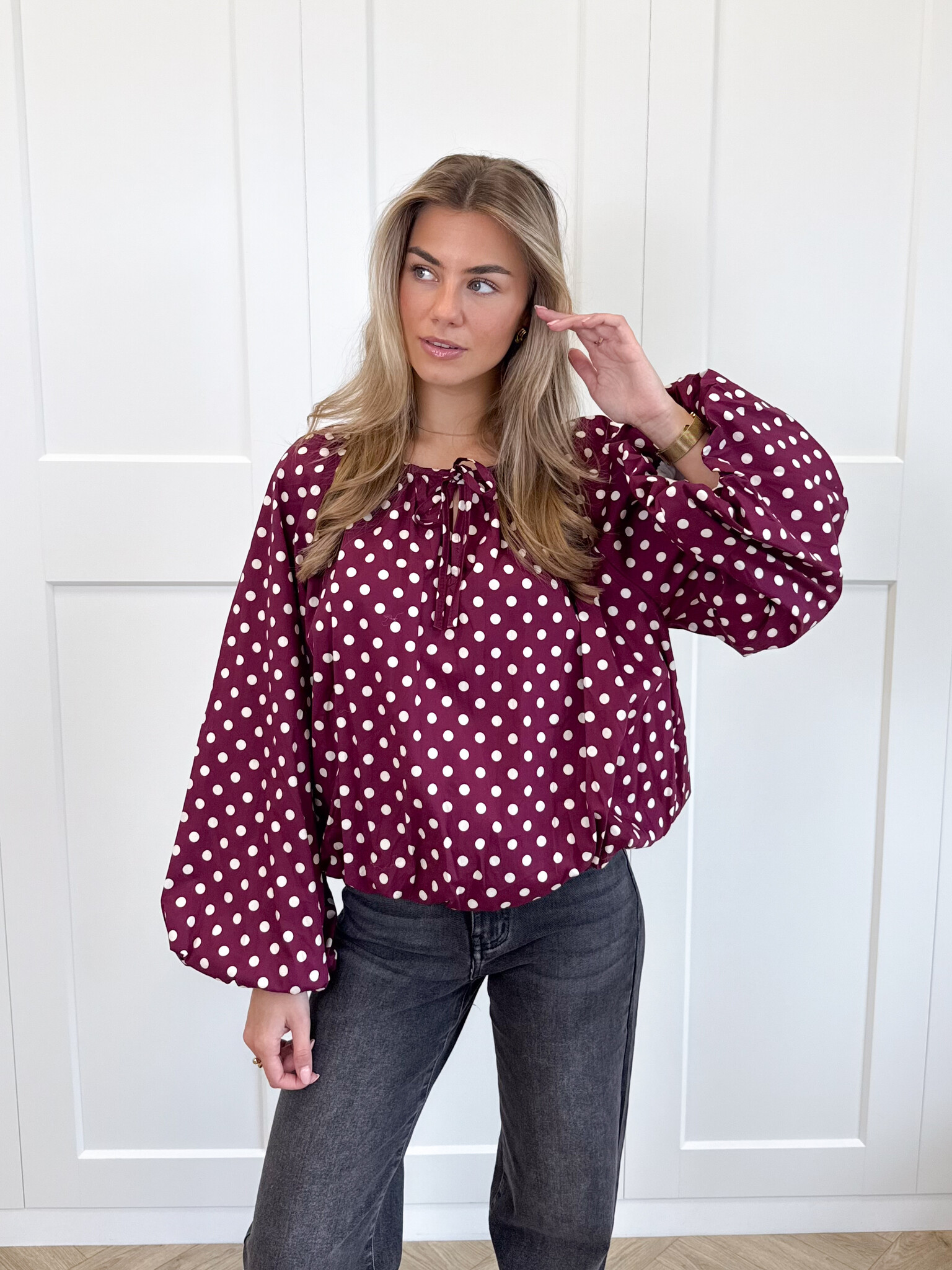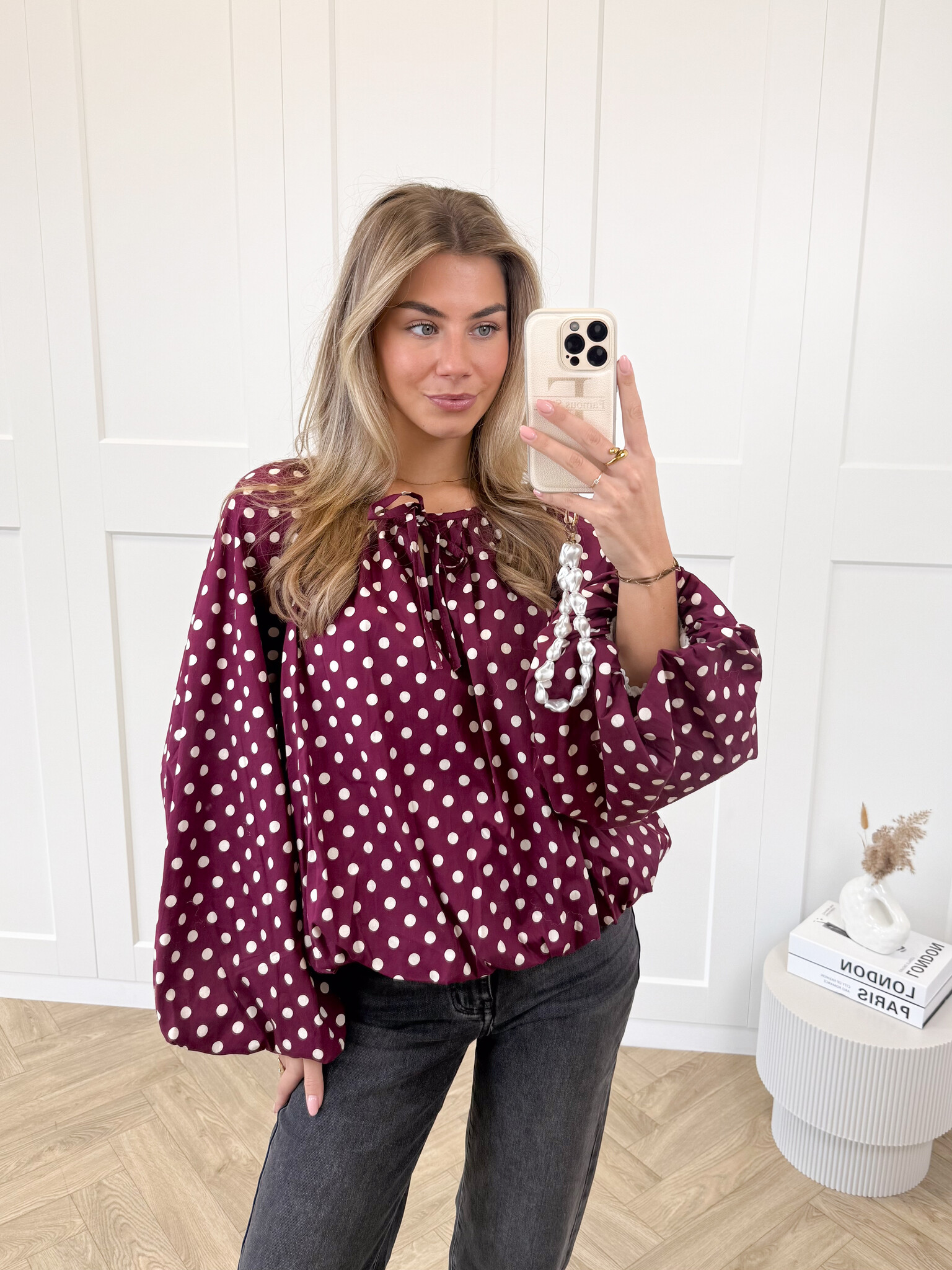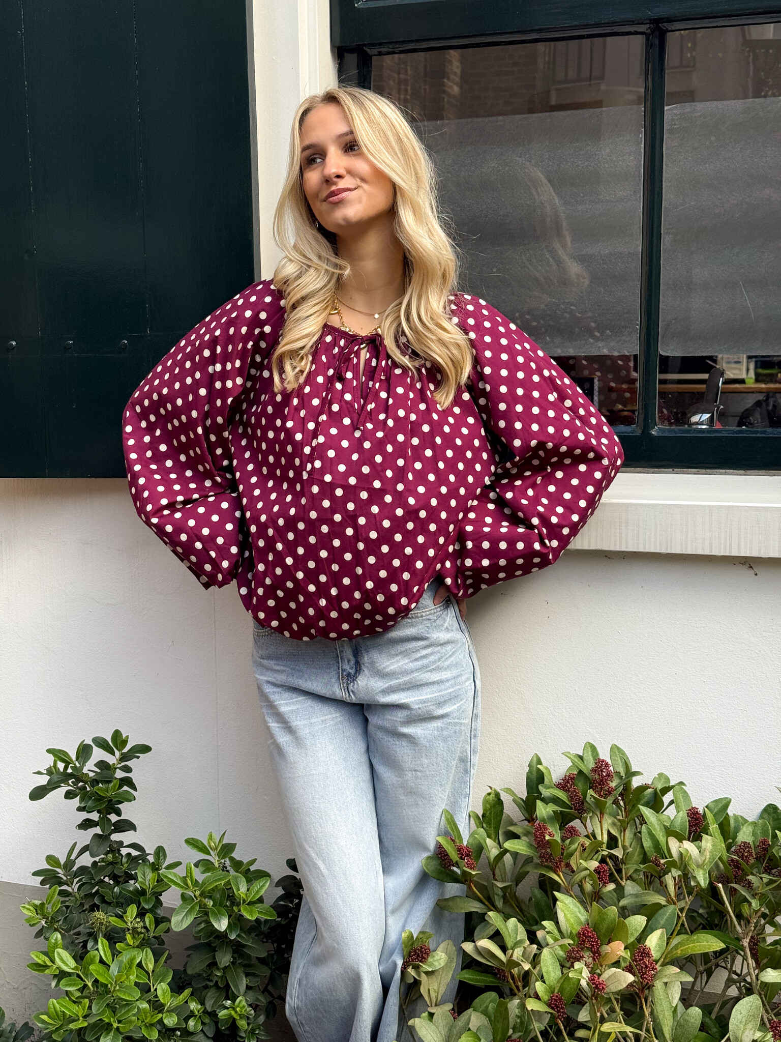 Deze top in Fuchsia kleur met beige polkadots/ witte stippen is een elegante en vrouwelijke toevoeging aan je garderobe. Het getailleerde model en de lange pofmouwen en hoge boothals met strikje geven een speelse uitstraling. Perfect te combineren met een jeans voor een casual look of een rok voor een nettere outfit.