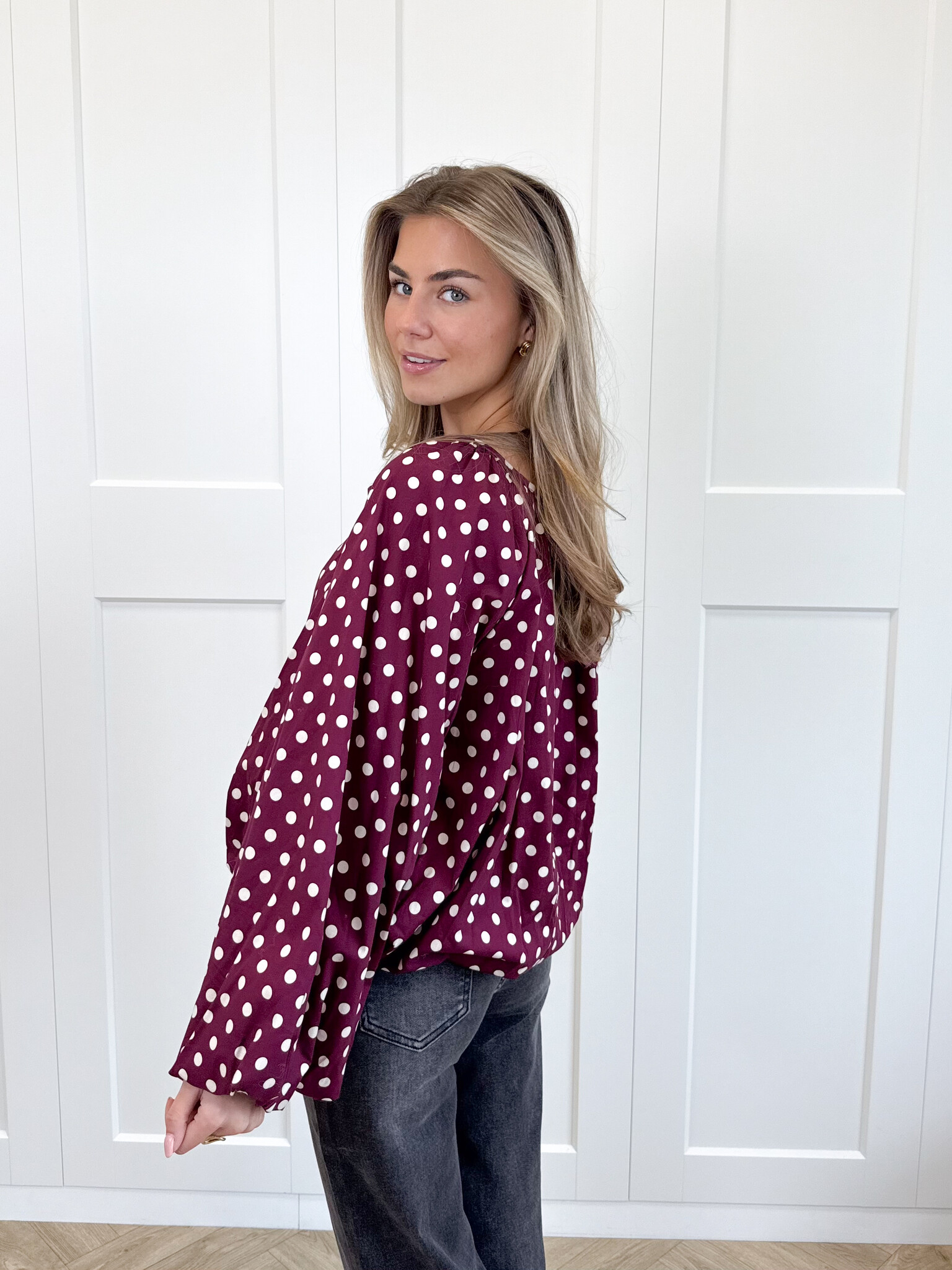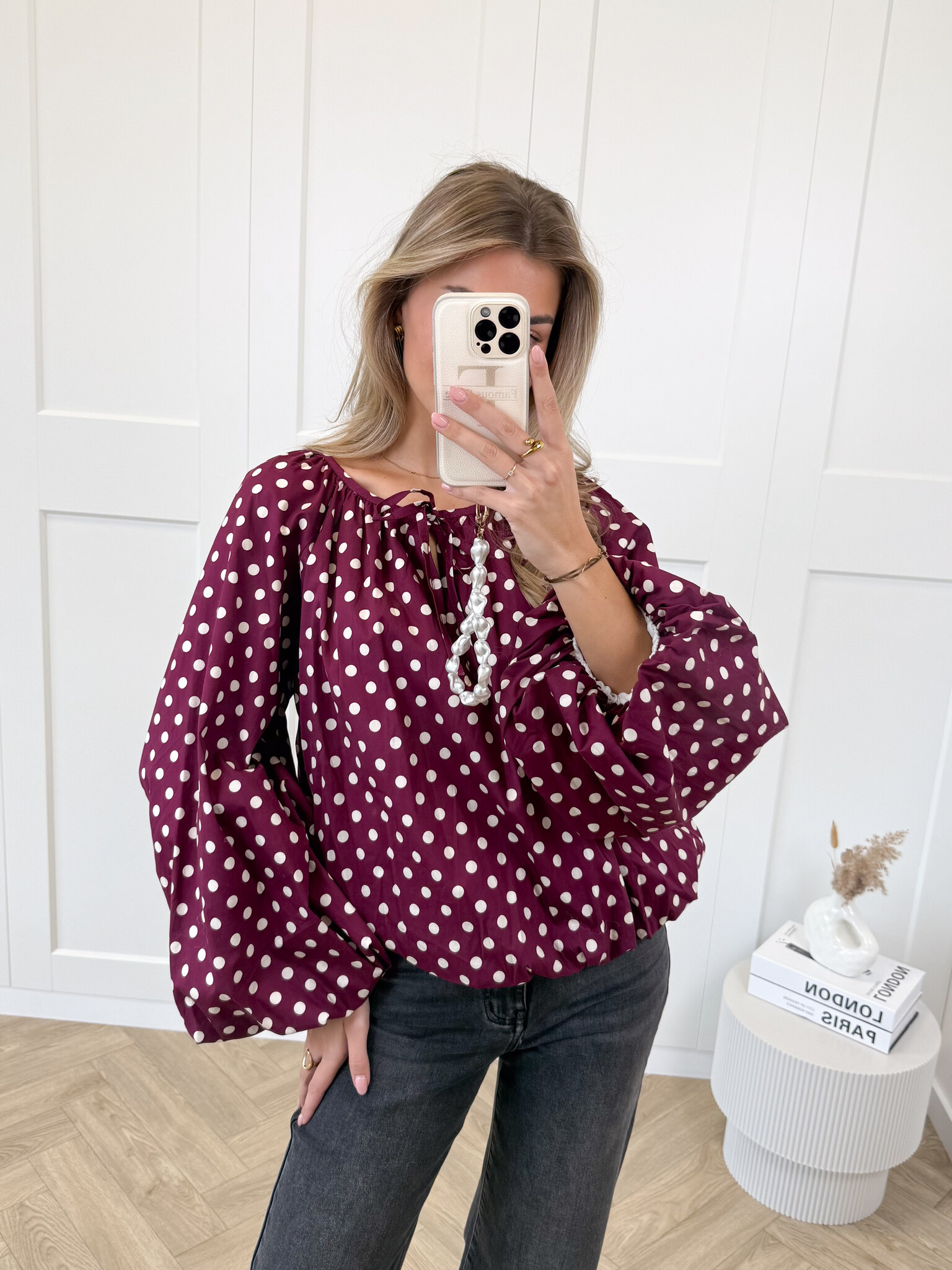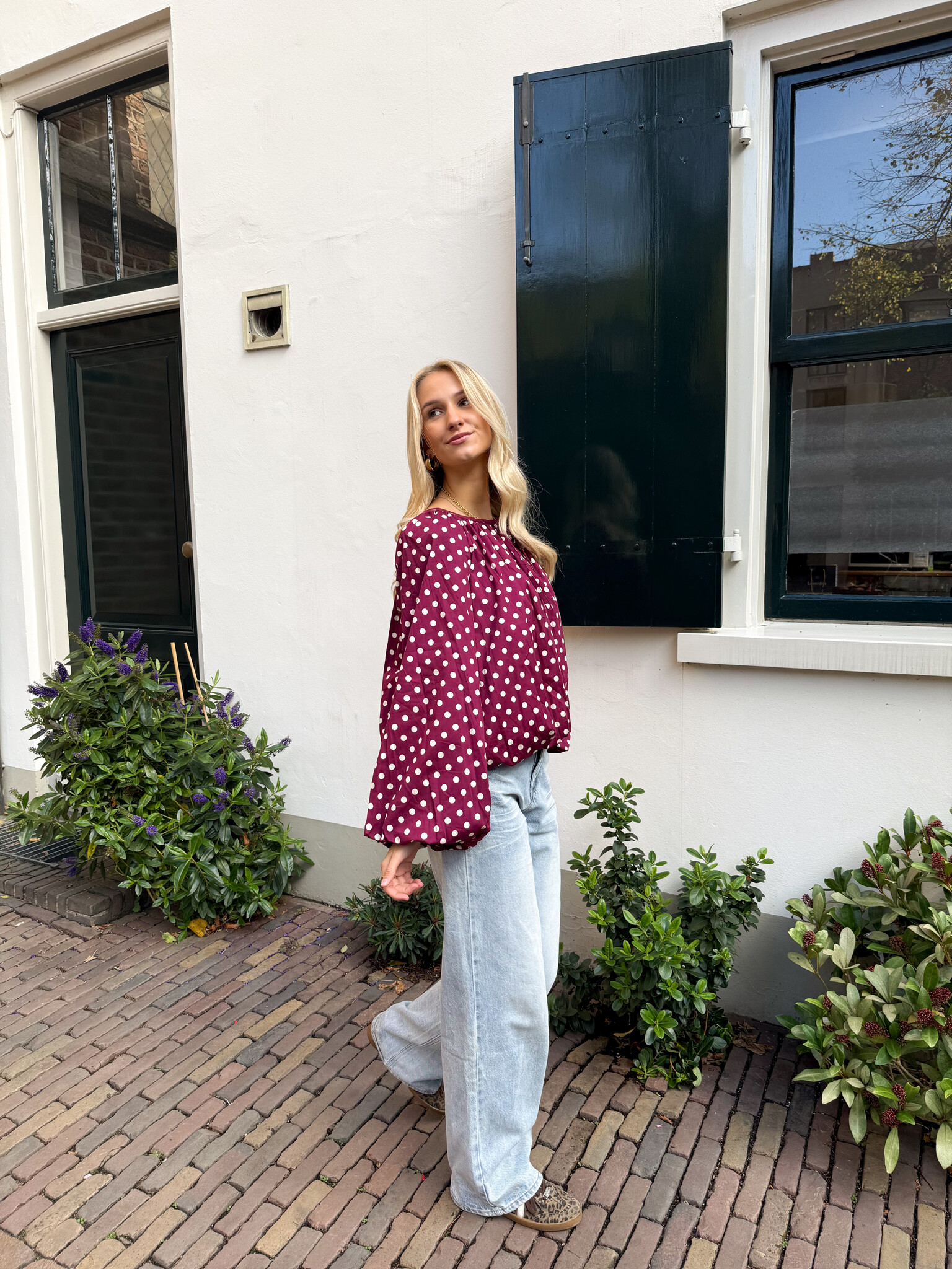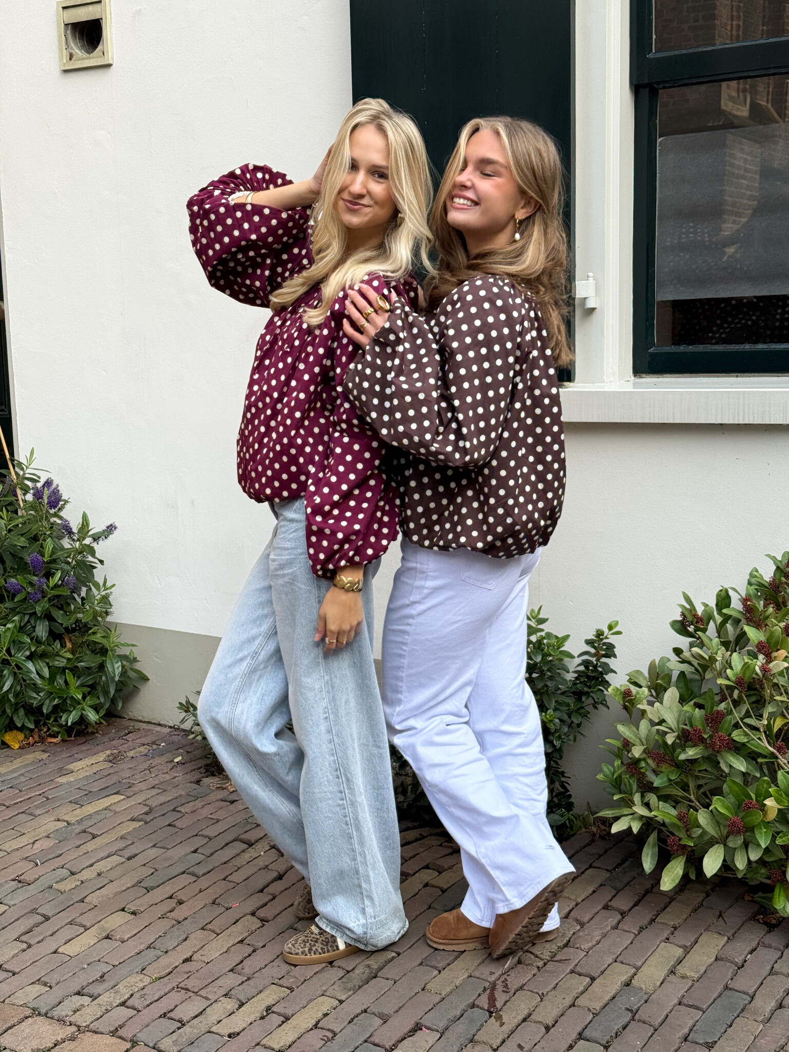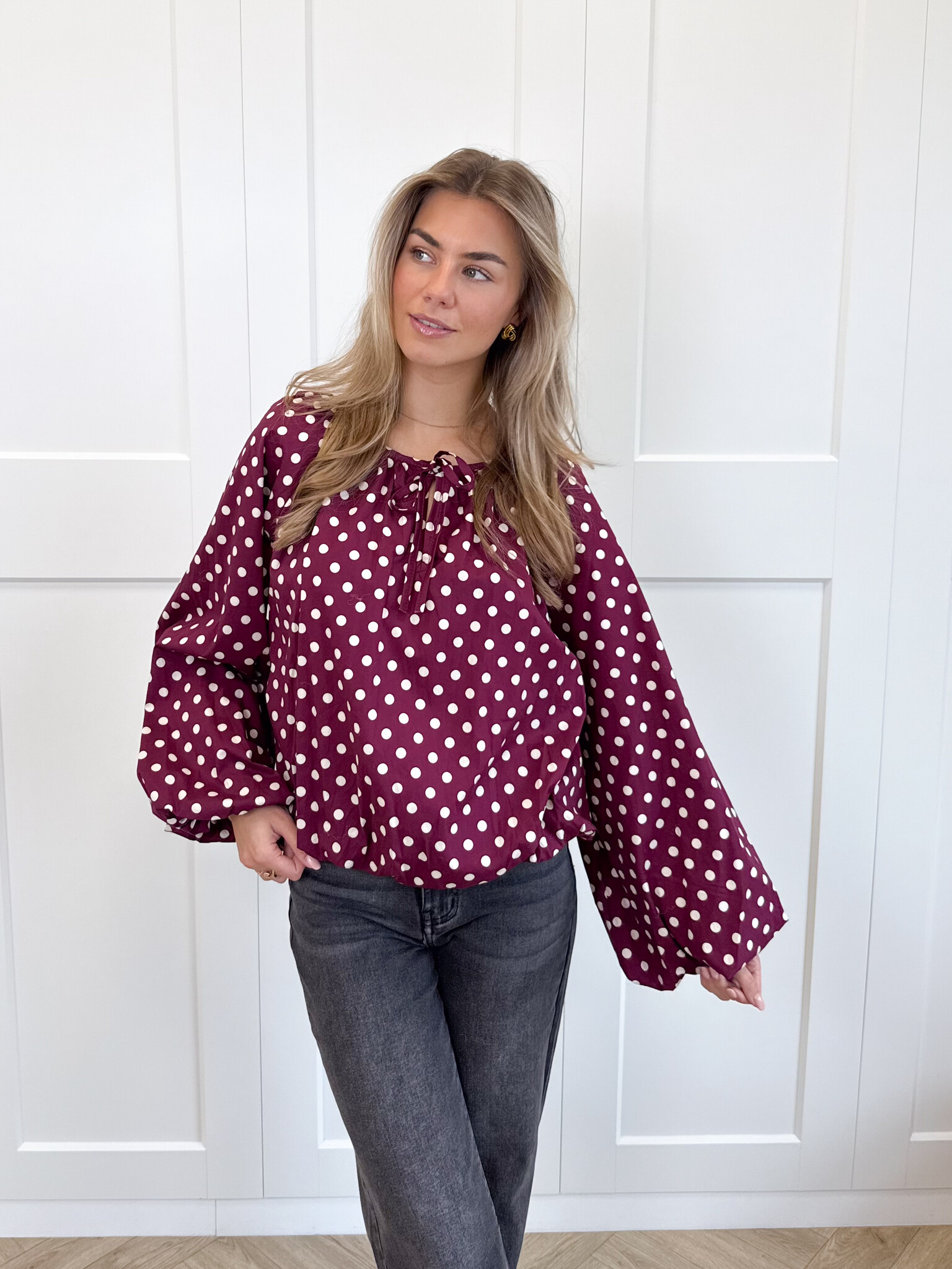 Deze top in Fuchsia kleur met beige polkadots/ witte stippen is een elegante en vrouwelijke toevoeging aan je garderobe. Het getailleerde model en de lange pofmouwen en hoge boothals met strikje geven een speelse uitstraling. Perfect te combineren met een jeans voor een casual look of een rok voor een nettere outfit.