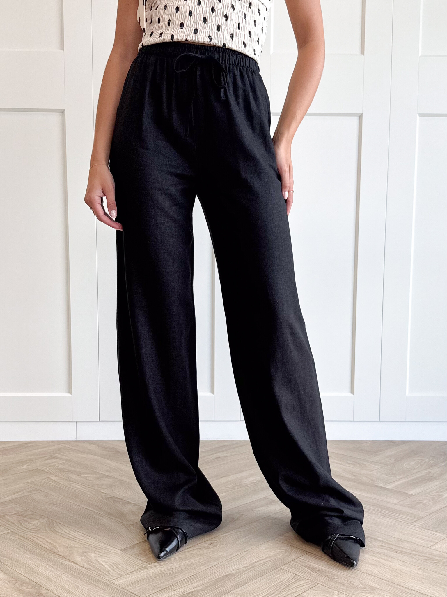 De broek heeft een elastische tailleband met touwtje, zodat je ’m makkelijk op maat draagt én altijd comfy zit. De rechte pijpen en luchtige linnenblend maken hem super geschikt voor warme dagen, city trips, schooldagen of casual chique vibes. En zwart is natuurlijk dé basic die je eindeloos kunt combineren.