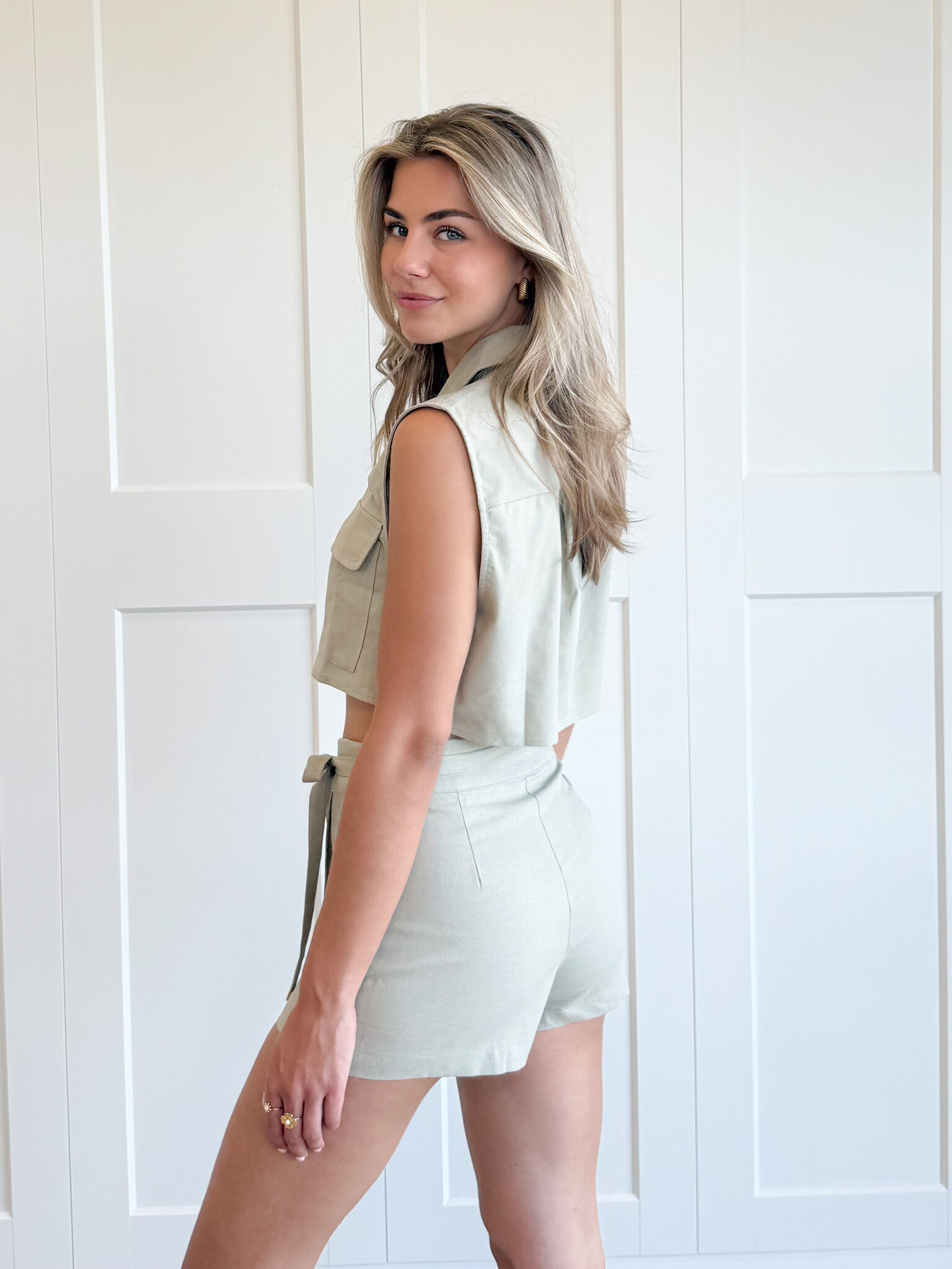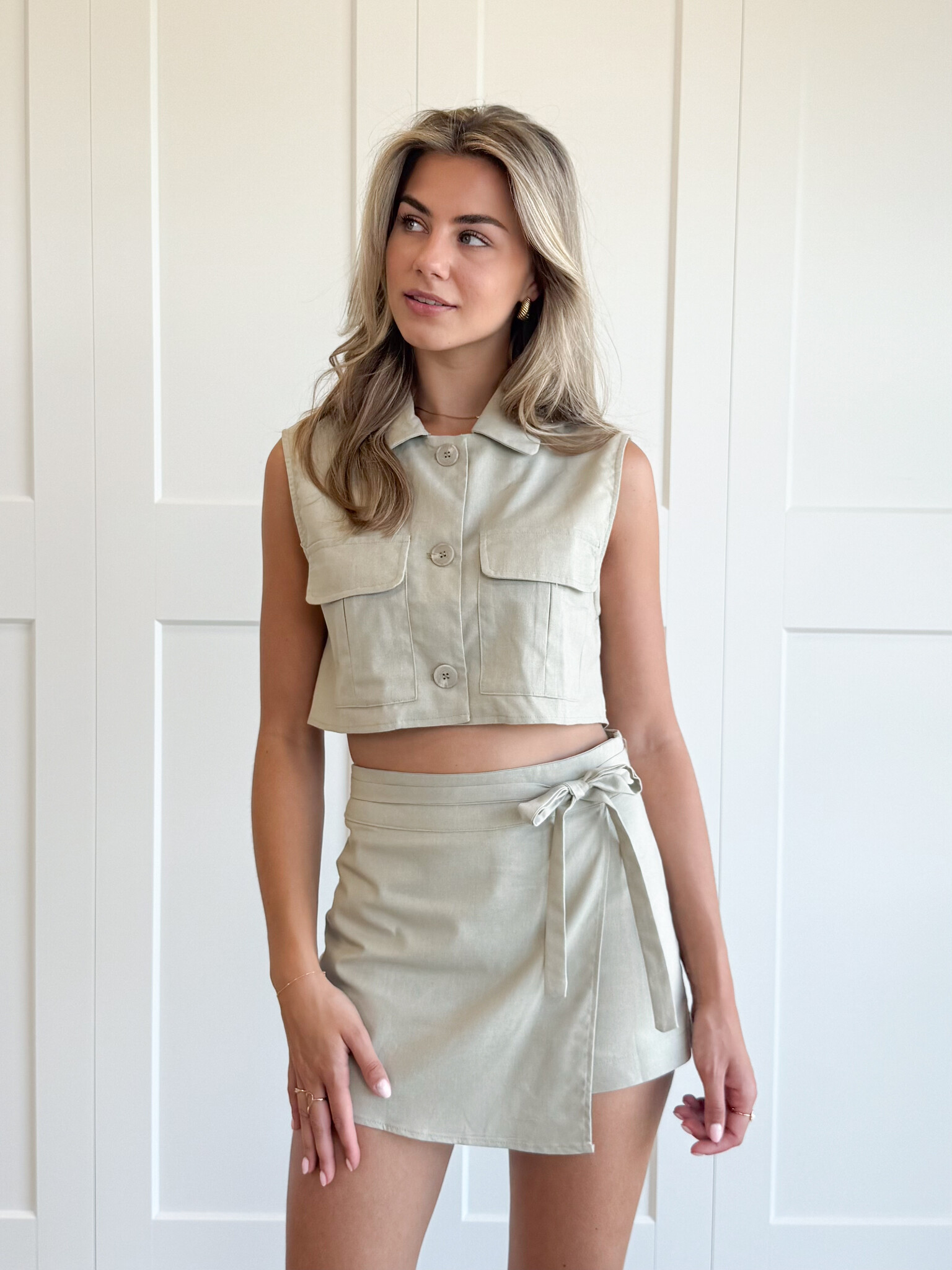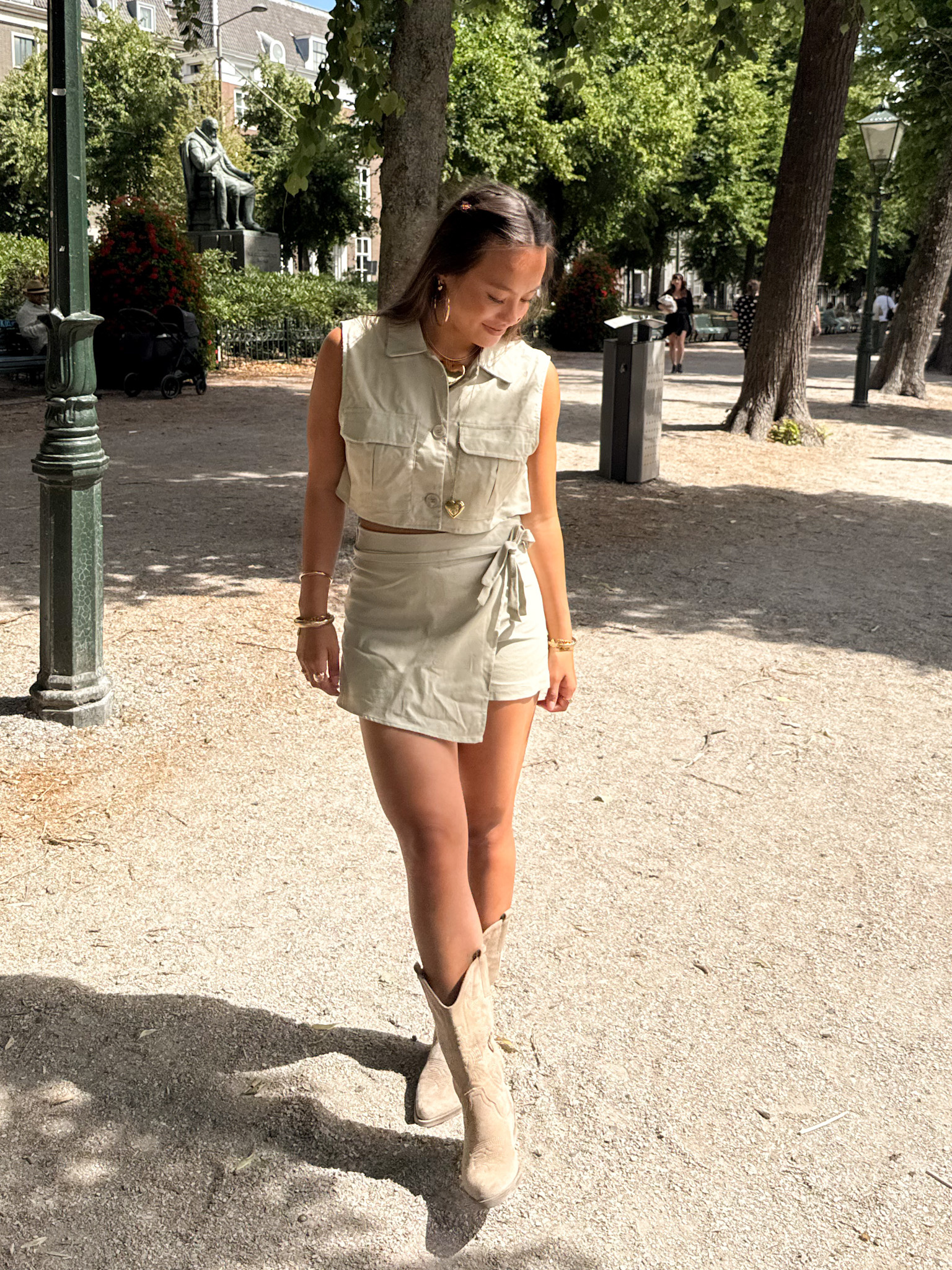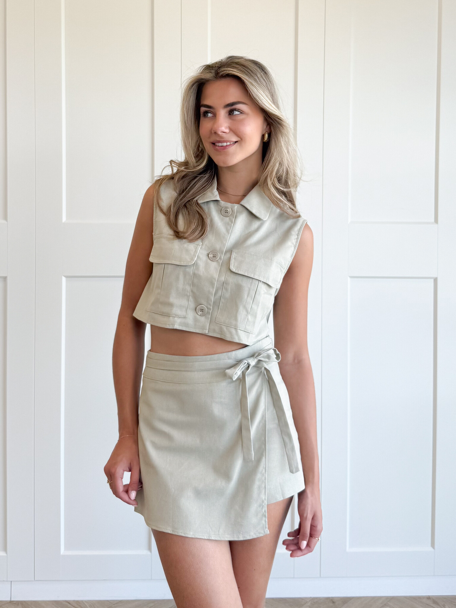 Maar wil je echt punten scoren? Combineer ‘m dan met de bijpassende linnen skort voor een superleuke co-ord set. Perfect voor zomerfestivals, terrasmomenten of gewoon een chill dagje in stijl. Door de neutrale kaki kleur past hij bij bijna alles: van lichte crop tops tot sneakers, sandaaltjes of loafers.De linnen stof maakt deze gilet ideaal voor warme dagen, luchtig, stijlvol en comfortabel tegelijk!