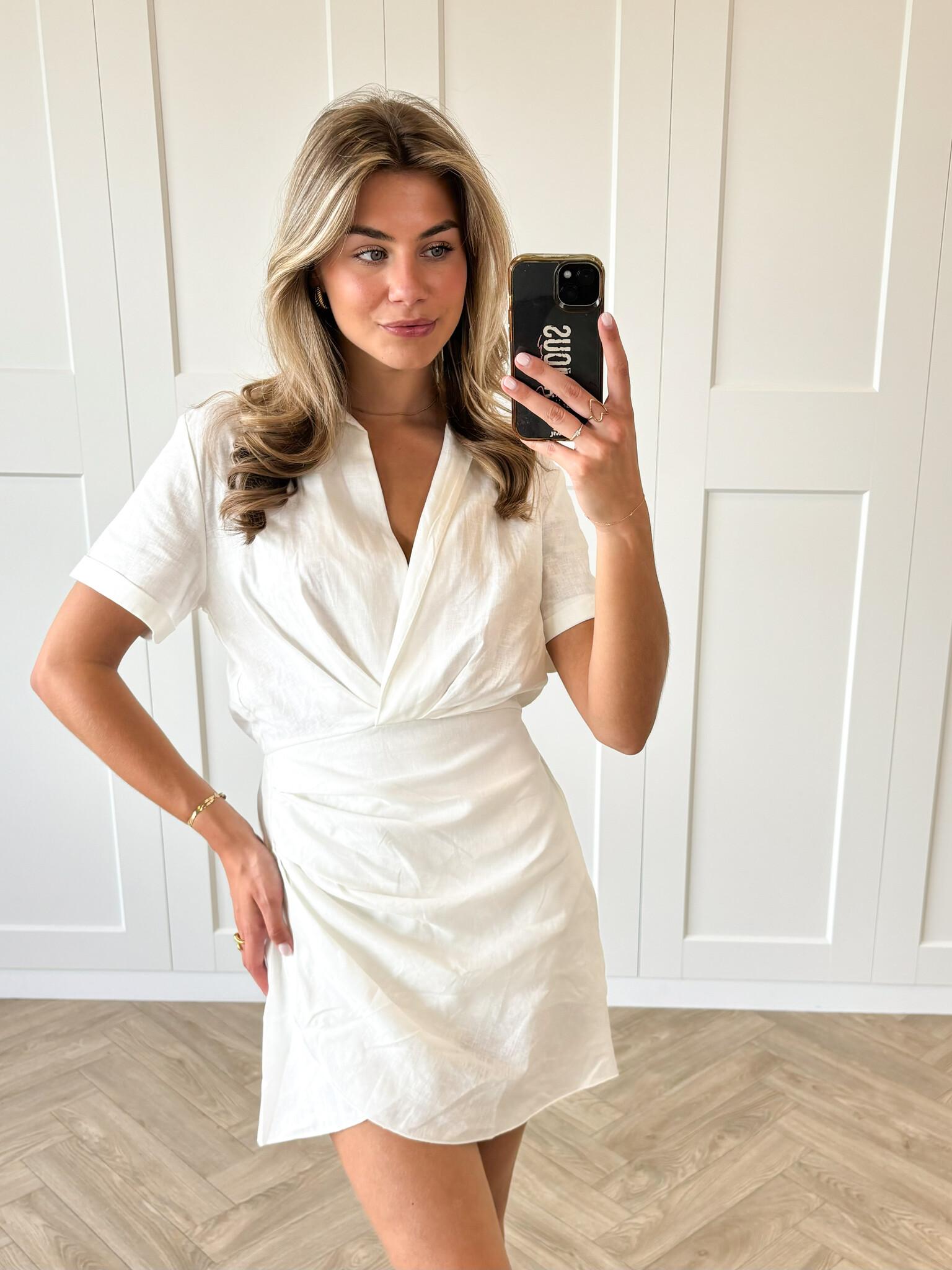 Wauw een echte eyecatcher deze jurk! Dit witte jurkje heeft een elastische band om de taille zodat het jurkje en mooi getailleerd model krijgt. De jurk heeft een kraag, een V-Hals en een geplooid model. Combineer het jurkje met een paar enkellaarsjes of overknee boots and you're good to go!