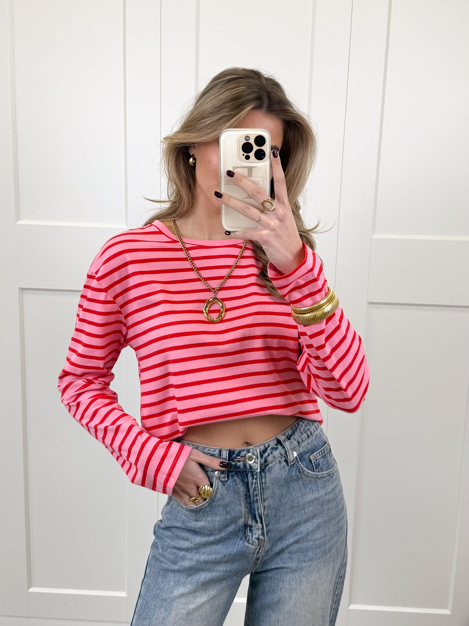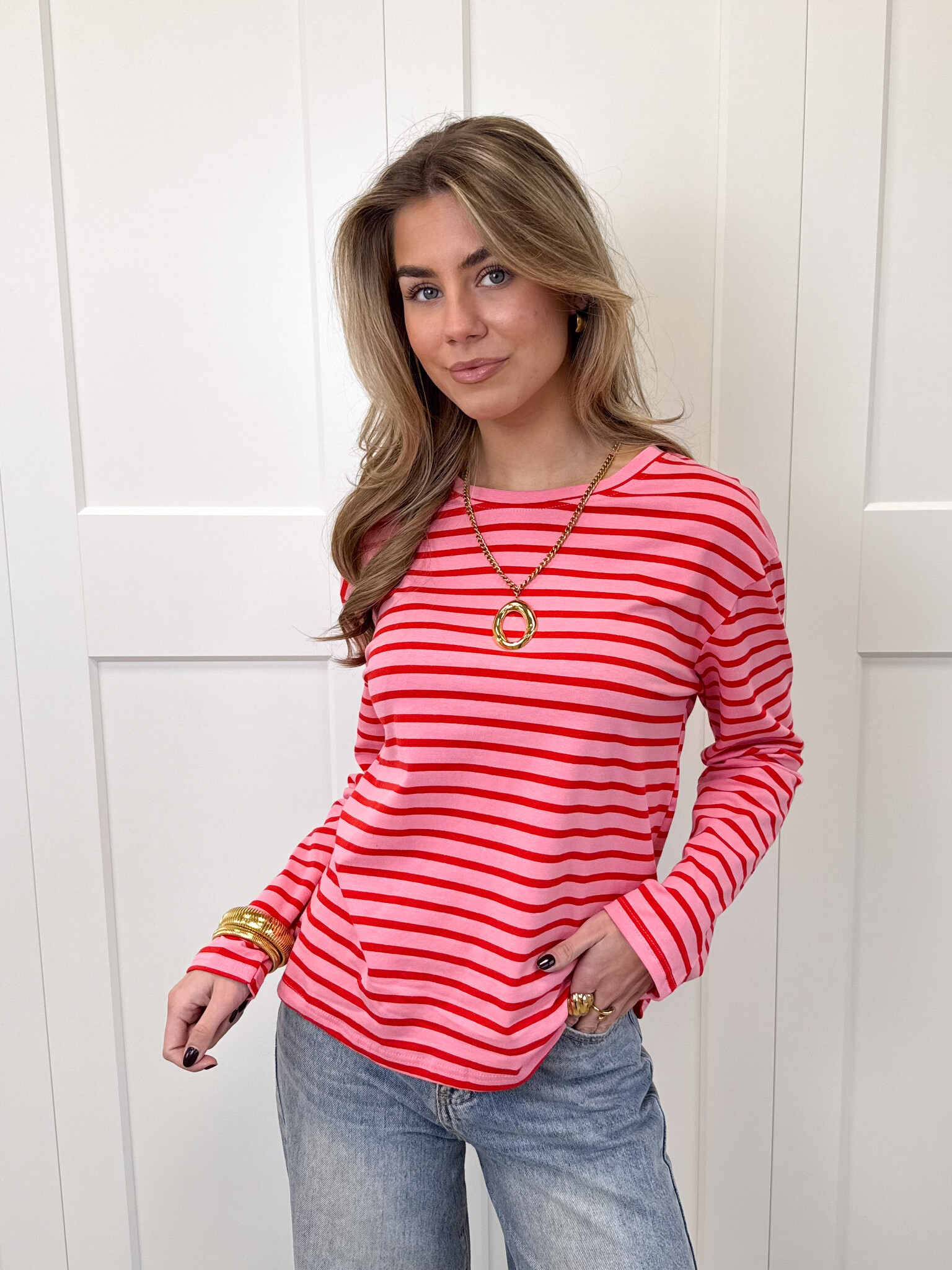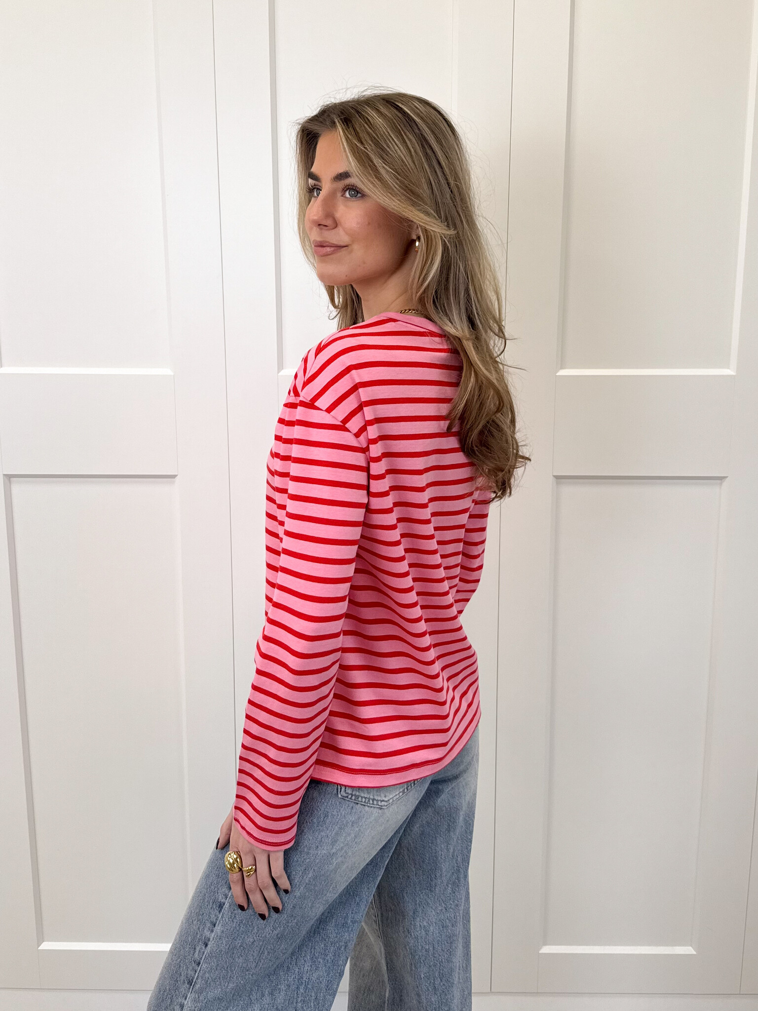 Deze roze longsleeve met rode strepen is een echte eyecatcher voor je girly garderobe. De frisse kleurencombinatie geeft de top een speelse en trendy uitstraling, terwijl het model heerlijk comfortabel zit en perfect is voor elke dag. De lange mouwen maken ‘m ideaal voor wisselende seizoenen en geven je outfit een cozy touch. Combineer met een jeans, rok of pantalon voor een casual maar fashionable look. Perfect voor school, een koffiedate, een dagje shoppen of gewoon wanneer je er moeiteloos stylish uit wilt zien. Deze top laat je stralen met een vrolijke, girly vibe en is eindeloos te stylen.