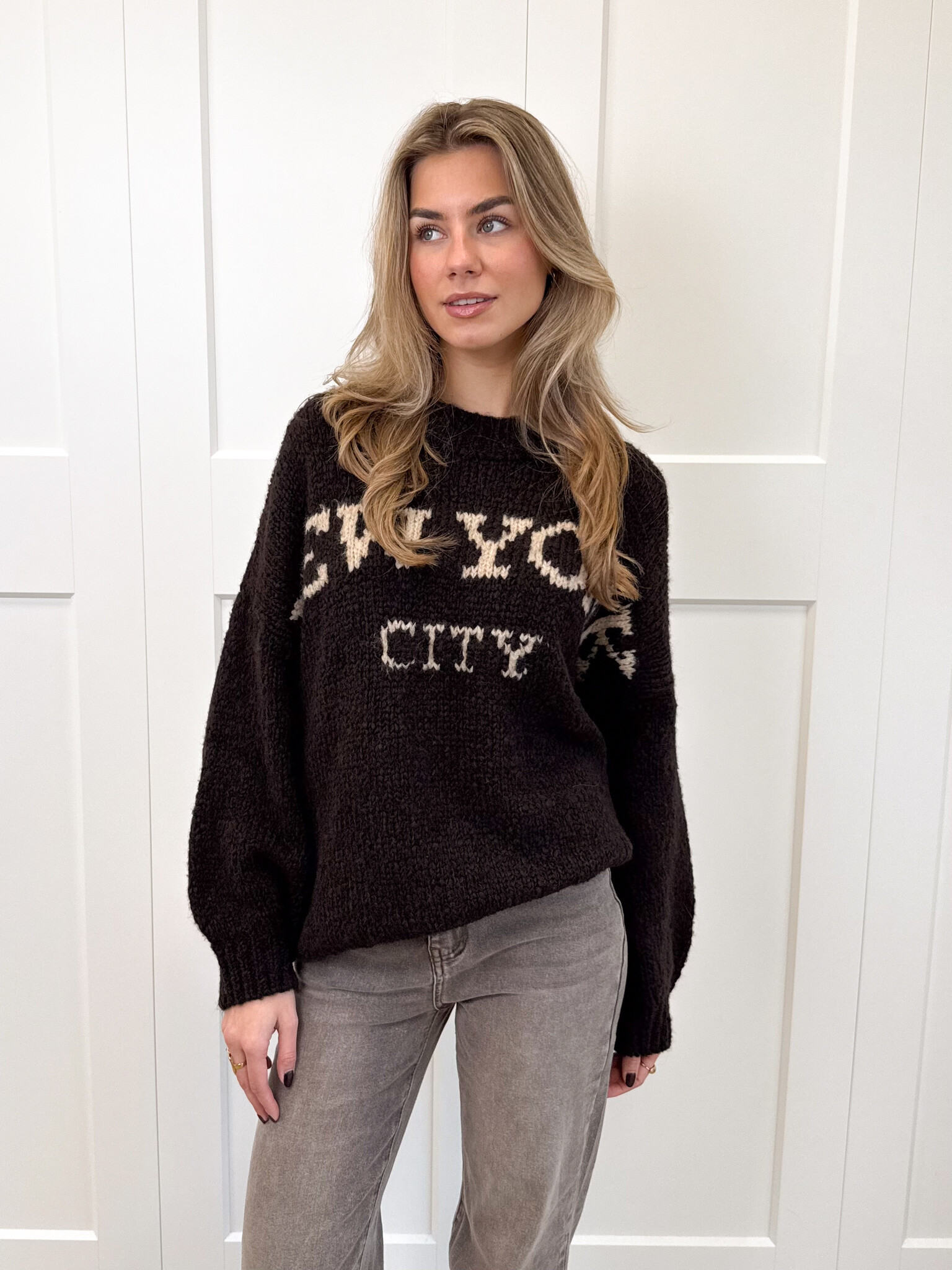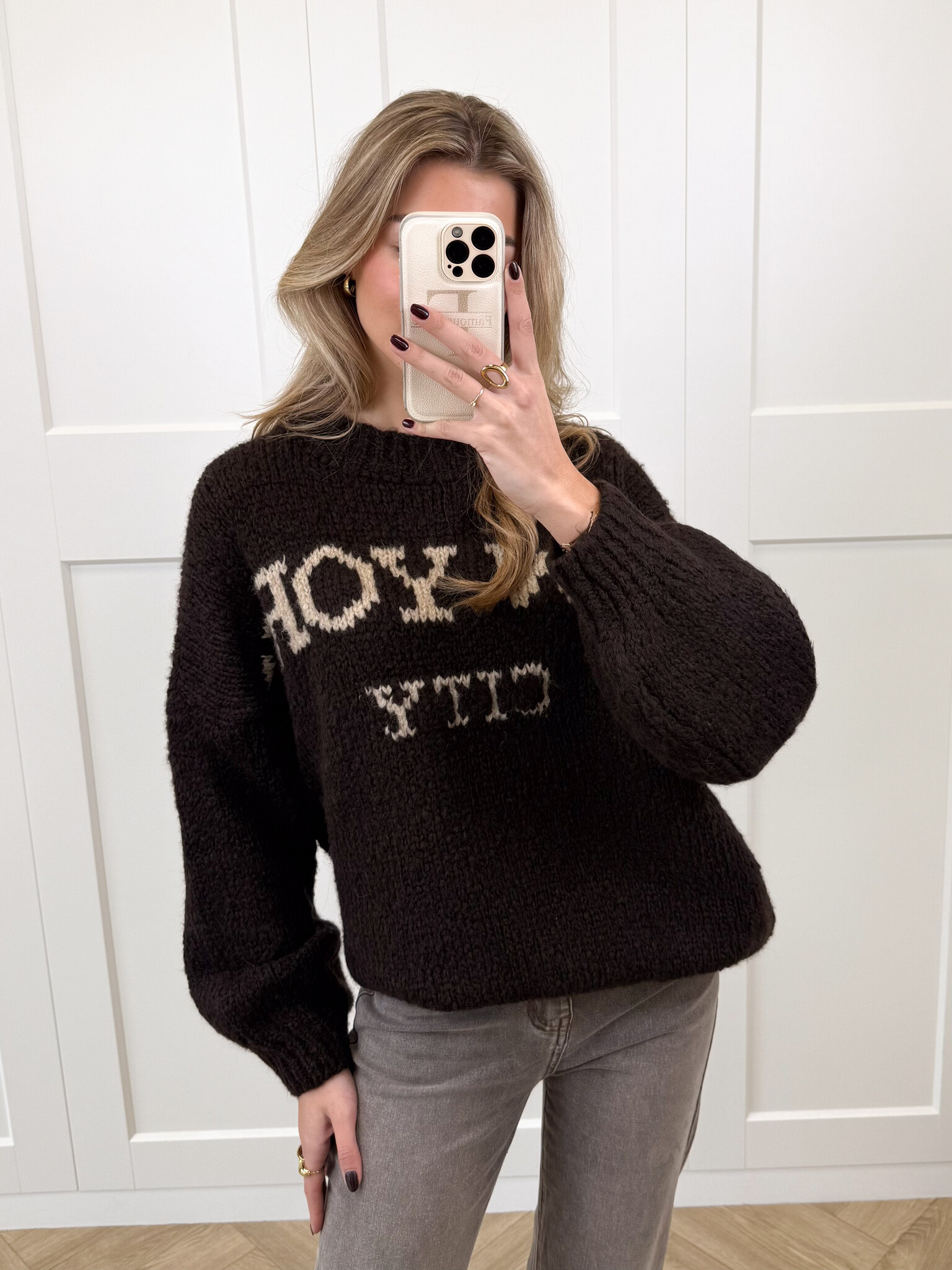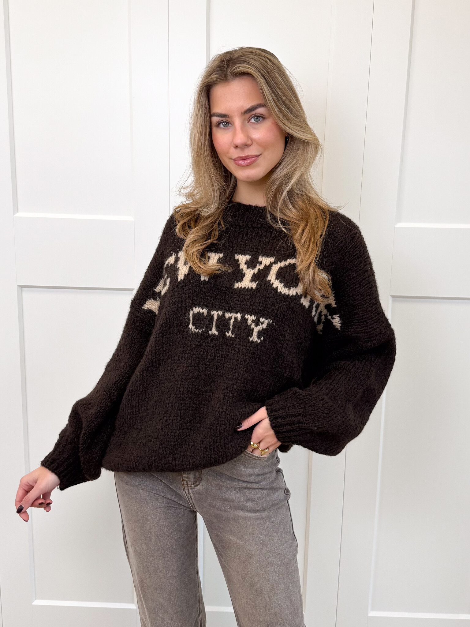 Deze bruine oversized trui is dé knit die je overal bij draagt. De zachte stof voelt warm en comfy aan, terwijl de hoge hals perfect istegen koude dagen. De coffeekleurige “New York City” letters geven de trui een trendy, urban touch alsof je zo door Manhattan wandelt. Dankzij de losse fit valt hij relaxed en effortless, ideaal voor allerlei outfits: van een casual jeans tot een cute skirt met laarzen. Het knit-materiaal maakt ‘m heerlijk cozy, maar door de city-print voelt hij tegelijk super fashionable. Perfect voor school, werk, een dagje shoppen of een chill coffee date.