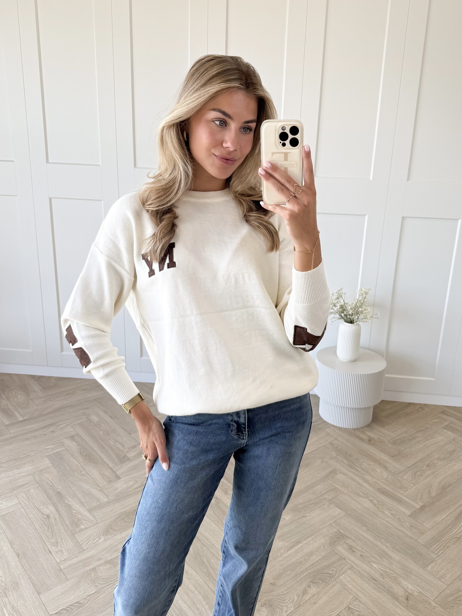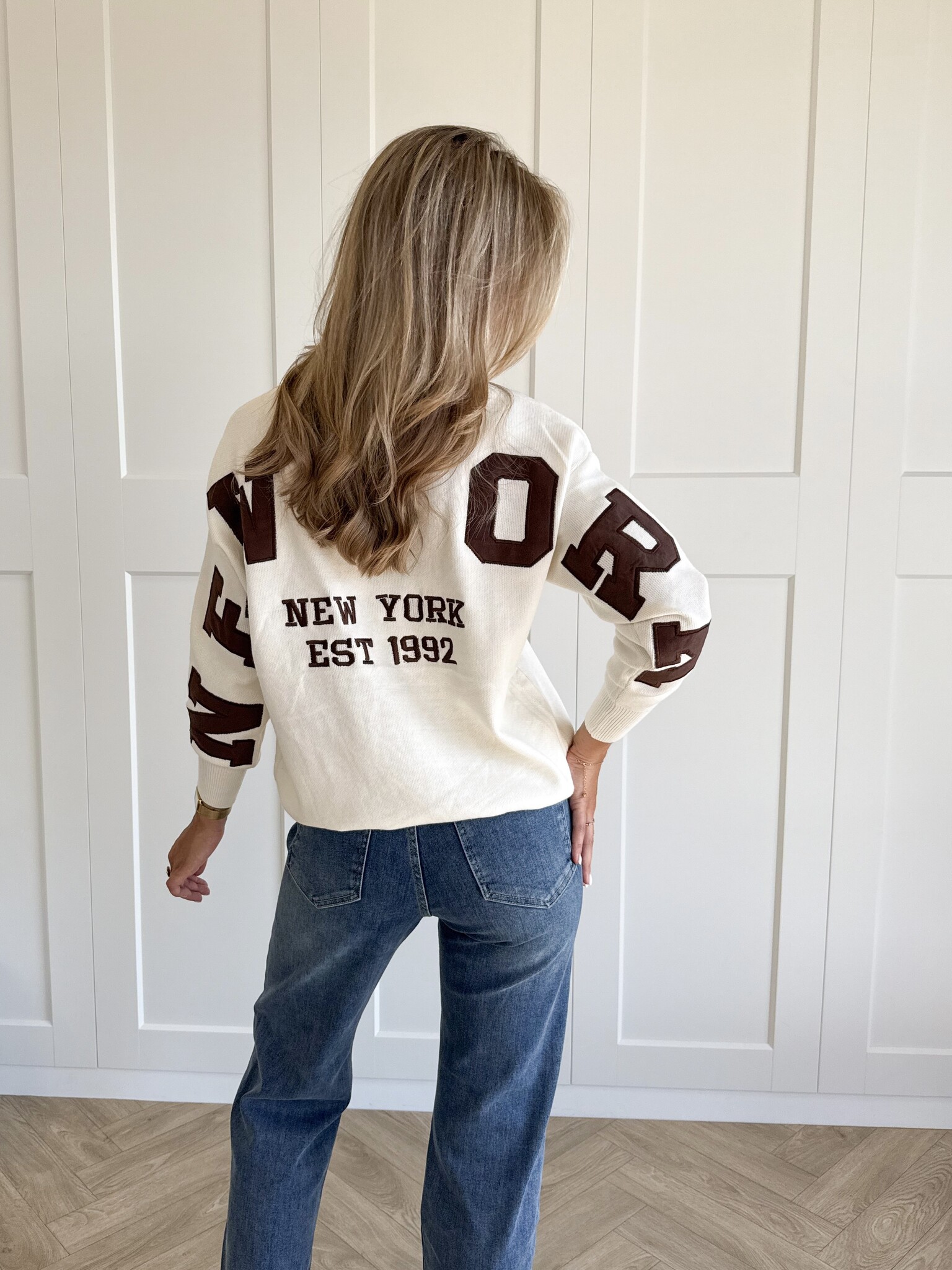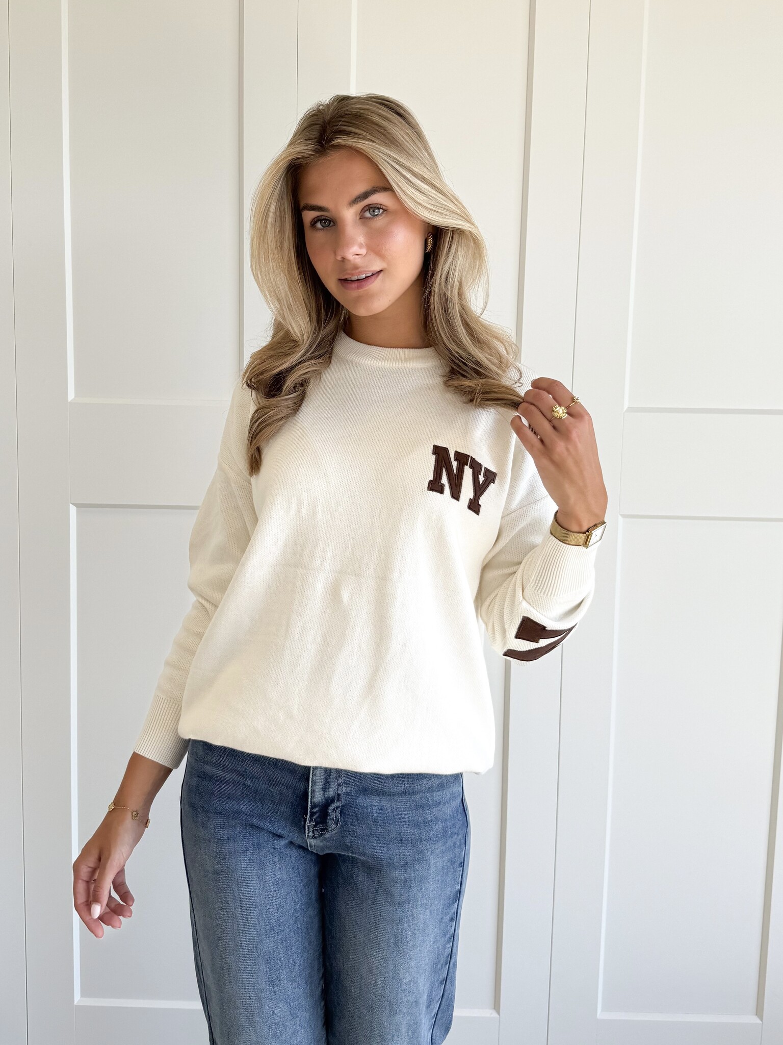 De New York trui is dé knit die je garderobe dit seizoen nodig heeft. Deze oversized beige gebreide trui is afgewerkt met bruine varsity details en een bold "NY" logo op de borst. Op de rug en mouwen staat "New York" groot uitgeschreven. Dankzij de oversized fit is hij super comfortabel. Perfect om je schooldagen, college looks of relaxte weekends een sporty city vibe te geven. Combineer met een jeans of leren broek en jij bent ready to go!