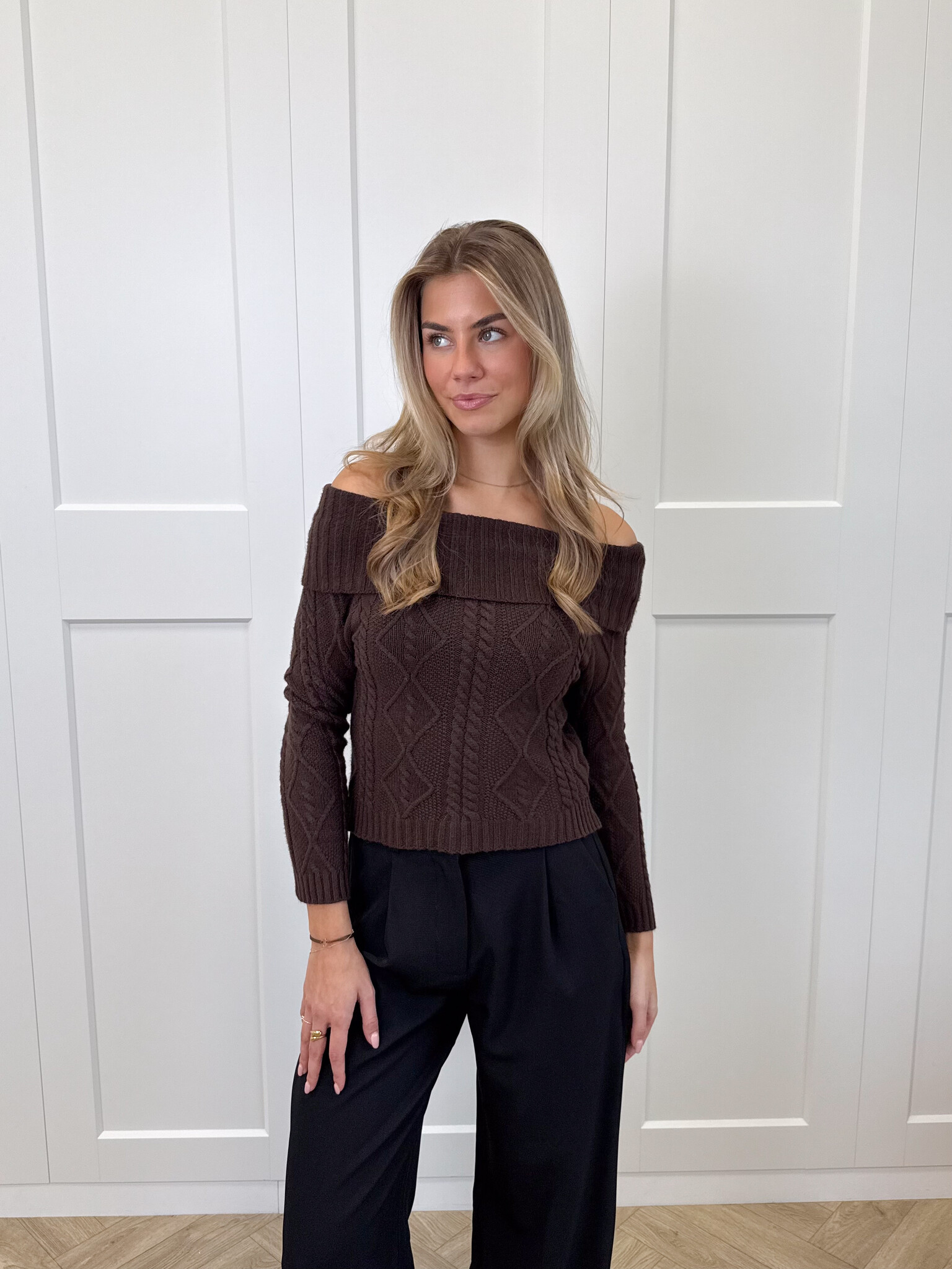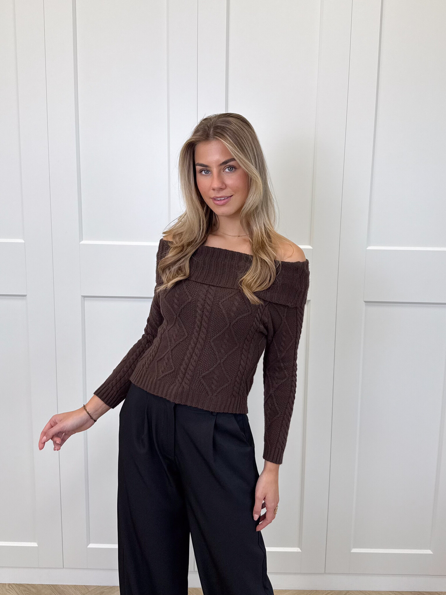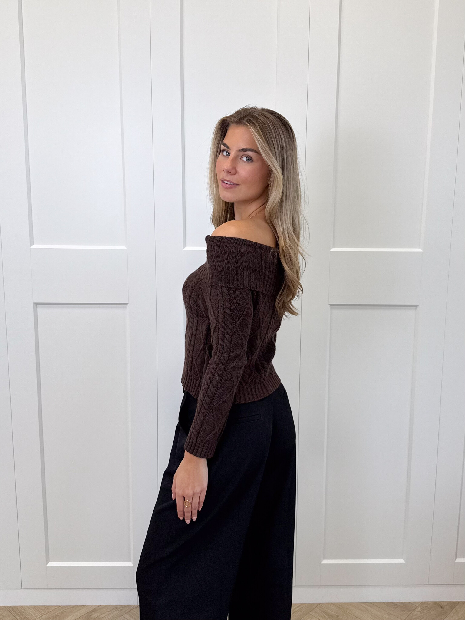 Deze zachte kabeltrui is de perfecte mix van vrouwelijk en cozy. De warme bruine kleur straalt rust en stijl uit, terwijl de offshoulder pasvorm zorgt voor een speelse, flirty touch. De grove kabelstructuur geeft de trui een tijdloze, luxueuze uitstraling en maakt haar ideaal voor de koudere dagen. Dankzij de comfortabele pasvorm met lange mouwen voelt ze heerlijk zacht aan en kun je haar eindeloos combineren.