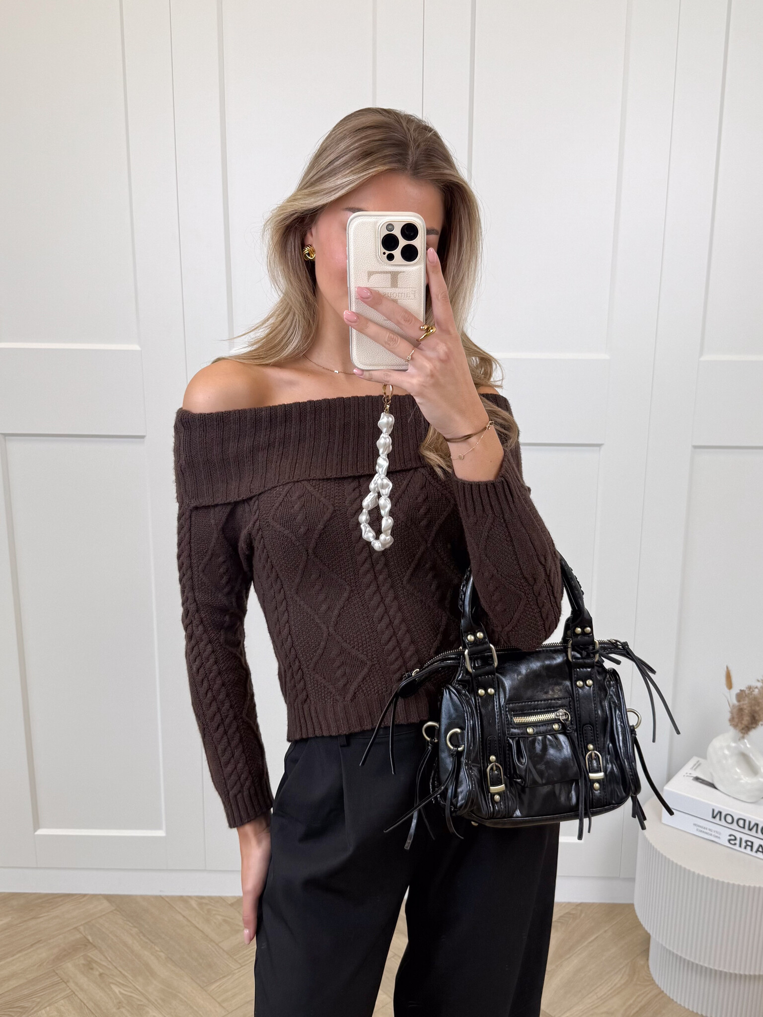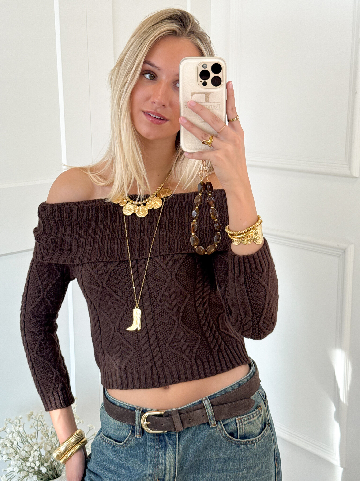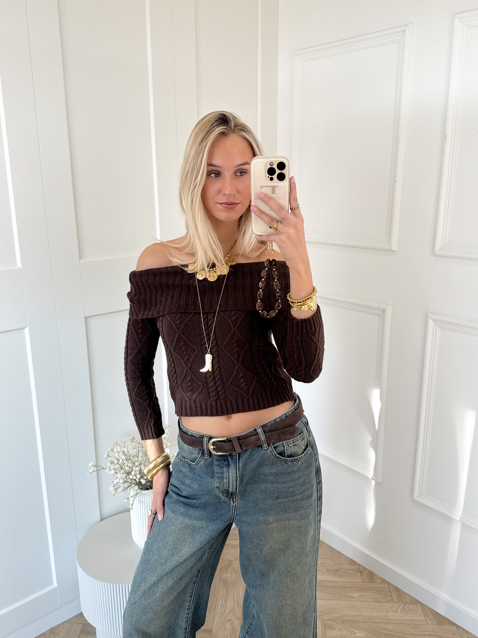 Deze zachte kabeltrui is de perfecte mix van vrouwelijk en cozy. De warme bruine kleur straalt rust en stijl uit, terwijl de offshoulder pasvorm zorgt voor een speelse, flirty touch. De grove kabelstructuur geeft de trui een tijdloze, luxueuze uitstraling en maakt haar ideaal voor de koudere dagen. Dankzij de comfortabele pasvorm met lange mouwen voelt ze heerlijk zacht aan en kun je haar eindeloos combineren.