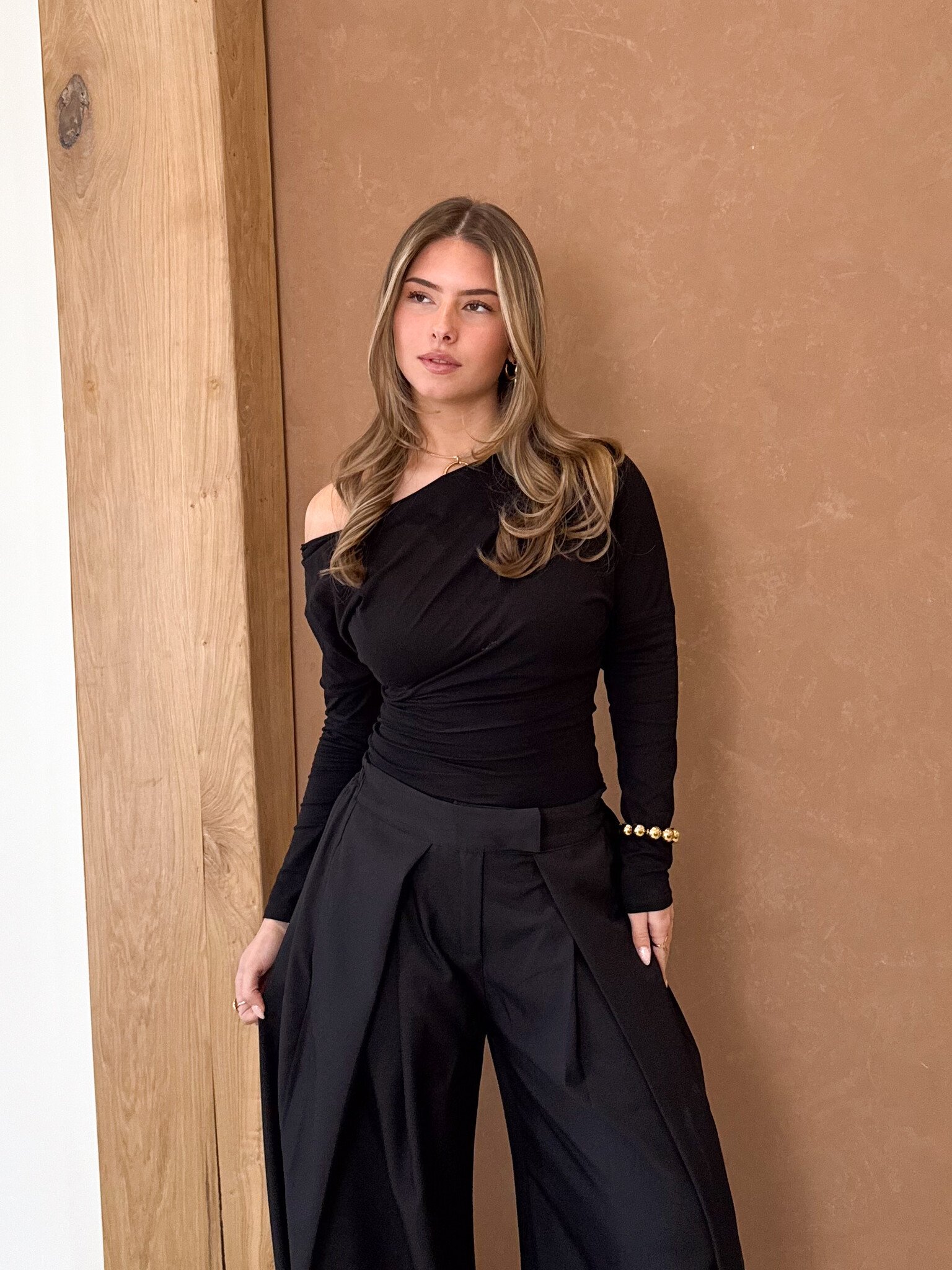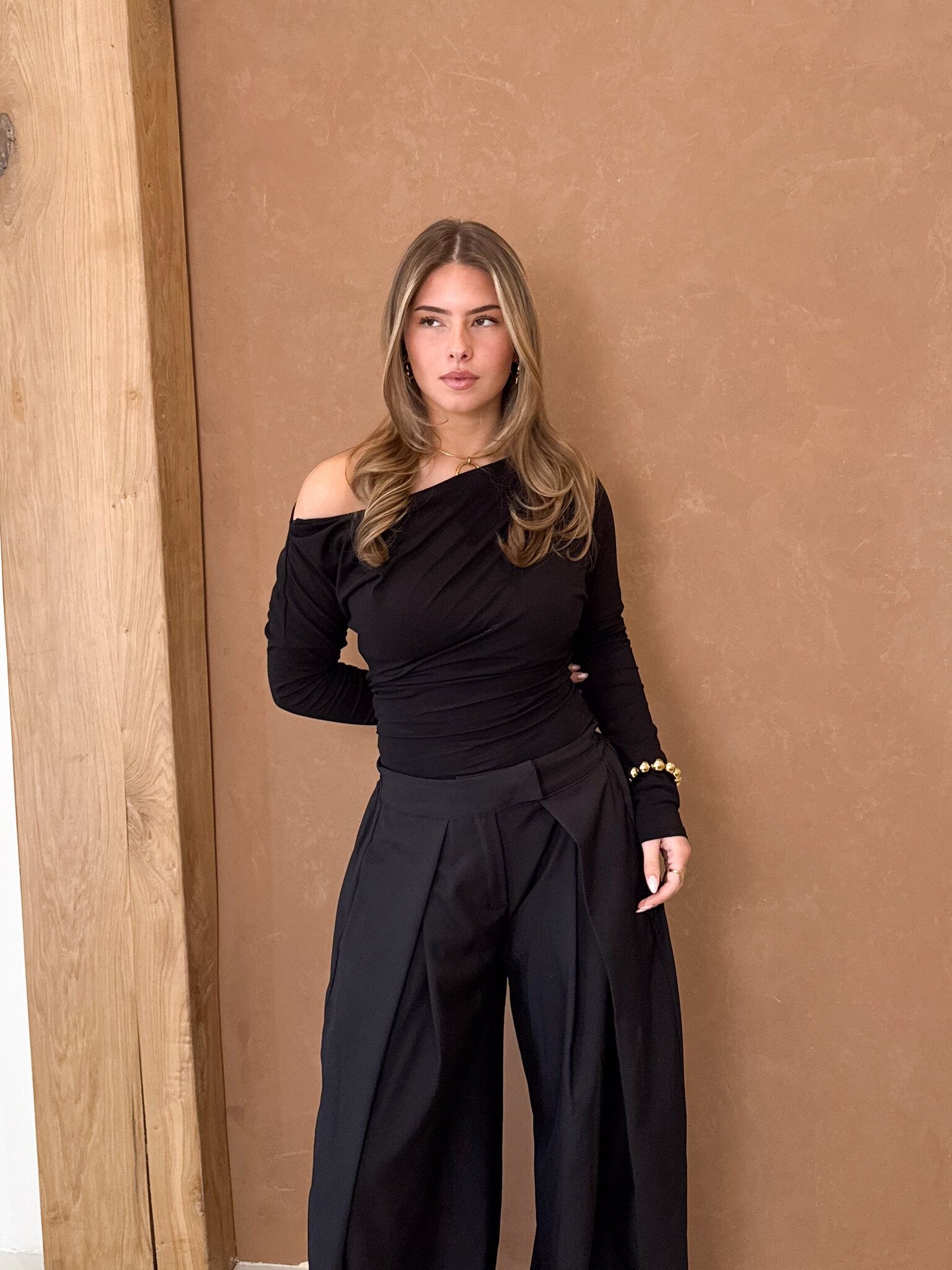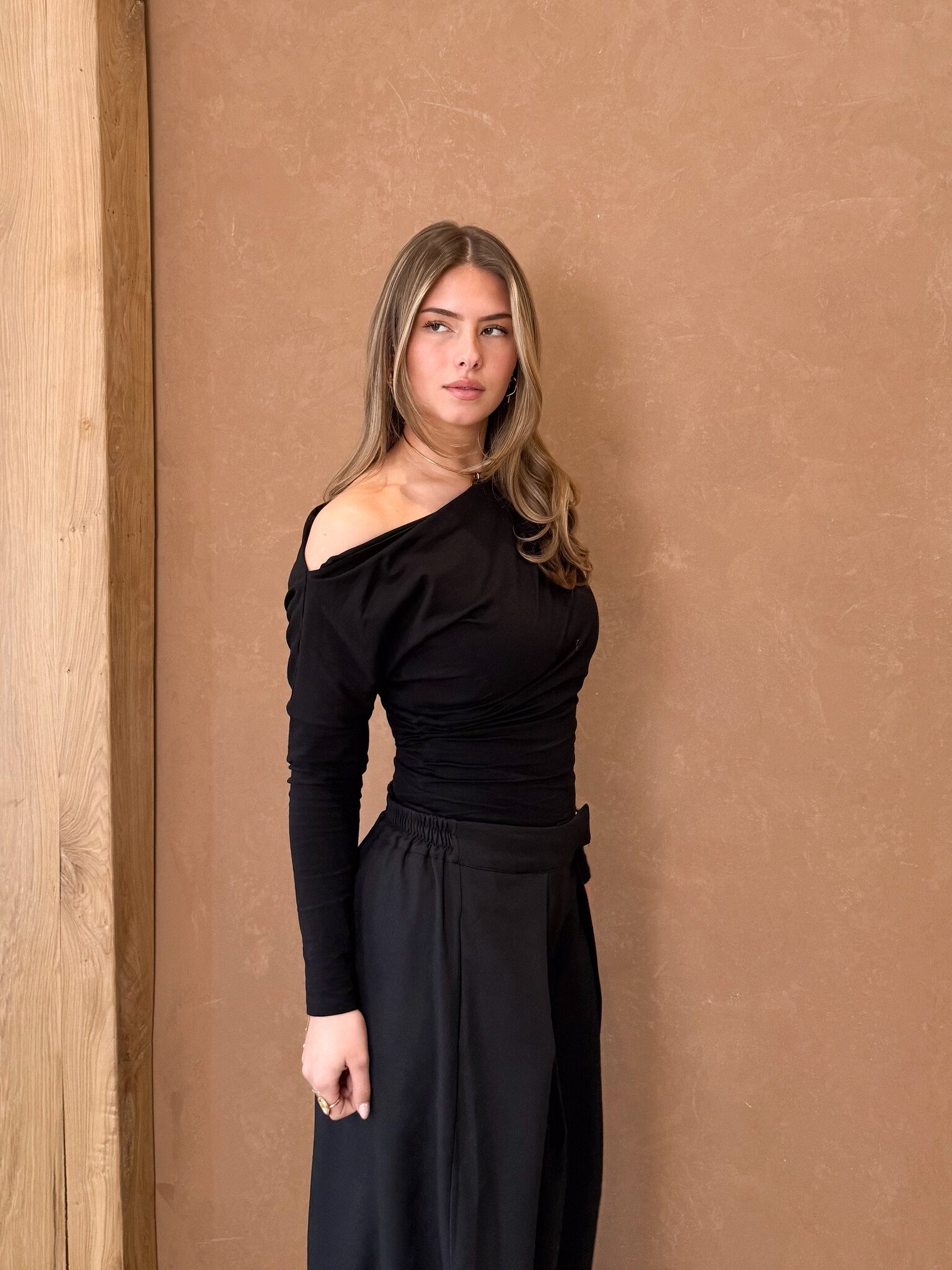 Deze one shoulder top is een echte eyecatcher. Het asymmetrische ontwerp met één lange mouw geeft de top een moderne en stijlvolle uitstraling. De open schouder zorgt voor een subtiel vrouwelijke en trendy look, terwijl de pasvorm mooi aansluit voor een flatterend silhouet. De zachte stof draagt comfortabel en maakt de top perfect voor zowel casual als meer dressed-up outfits. Een stijlvolle top die je outfit meteen een frisse en fashionable touch geeft.