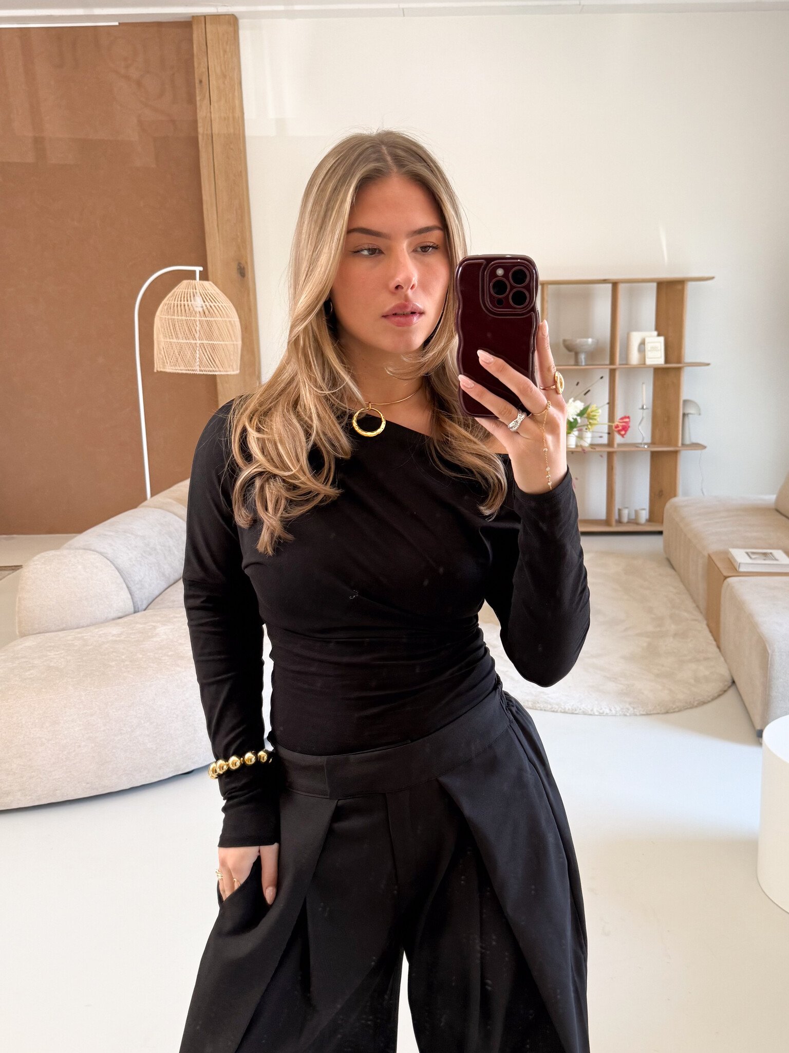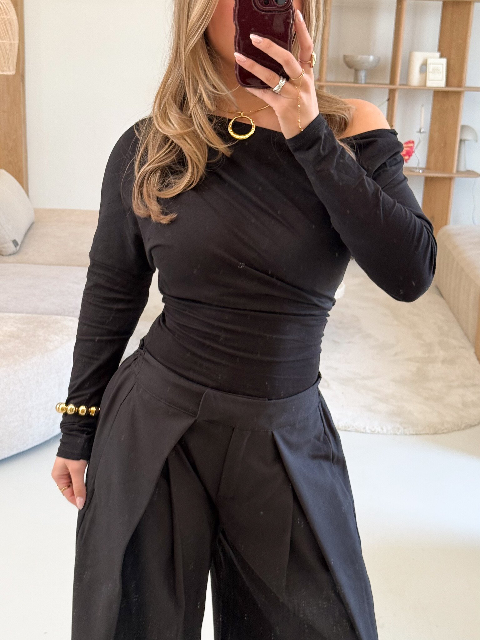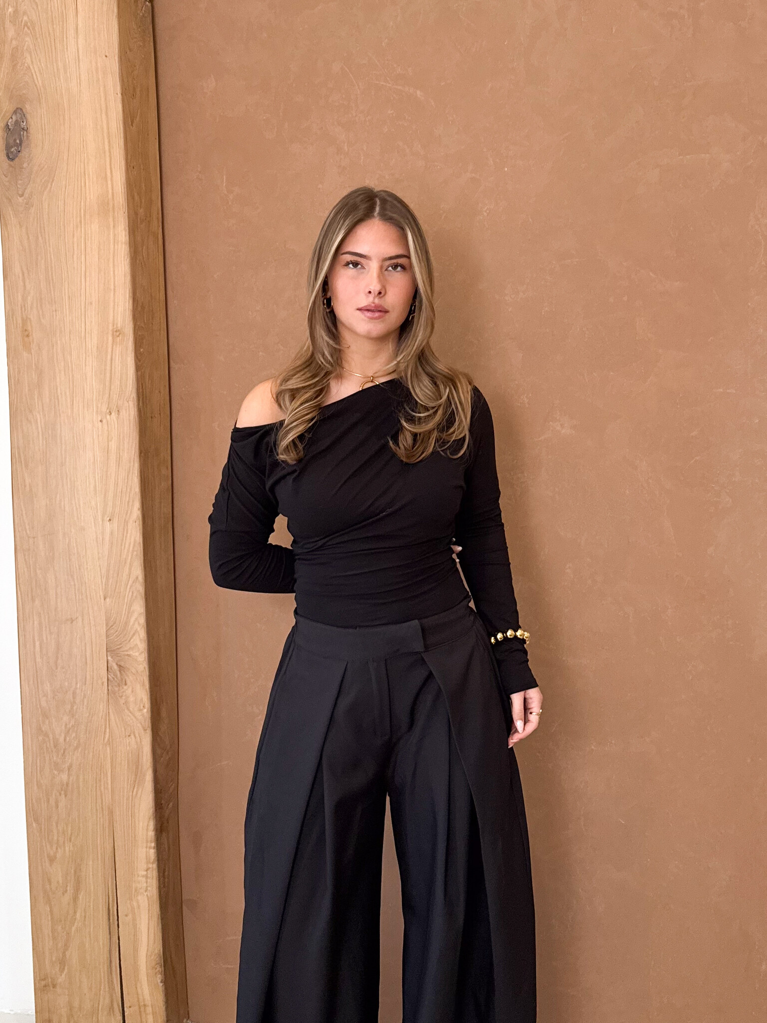 Deze one shoulder top is een echte eyecatcher. Het asymmetrische ontwerp met één lange mouw geeft de top een moderne en stijlvolle uitstraling. De open schouder zorgt voor een subtiel vrouwelijke en trendy look, terwijl de pasvorm mooi aansluit voor een flatterend silhouet. De zachte stof draagt comfortabel en maakt de top perfect voor zowel casual als meer dressed-up outfits. Een stijlvolle top die je outfit meteen een frisse en fashionable touch geeft.