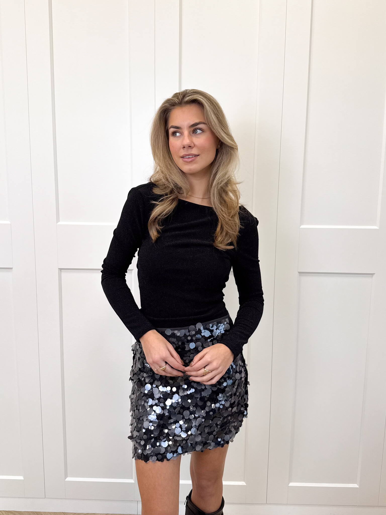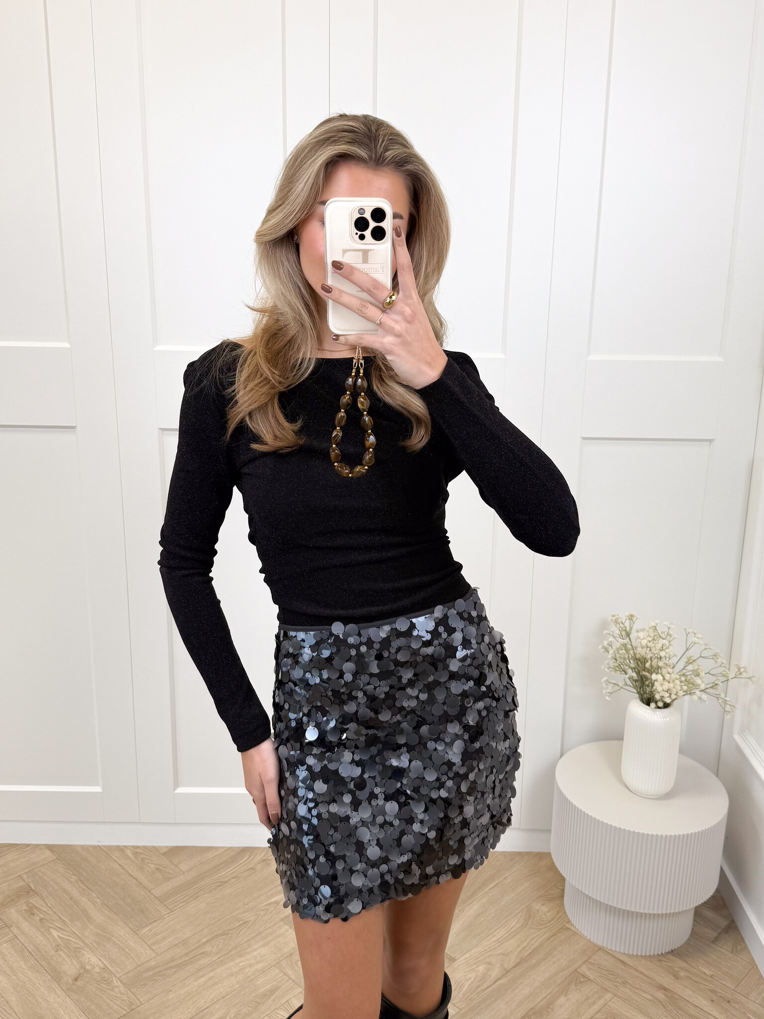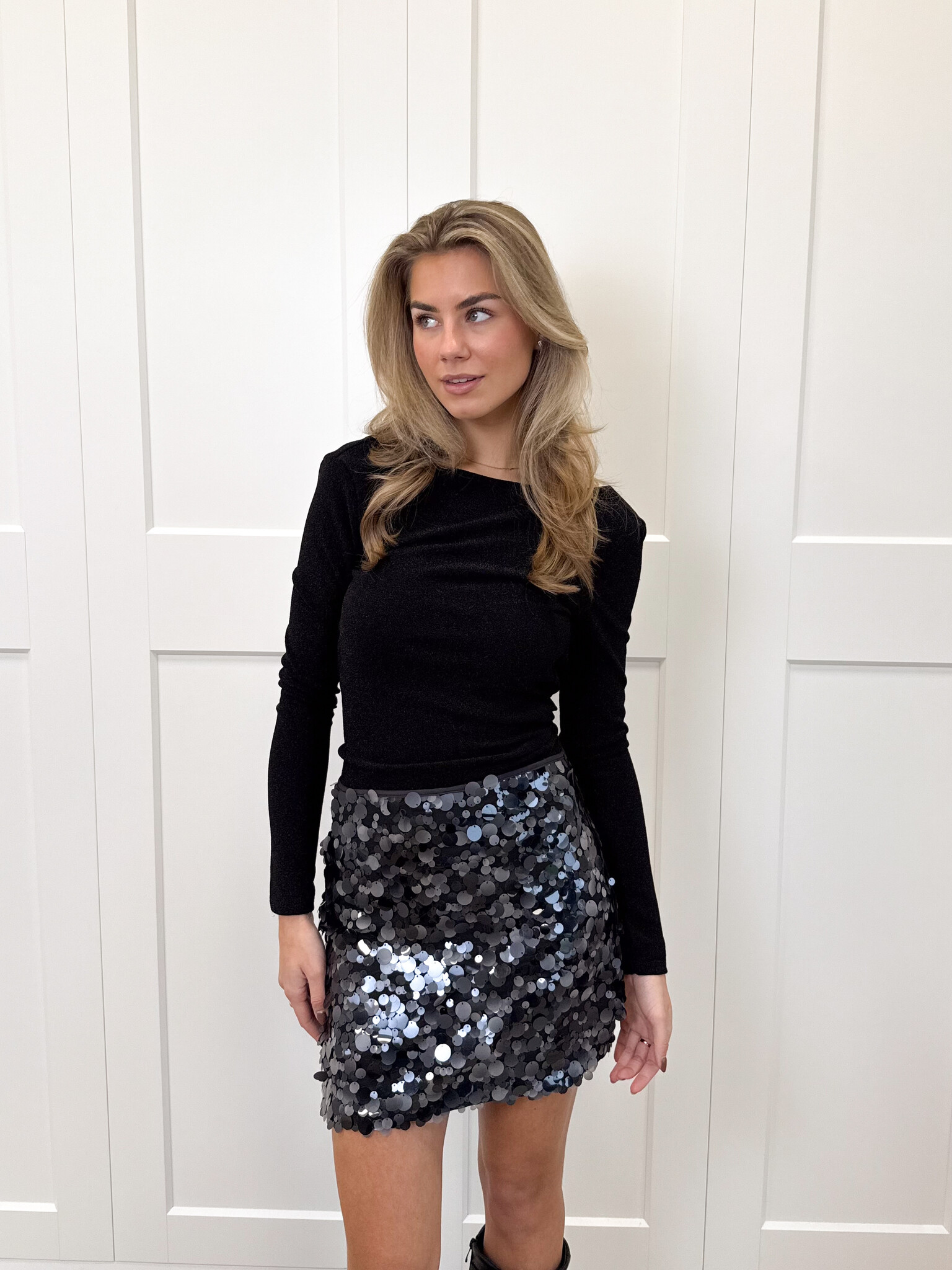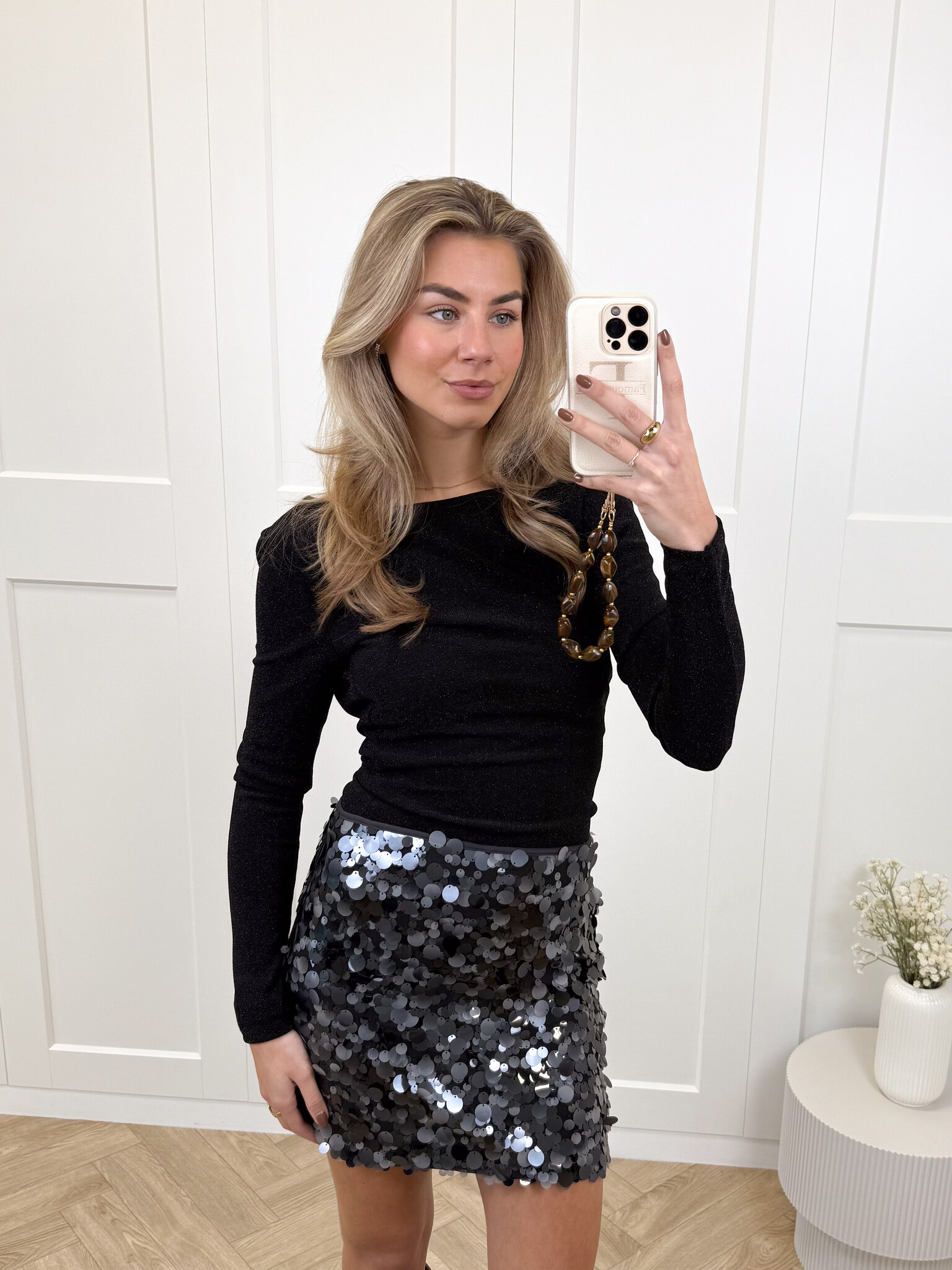 Deze top is een echte must-have voor de party collectie. De subtiele glitter verwerkt in de stof geeft een elegante sparkle die perfect is voor feestdagen, verjaardagen of een avondje uit met vriendinnen. De lange mouwen zorgen voor een classy uitstraling, terwijl de open rug een sexy en vrouwelijke touch toevoegt zonder te overdrijven. Het materiaal voelt zacht en comfortabel aan op de huid, en de pasvorm sluit mooi aan om je silhouet te flatteren. Combineer de top met een glitterrok, een leren broek of een elegante pantalon voor een glam party look. Of je nu danst, dineert of een girls night hebt, deze top zorgt ervoor dat je de spotlight steelt met subtiele maar onweerstaanbare glamour.