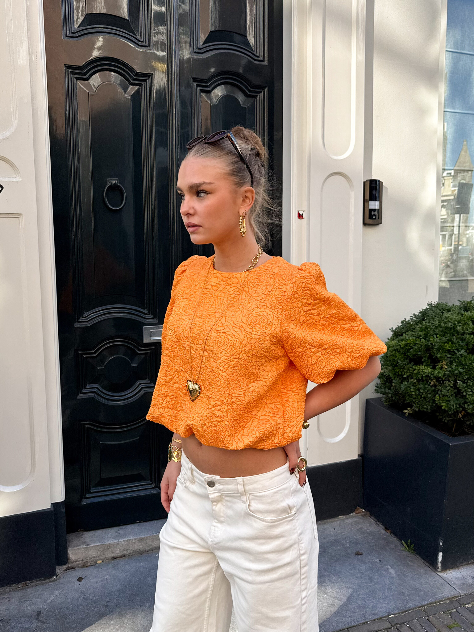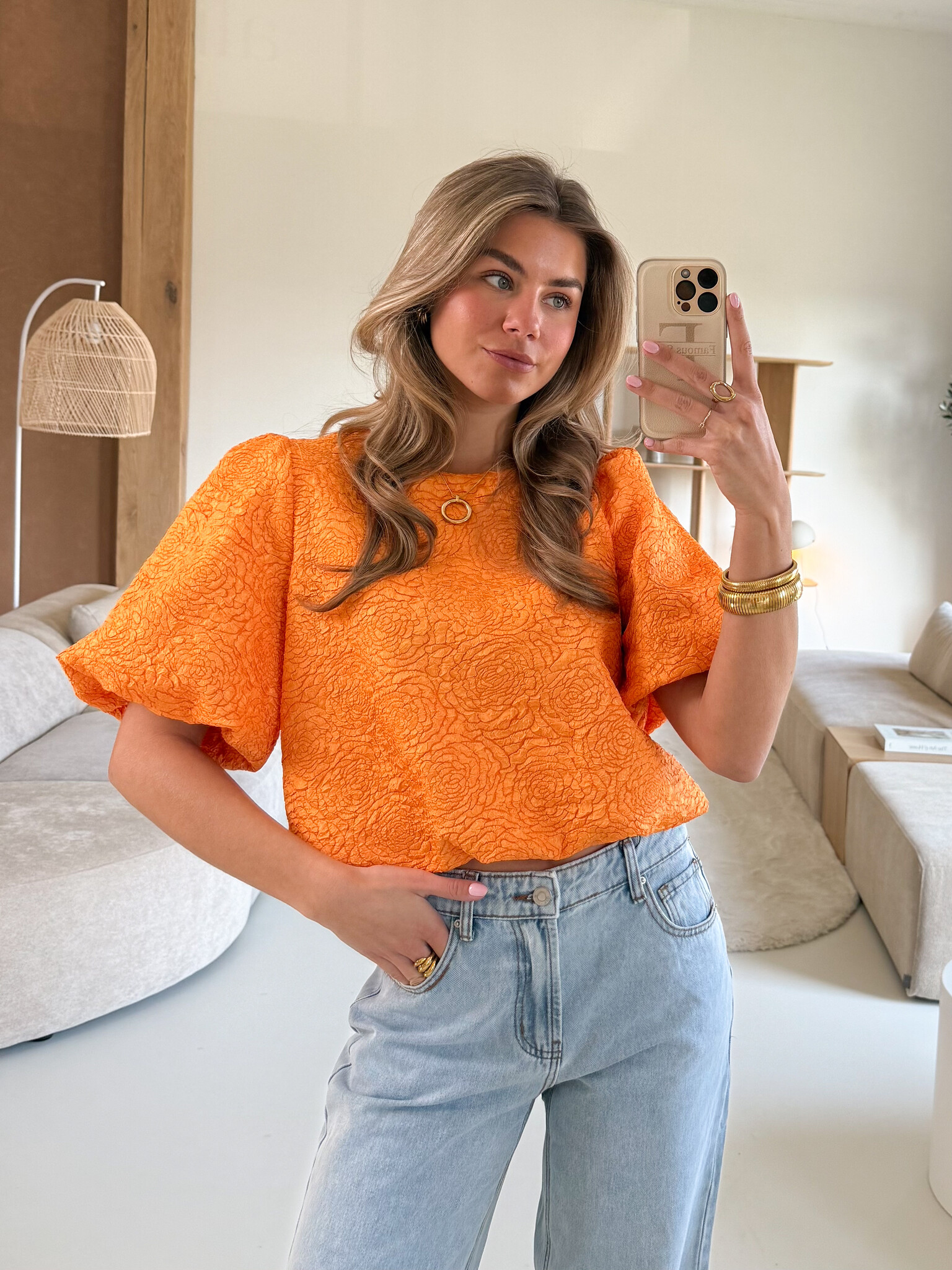 SPRING INTO KINGSDAY - Rosy musthave! Onze Mira oranje top heeft een bloemenstructuur en pofmouwtjes. Het is een cropped model met een elastieke band aan de onderkant, waardoor het een ballon-effect heeft. Makkelijk te combineren met een van onze lichte jeans. De perfecte oranje top voor Koningsdag.