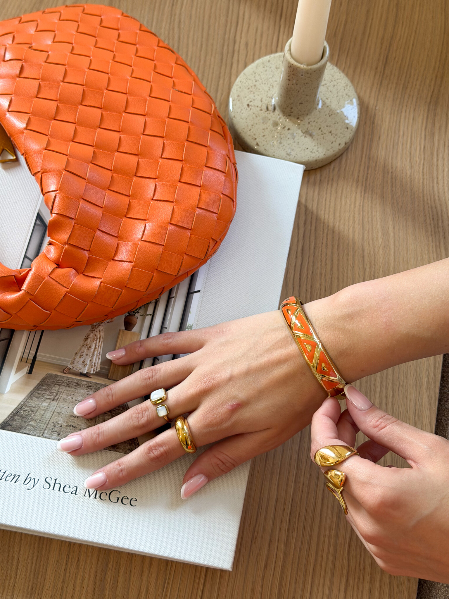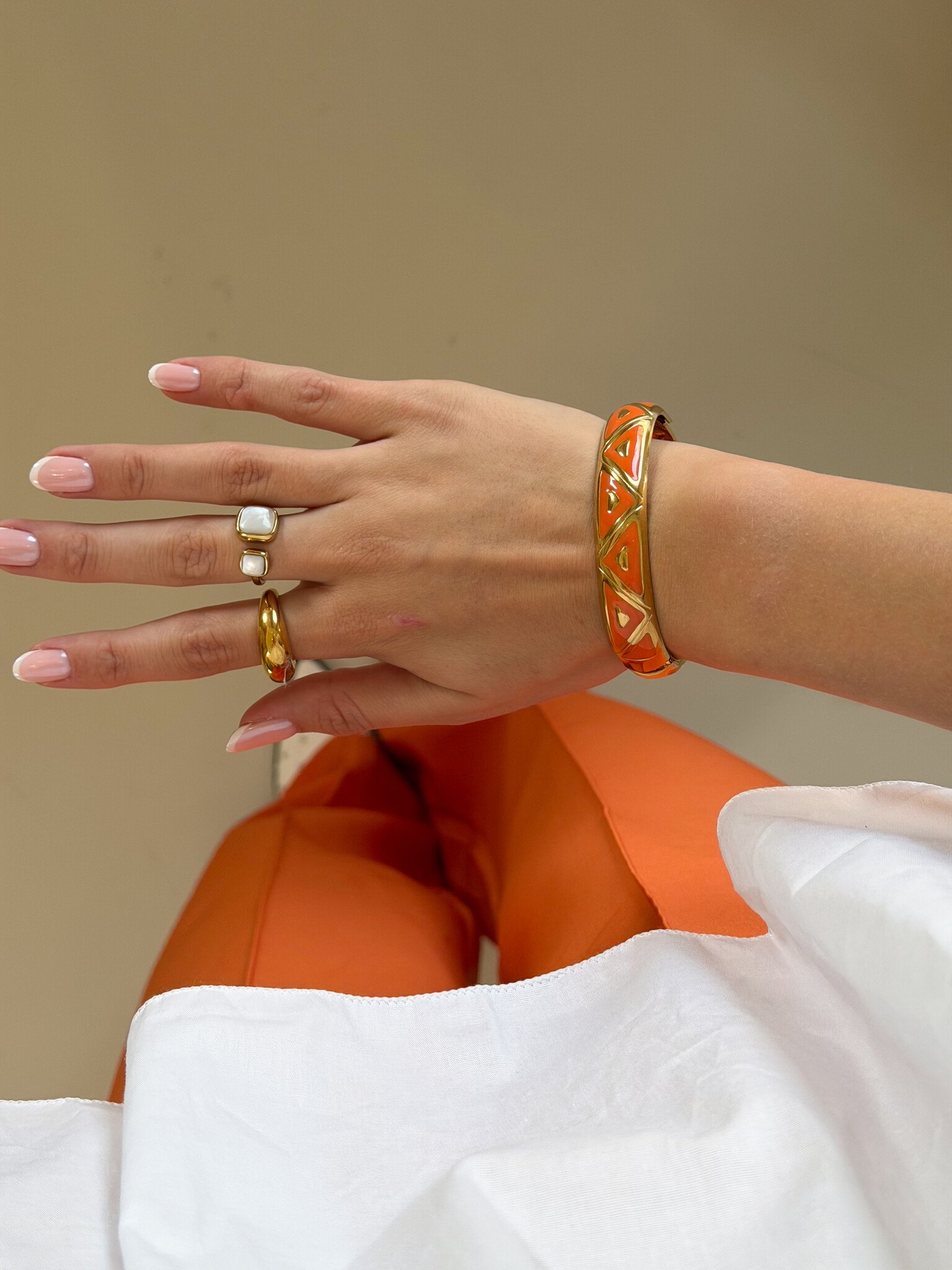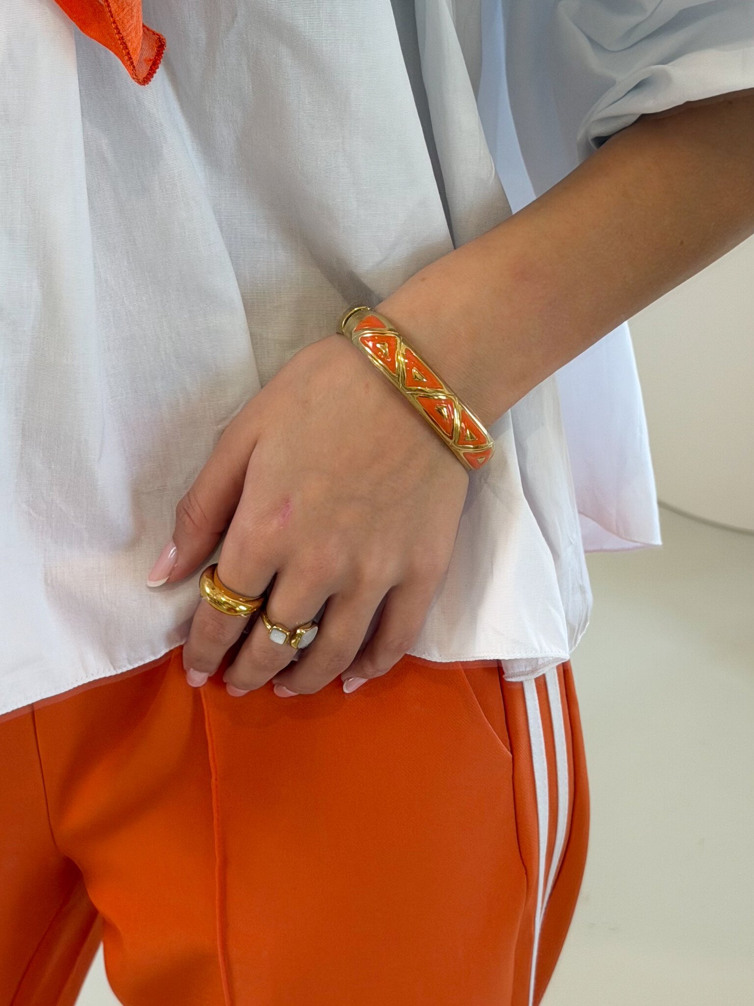 Deze opvallende oranje armband met geometrisch design is een echte eyecatcher voor je sieradencollectie. De armband bestaat uit strakke, hoekige vormen die samen een modern en speels patroon vormen, terwijl de felle oranje kleur een zomerse en girly vibe toevoegt. Perfect om een basic outfit direct op te vrolijken of te combineren met andere accessoires voor een trendy stacked look. De armband is licht en comfortabel om te dragen, ideaal voor festivals, citytrips, lunchdates of casual dagen waarop je je outfit net dat beetje extra flair wilt geven. Een musthave voor iedere girl die houdt van opvallende en trendy statement sieraden