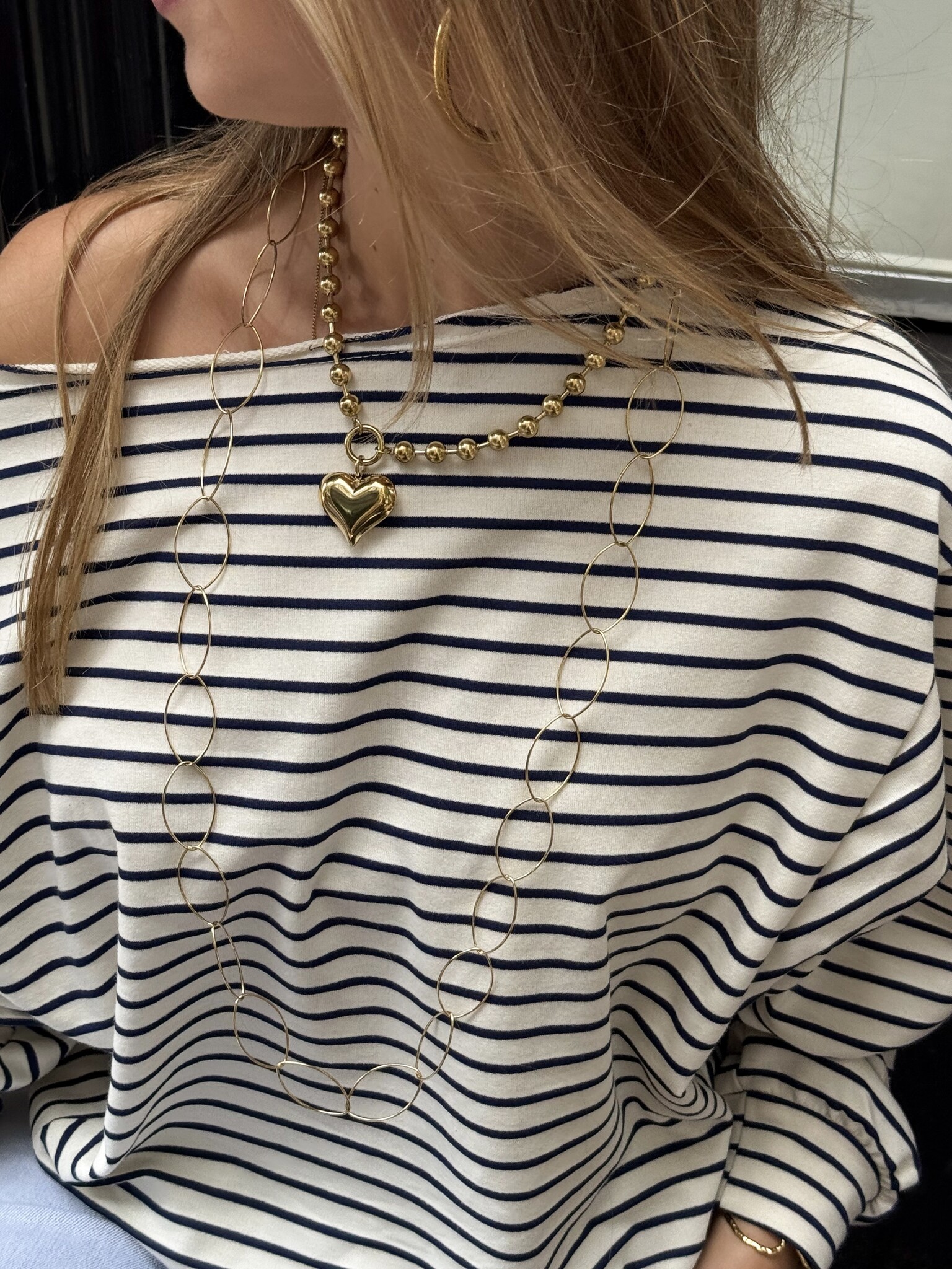 Deze lange minimalistische ketting is een stijlvolle aanvulling op elke sieradencollectie. De ketting bestaat uit fijne, subtiel gevormde ovale schakels die een elegante en verfijnde look creëren. Dankzij het minimalistische design is de ketting perfect om solo te dragen of te combineren met andere sieraden voor een gelaagde stijl. Een tijdloos accessoire dat iedere outfit moeiteloos chic maakt.