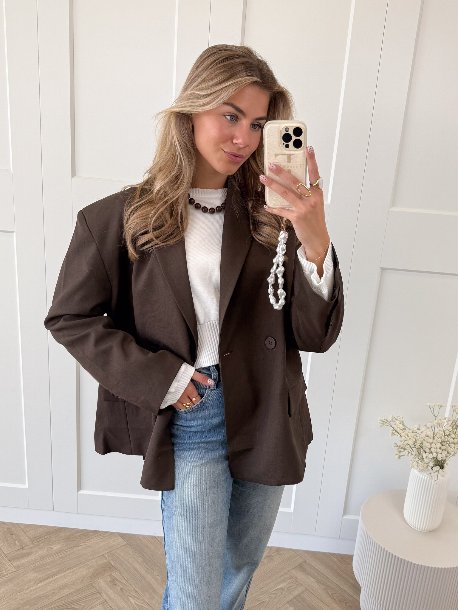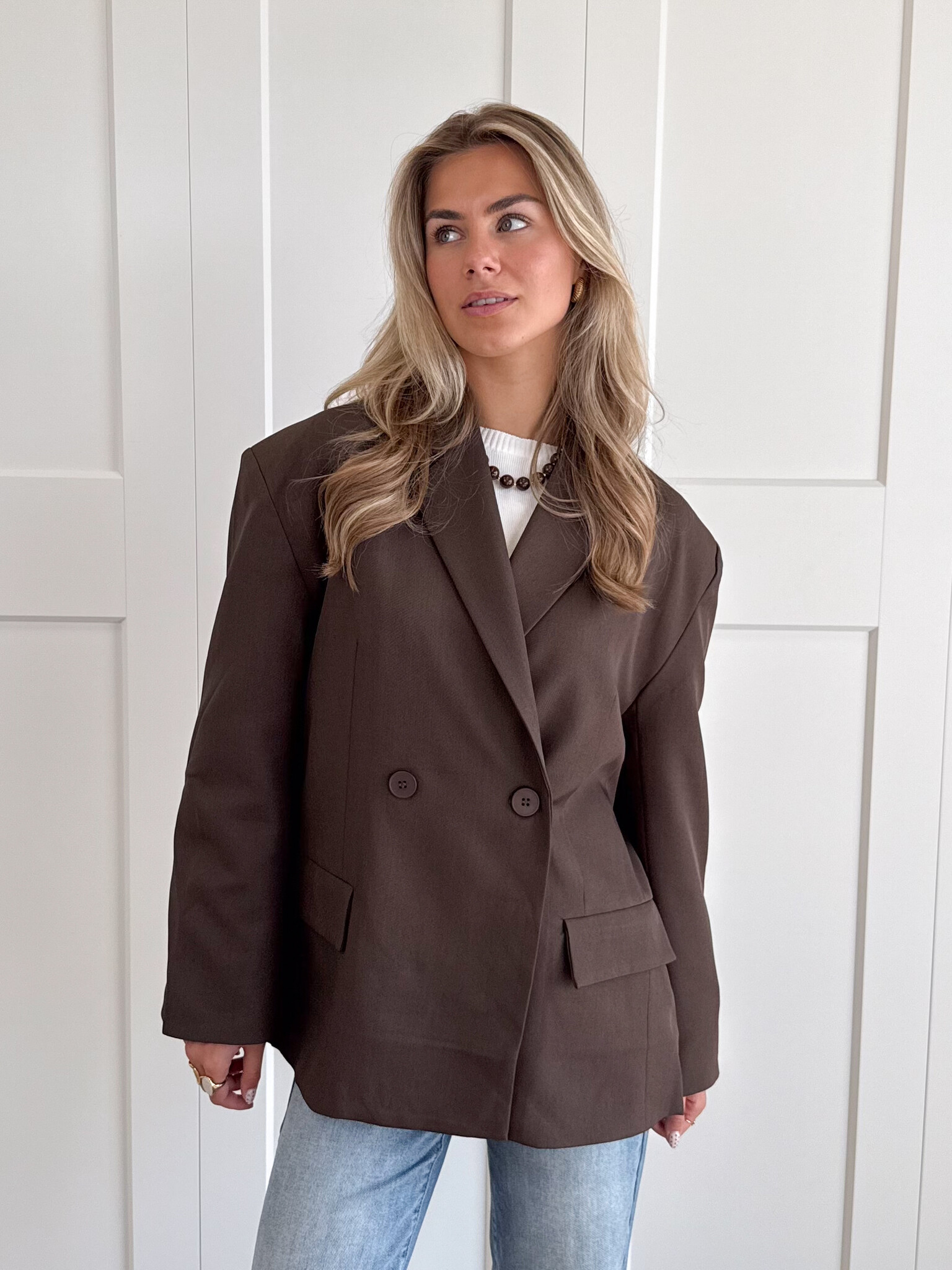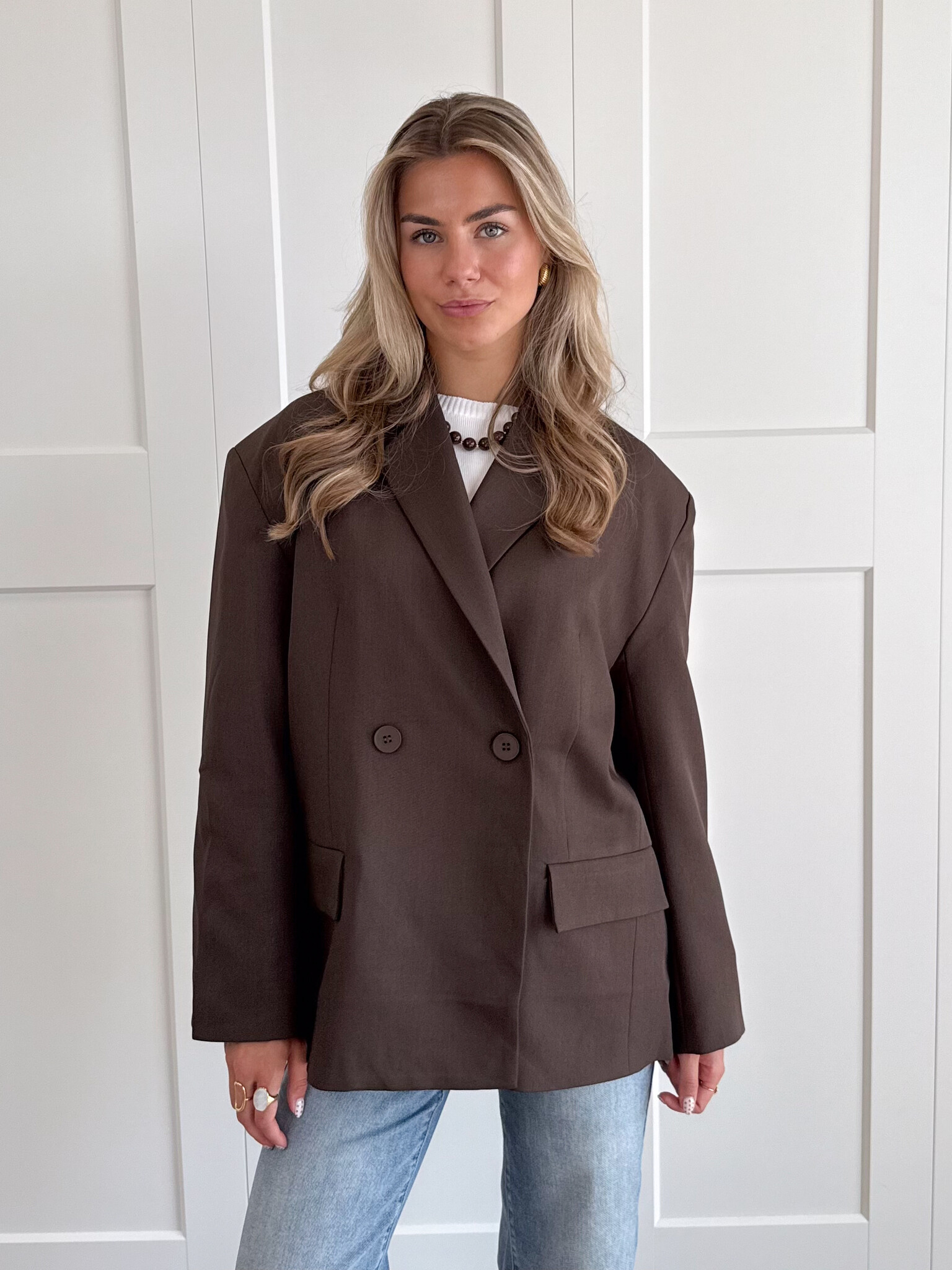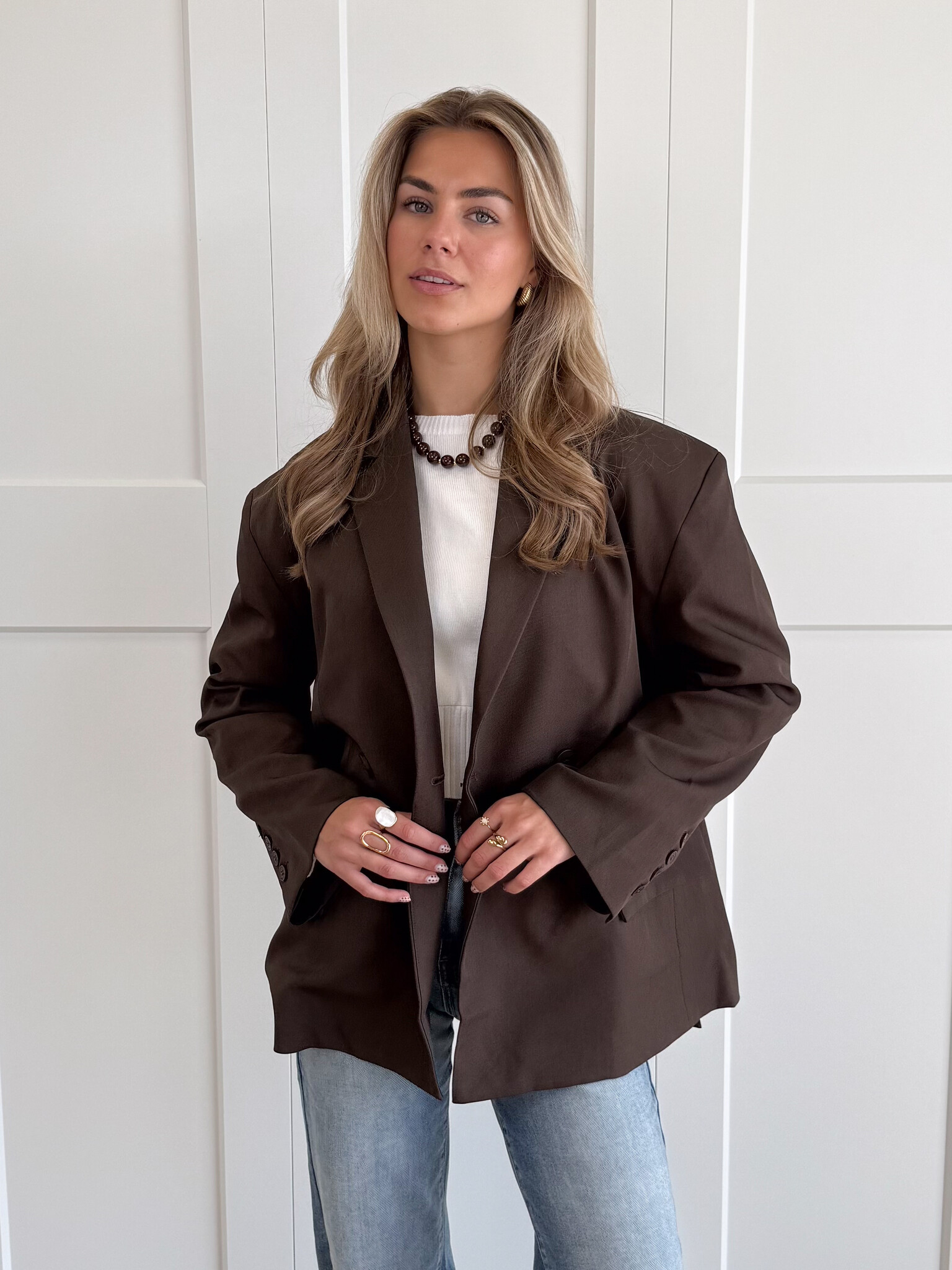 Deze oversized blazer is het ultieme key item dat elke outfit direct een stijlvolle upgrade geeft. De blazer heeft een losvallende pasvorm die zorgt voor een moderne en nonchalante uitstraling, terwijl de klassieke details hem tijdloos maken. Aan de voorkant vind je sierzakken en een dubbele knoopsluiting die zorgt voor een nette afwerking. Bij de mouwen zitten kleine knoopjes, wat een subtiel detail toevoegt aan het geheel. De achterkant is voorzien van twee elegante splits, waardoor de blazer extra mooi valt en je gemakkelijk kunt bewegen.