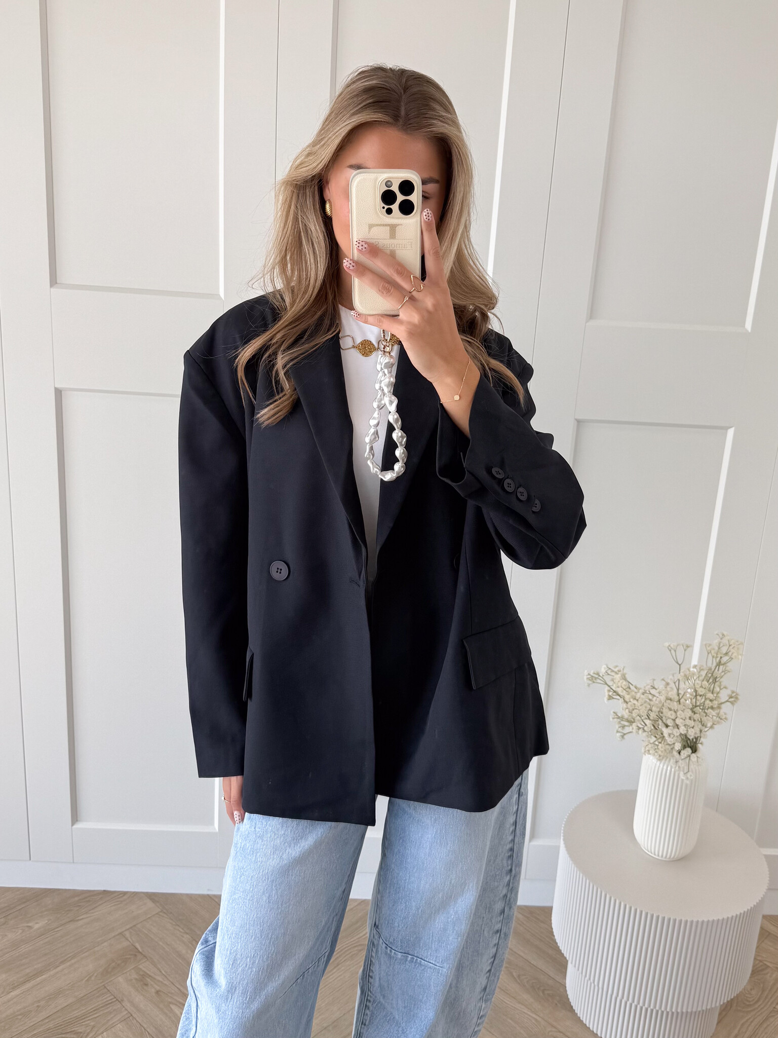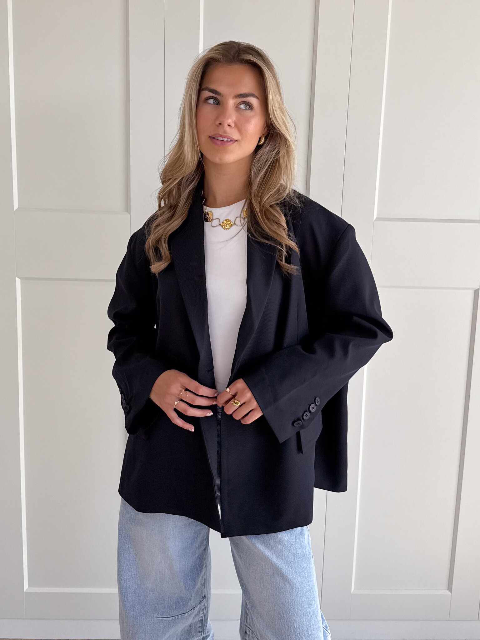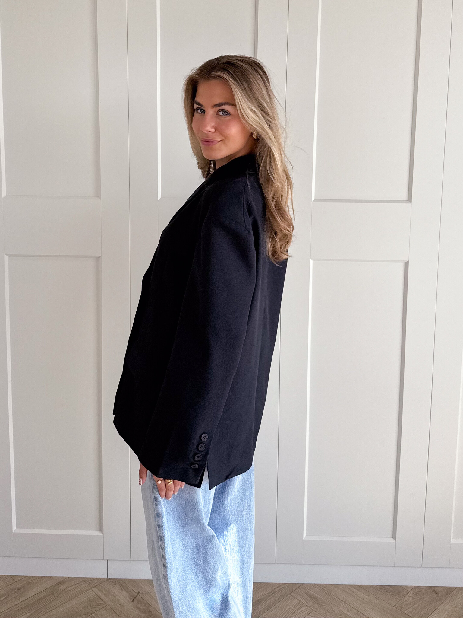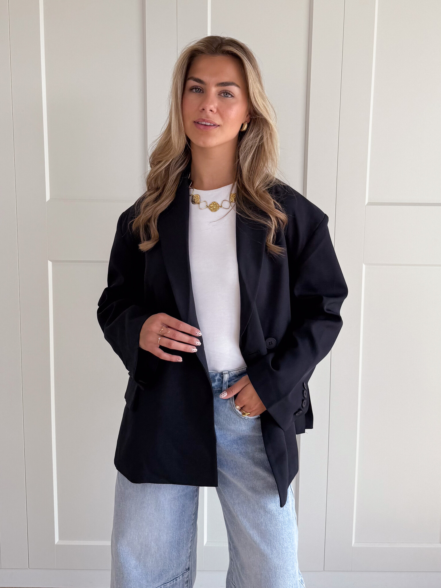 Deze oversized blazer is het ultieme key item dat elke outfit direct een stijlvolle upgrade geeft. De blazer heeft een losvallende pasvorm die zorgt voor een moderne en nonchalante uitstraling, terwijl de klassieke details hem tijdloos maken. Aan de voorkant vind je sierzakken en een dubbele knoopsluiting die zorgt voor een nette afwerking. Bij de mouwen zitten kleine knoopjes, wat een subtiel detail toevoegt aan het geheel. De achterkant is voorzien van twee elegante splits, waardoor de blazer extra mooi valt en je gemakkelijk kunt bewegen.