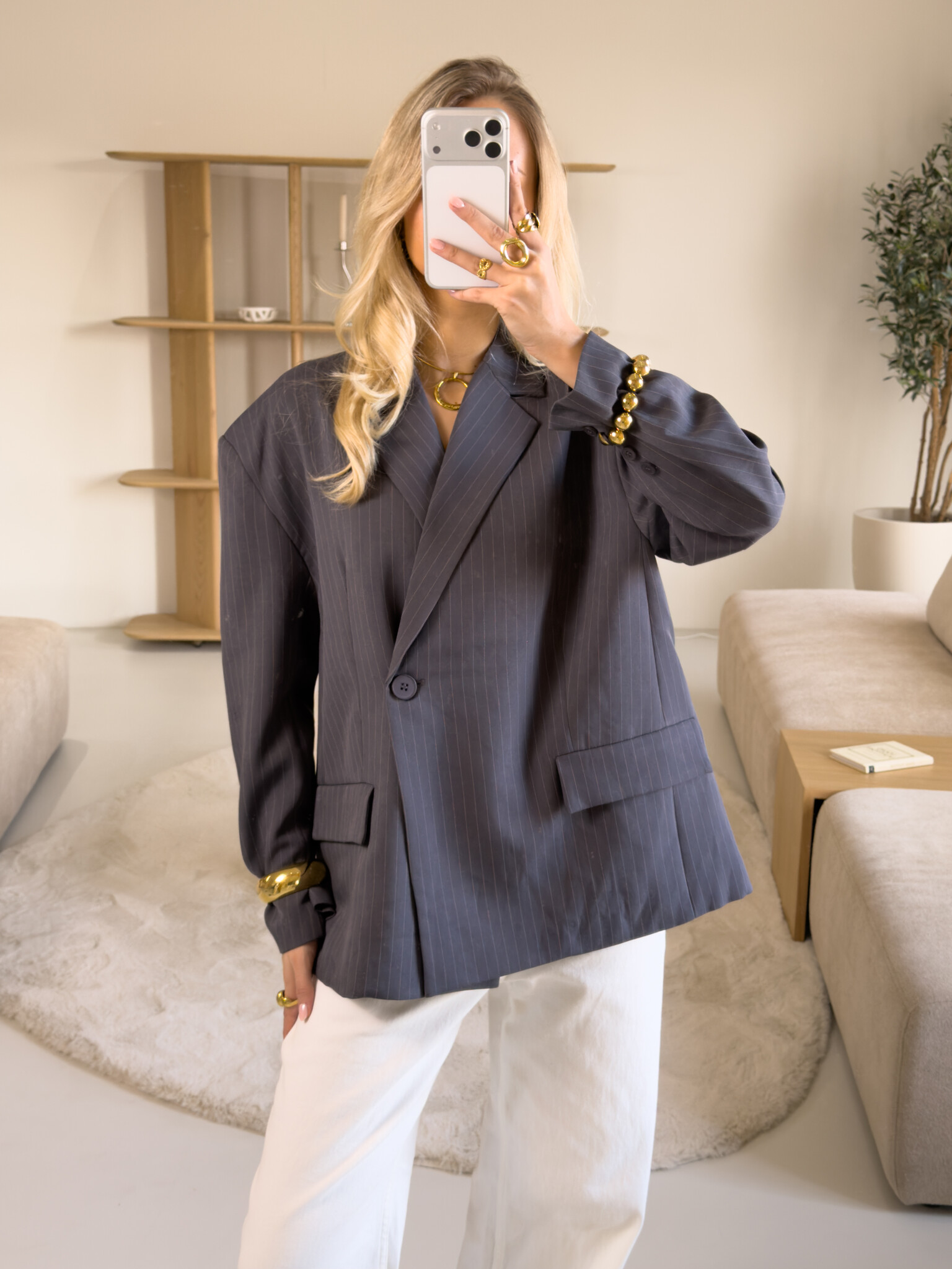 Deze oversized blazer is een must-have voor een girly en fashionable look. Het assymmetrische model geeft een moderne twist, terwijl de krijtstrepen zorgen voor een elegante en klassieke uitstraling. De sierzakken voegen subtiele details toe die de blazer net dat beetje extra geven. Perfect te combineren met een pantalon, jeans of rok voor een casual chic outfit of een stijlvolle werkdaglook. Deze blazer maakt elke outfit direct compleet, zodat je er trendy, zelfverzekerd en girly uitziet, of je nu naar kantoor gaat, een lunchdate hebt of een dagje gaat shoppen.