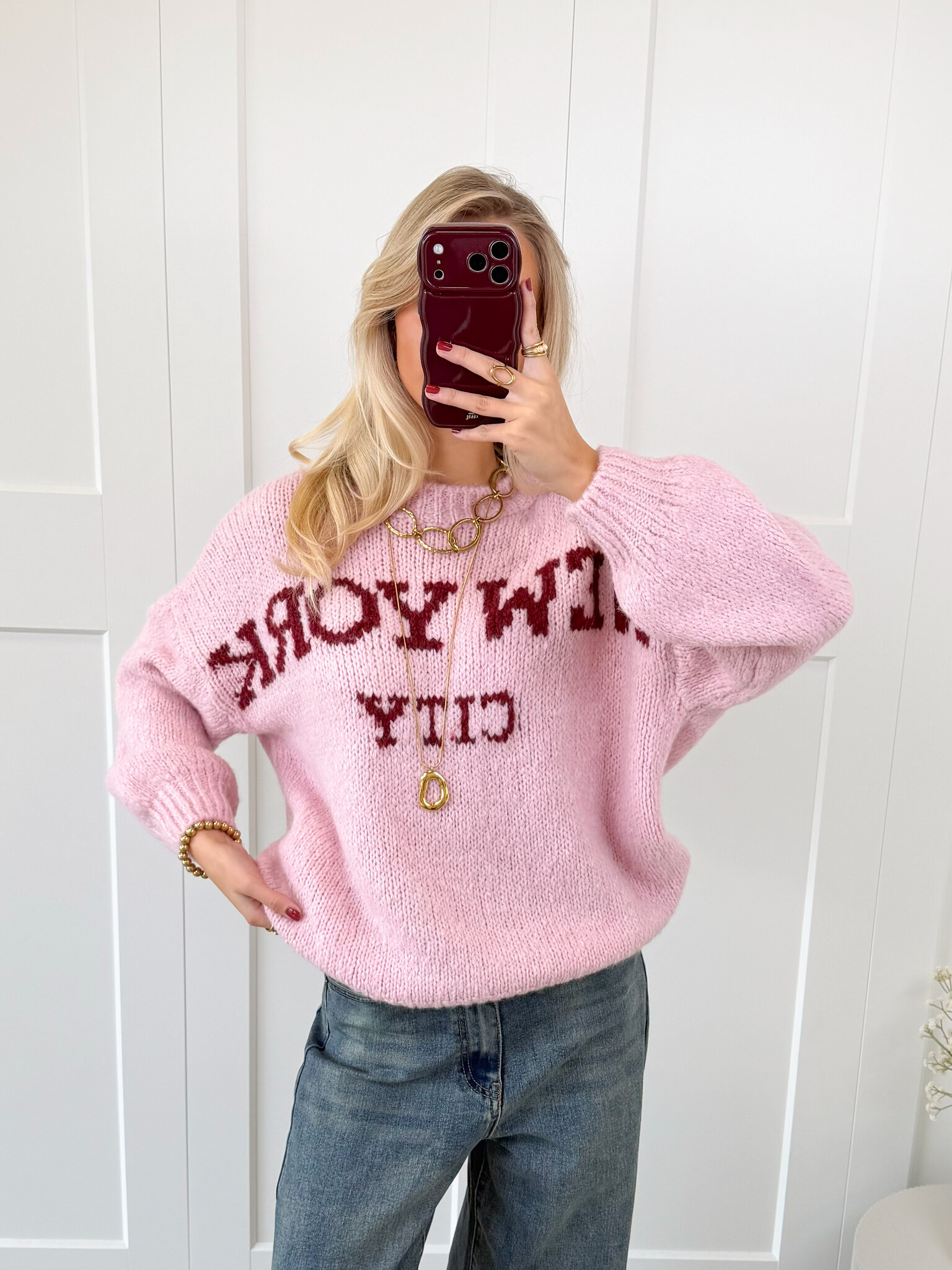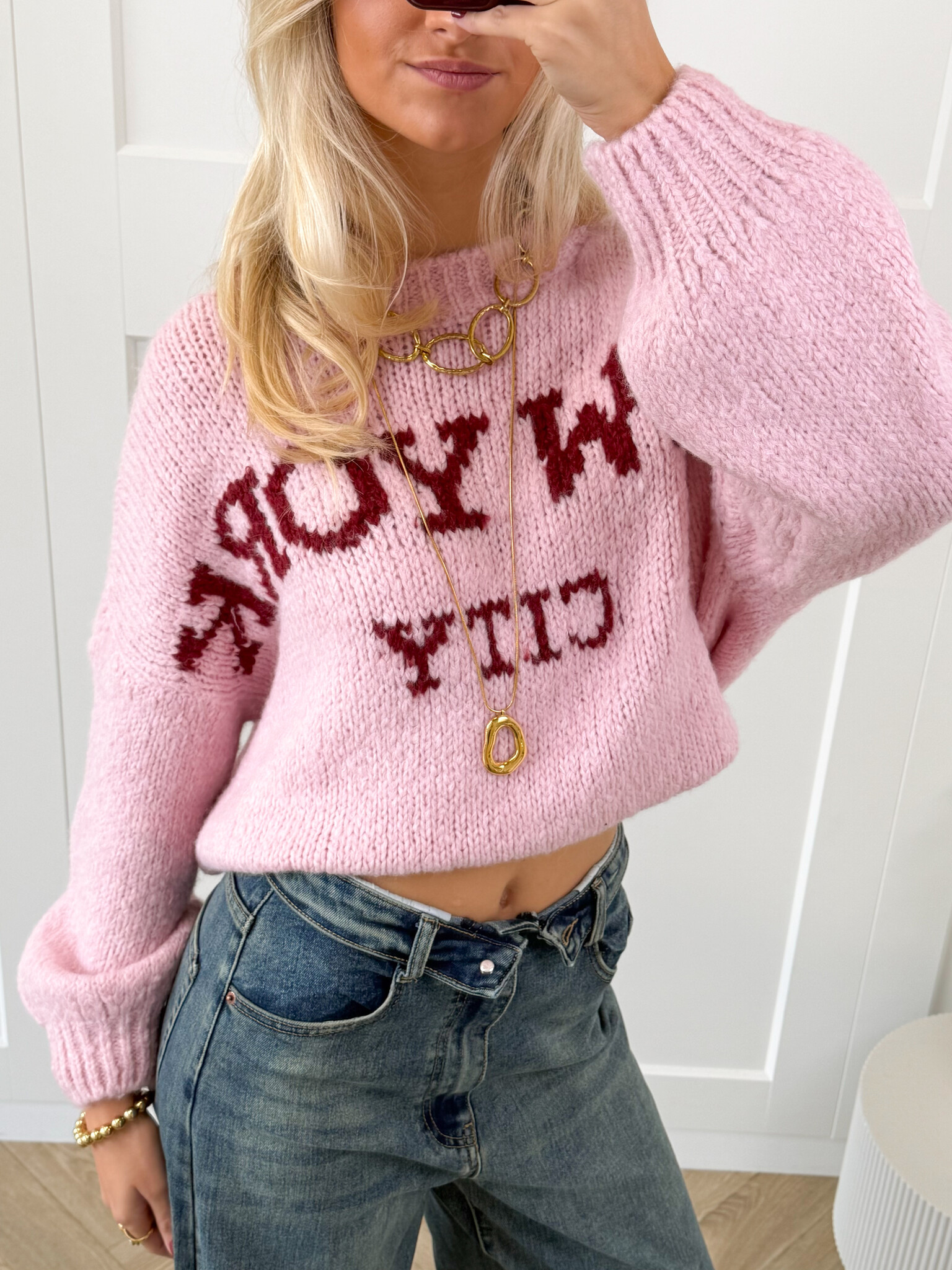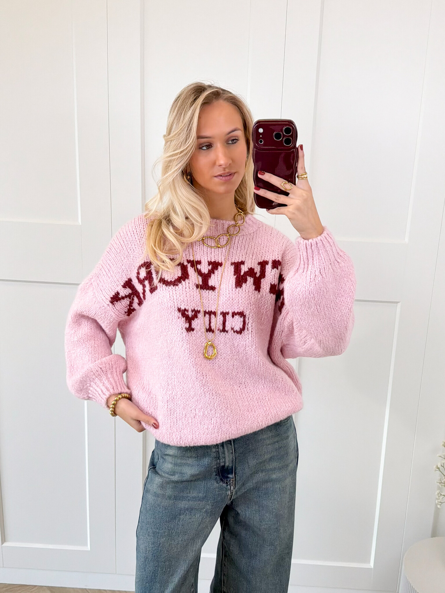 Deze roze oversized trui is dé knit die je overal bij draagt. De zachte stof voelt warm en comfy aan, terwijl de hoge hals perfect istegen koude dagen. De rood kleurige “New York City” letters geven de trui een trendy, urban touch alsof je zo door Manhattan wandelt. Dankzij de losse fit valt hij relaxed en effortless, ideaal voor allerlei outfits: van een casual jeans tot een cute skirt met laarzen. Het knit-materiaal maakt ‘m heerlijk cozy, maar door de city-print voelt hij tegelijk super fashionable. Perfect voor school, werk, een dagje shoppen of een chill coffee date.