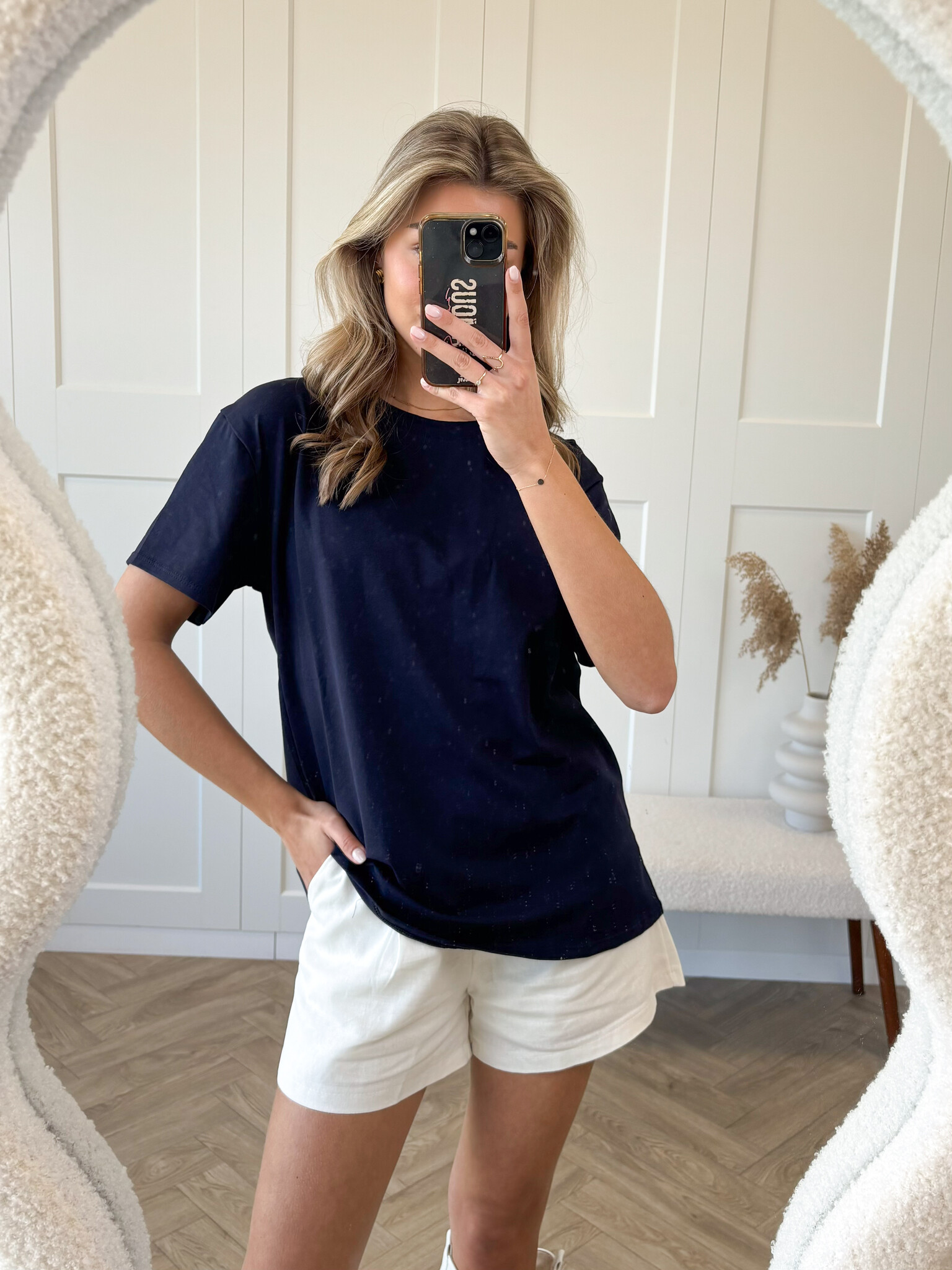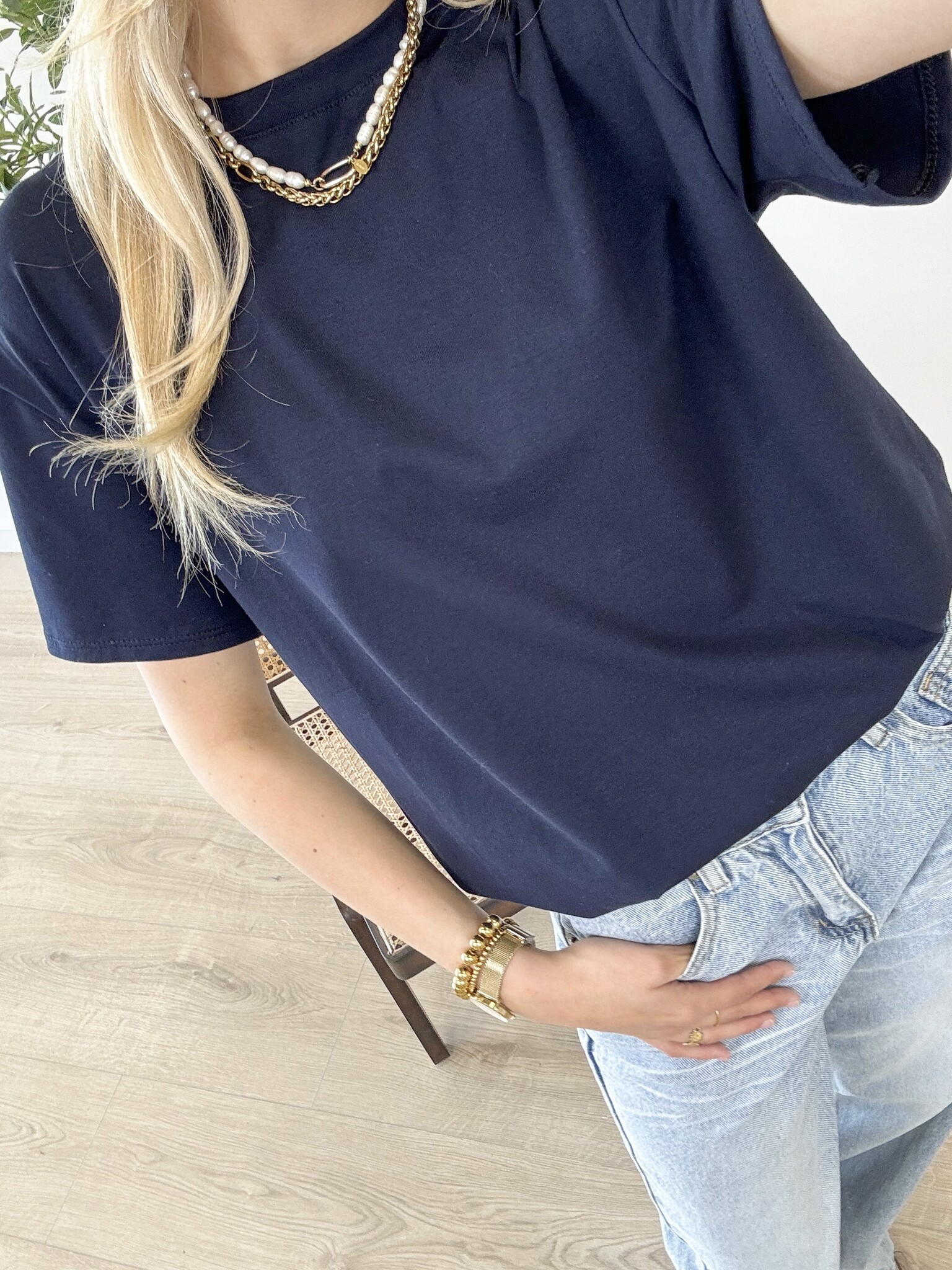 Dit basic oversized T-shirt in navy perfect voor een comfy en stijlvolle look. De zachte stof voelt heerlijk aan en zorgt voor een soepele pasvorm. Draag hem los over een baggy jeans en sneakers voor een casual look, of geknoopt op een rok voor een speels effect. Perfect voor ‘throw on & go’ outfits.