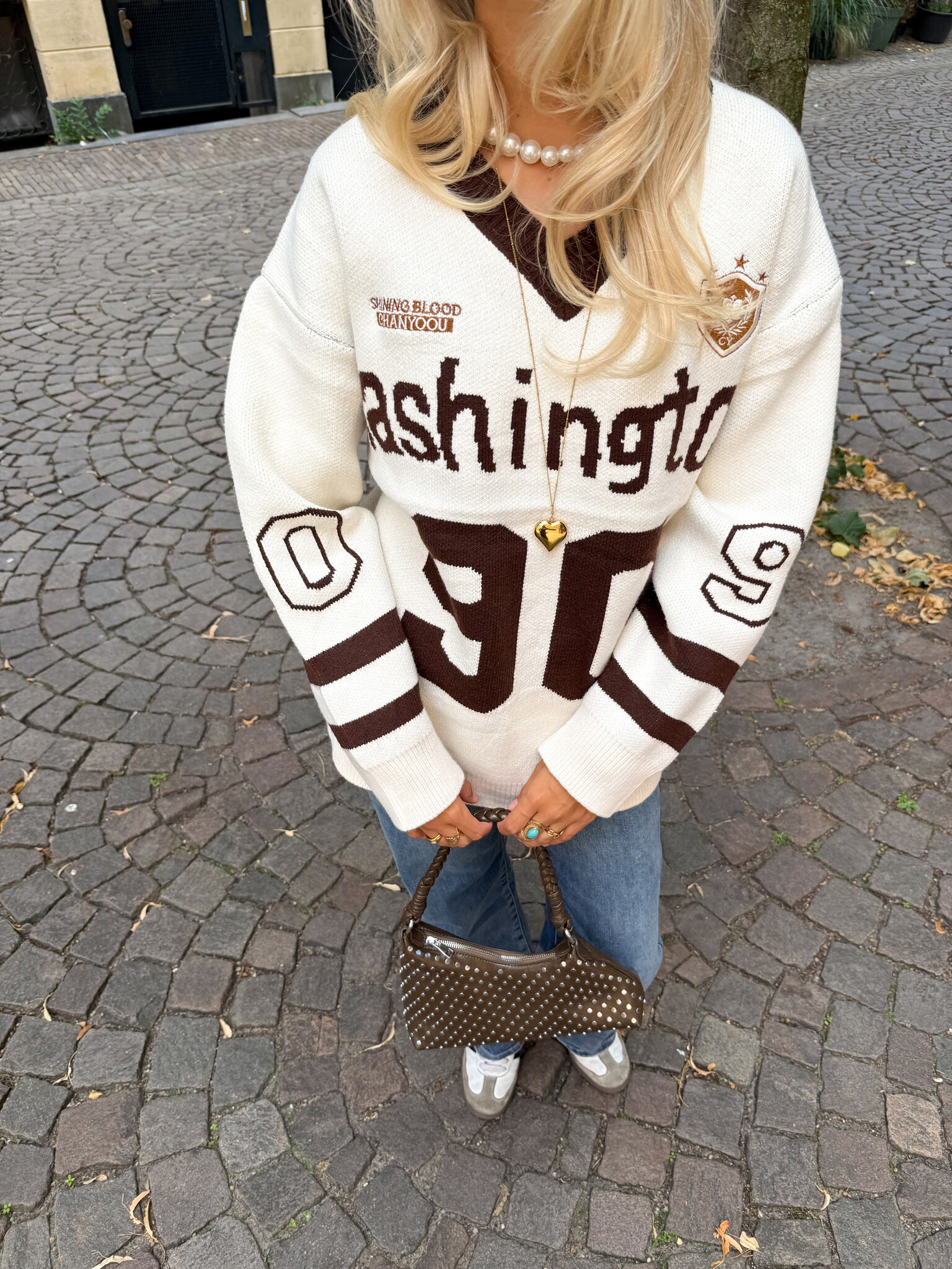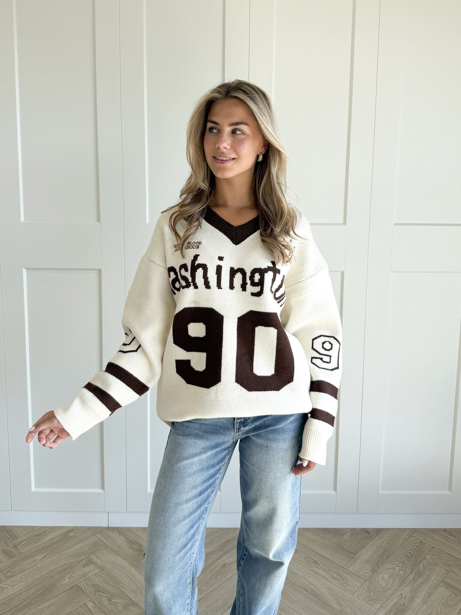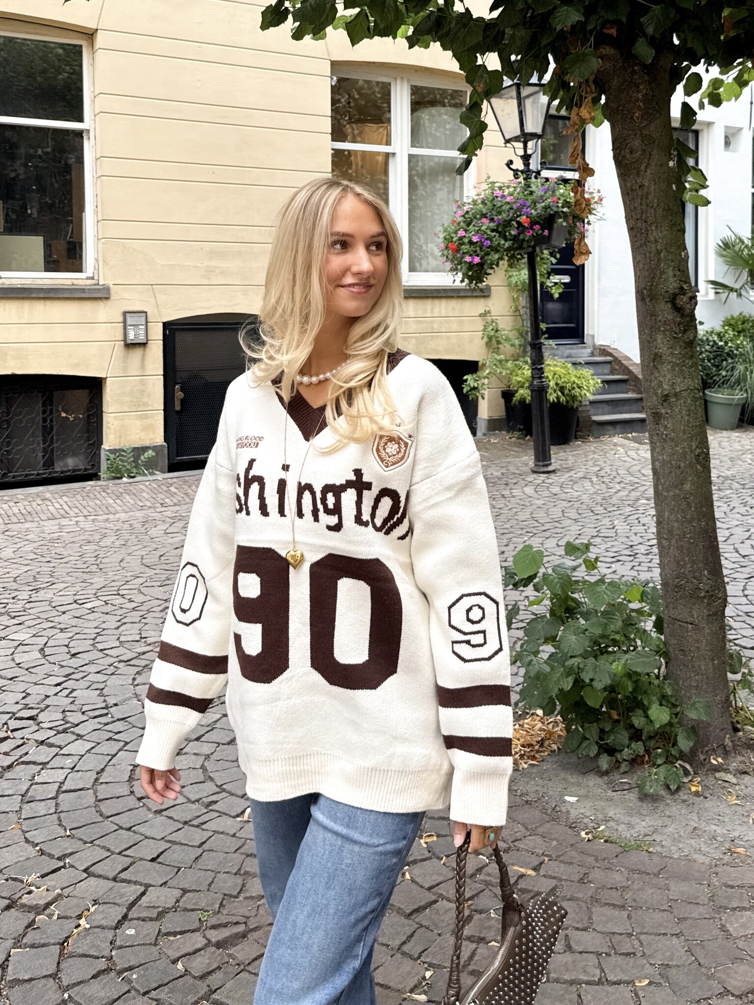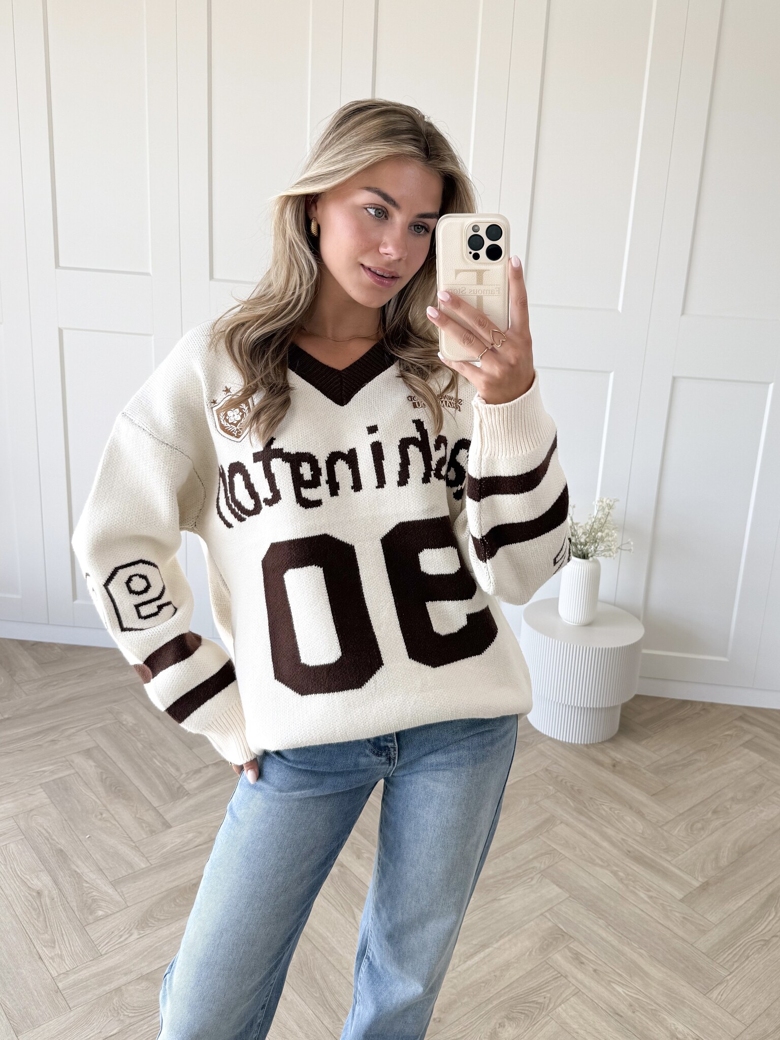 De ultieme oversized knit met een sporty Amerikaanse touch. Deze beige gebreide trui is afgewerkt met bruine varsity details. Dankzij de one size fit (XS-L) valt hij lekker ruim en comfortabel. Perfect voor je back to school look of een relaxte off-duty dag. Combineer met je favoriete jeans of een rokje voor een effortless casual vibe.