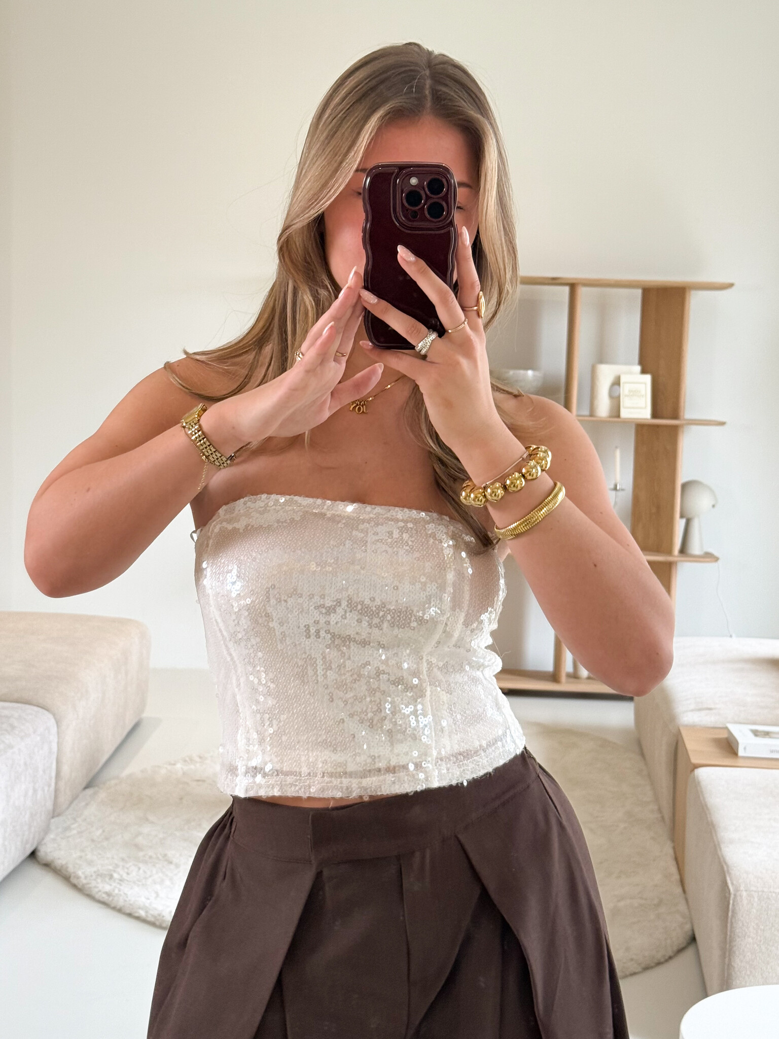 Deze strapless witte pailletten top is dé perfecte keuze voor een opvallende party look. De top is volledig bedekt met glanzende pailletten die zorgen voor een luxe en feestelijke uitstraling. Dankzij de strapless pasvorm komen je schouders mooi uit en krijgt je outfit een elegante en feminine vibe. De top heeft een dubbele voering, waardoor hij comfortabel zit en niet doorschijnt. Hierdoor voelt hij zacht aan op de huid en kun je hem zonder zorgen dragen tijdens een avondje uit. Combineer met een high waisted jeans, rok of pantalon voor een trendy look. Perfect voor feestjes, festivals, een dinnerdate of een avondje dansen met je girls. Met deze top steel je gegarandeerd de show.