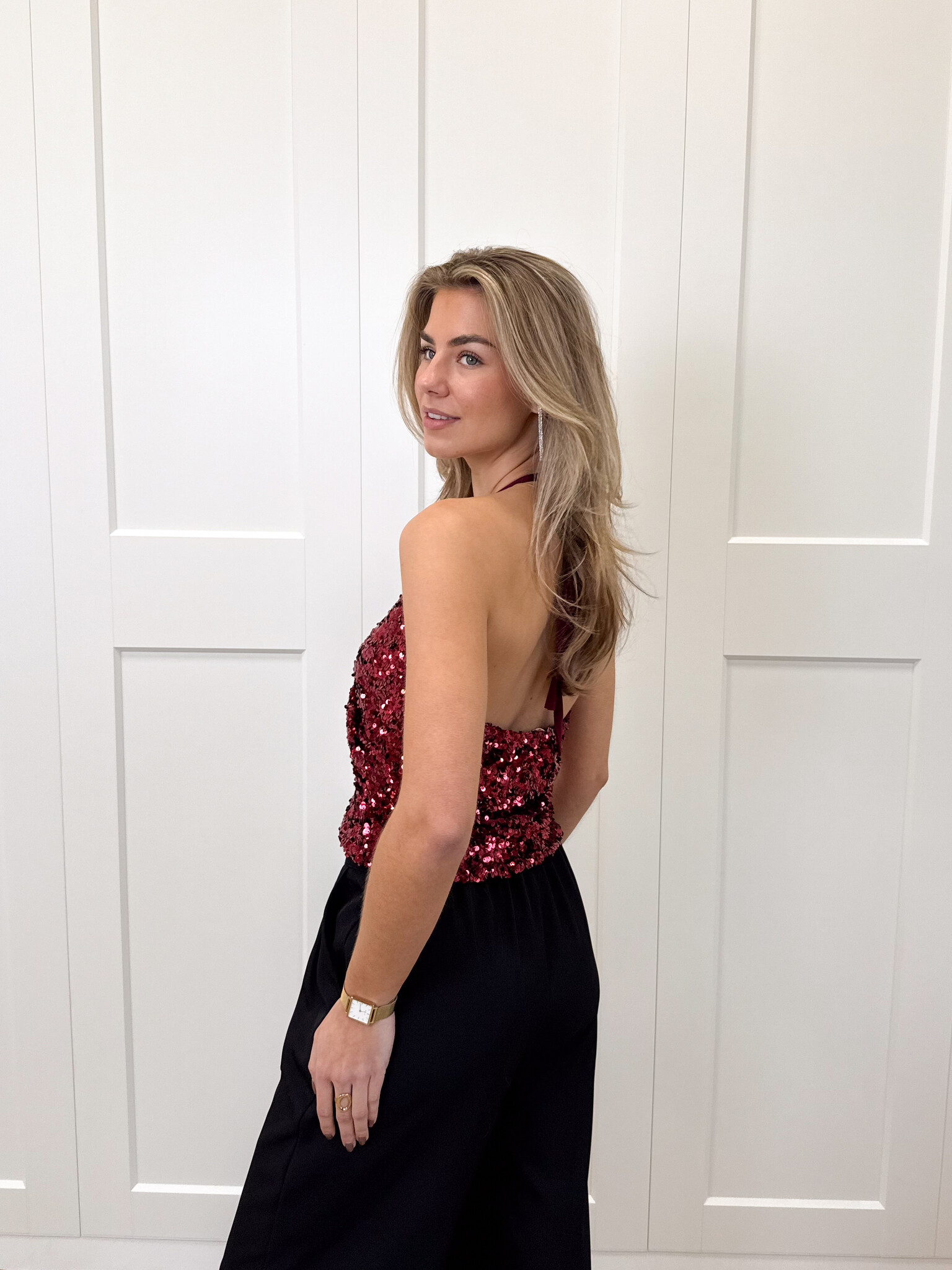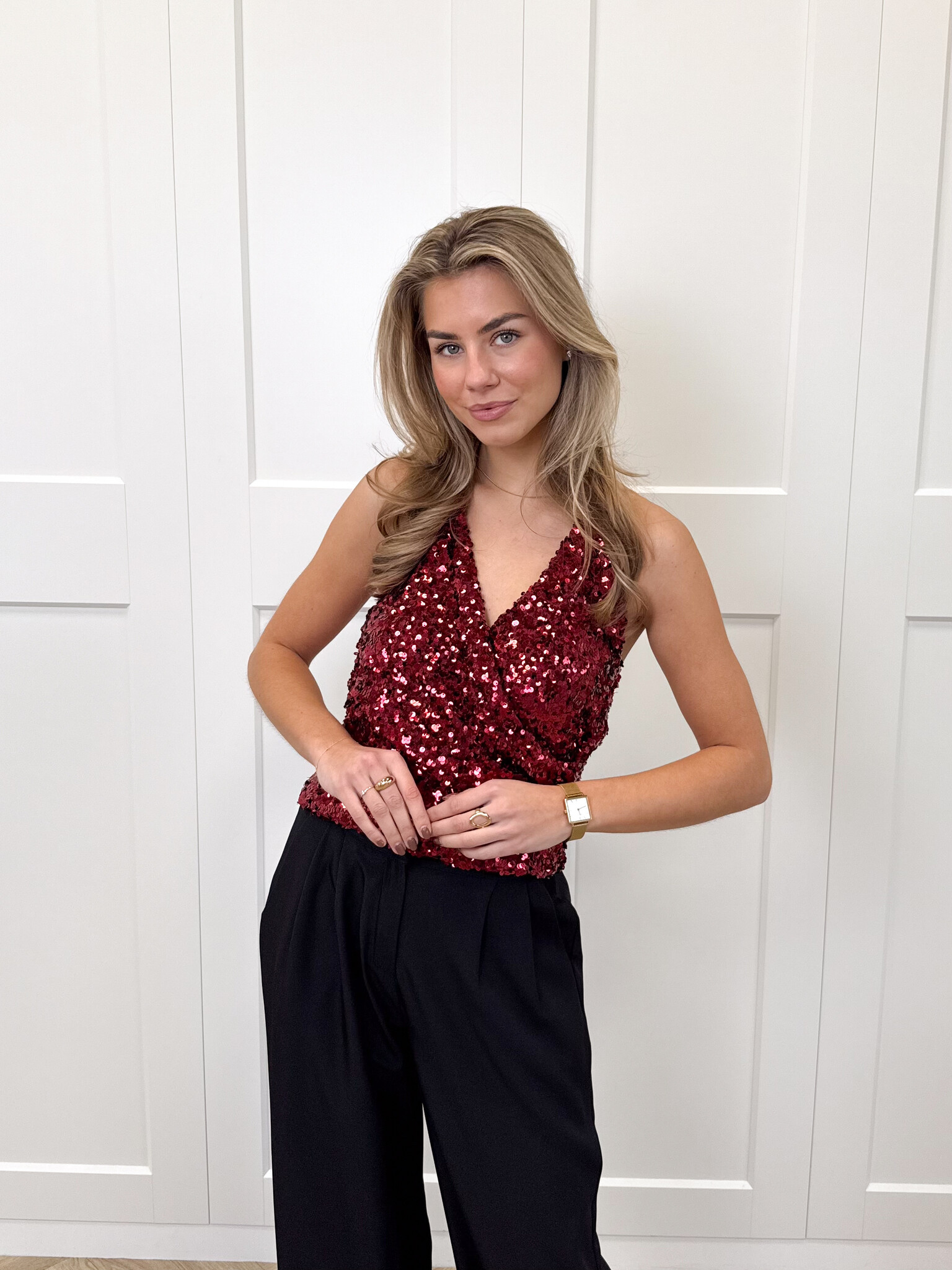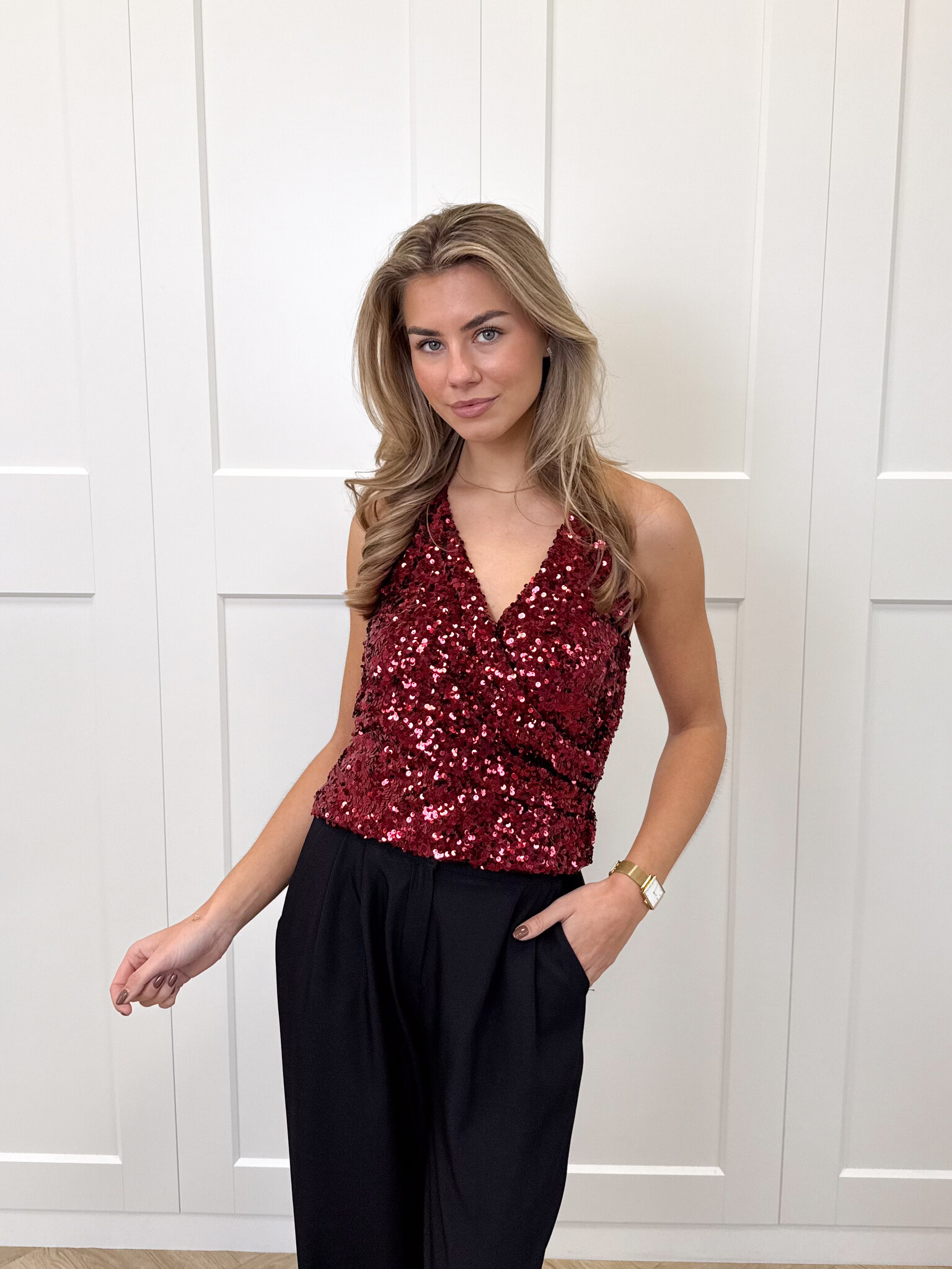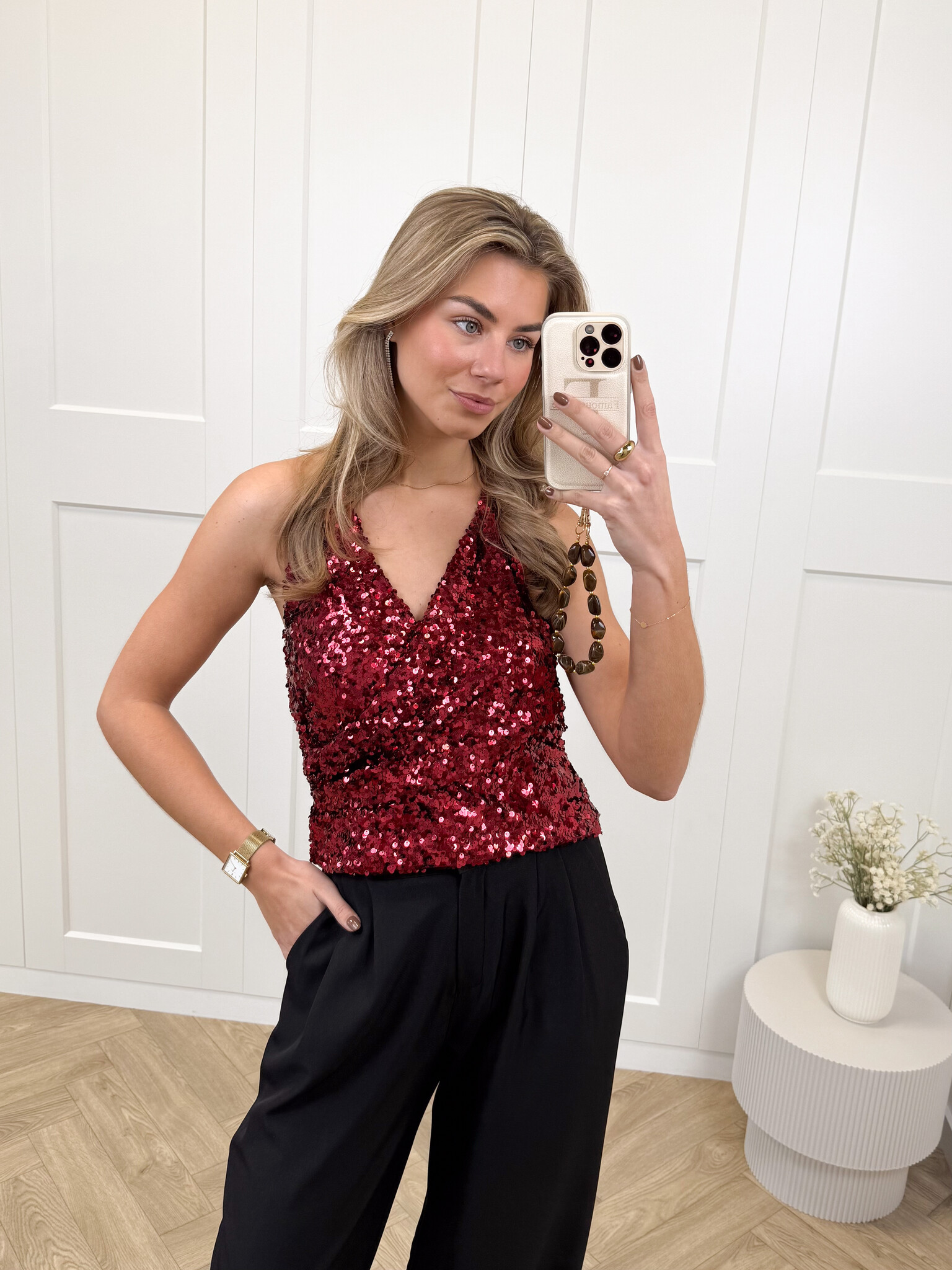 Deze halter top is gemaakt voor avonden waarop je wilt schitteren. De glanzende pailletten vangen elk lichtstraaltje op en geven je look direct een feestelijke, luxe uitstraling. De V-hals zorgt voor een elegante, vrouwelijke shape en maakt de top perfect voor een party night, een chic diner of een event waar je all eyes on you wilt. Dankzij de dubbel gevoerde binnenkant voelt de top comfortabel en zacht aan op de huid, zonder doorschijnen of kriebelen. De licht stretchy pasvorm sluit mooi aan en beweegt met je mee terwijl je danst of borrelt. Combineer ’m met een pantalon, glitterrok of faux leather pantalon voor een glam outfit die gegarandeerd indruk maakt.