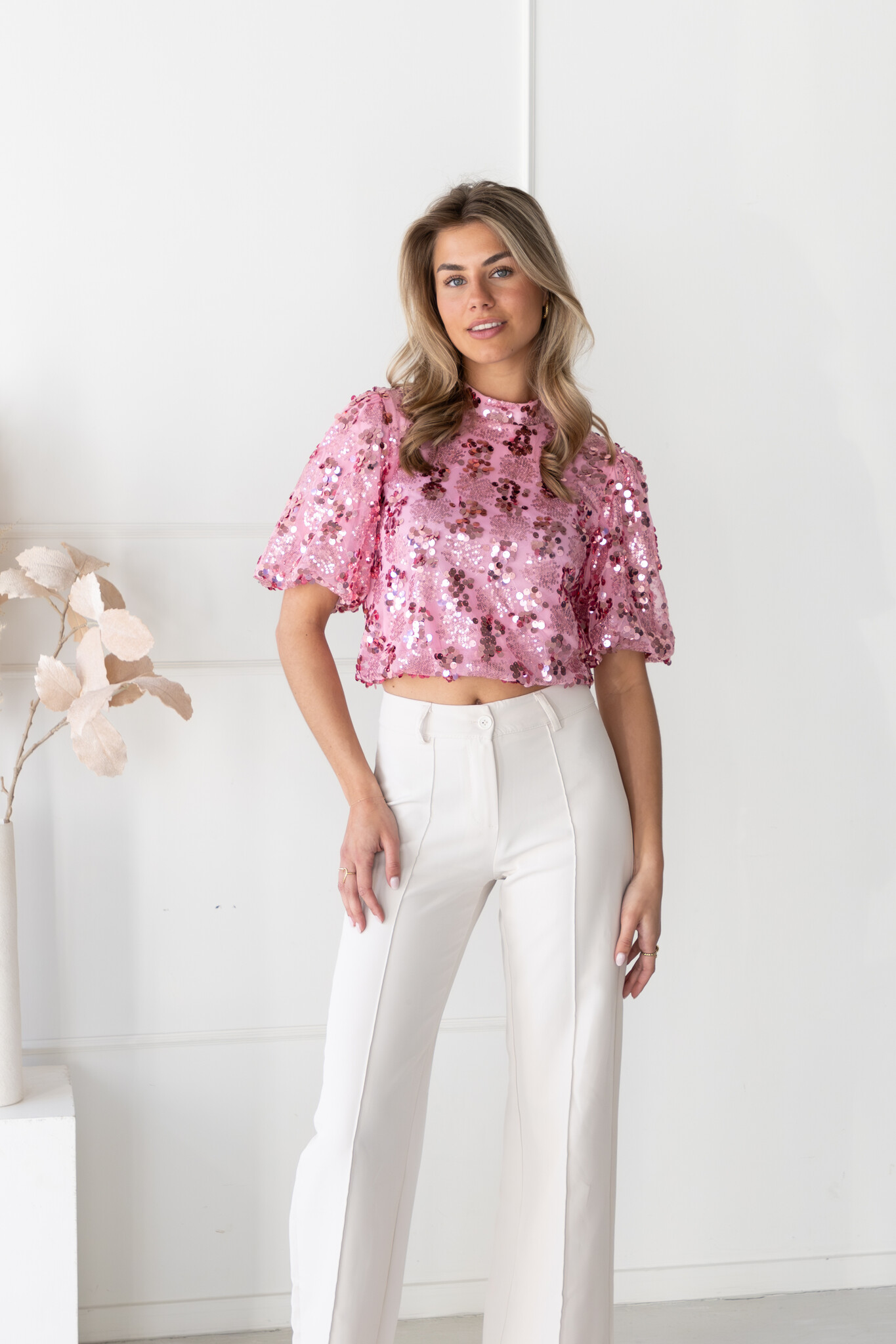 Hoe amazing is deze roze glitter top! De pofmouwen maakt deze party top een echte eye catcher. Het heeft een kleine open back en er zit een knoopsluiting aan de achterkant van de nek. Perfect voor de aankomende feestdagen of avondjes stappen met vriendinnen. Een echte eye catcher waardoor je de hele avond straalt in dit leuke pailletten feest topje!