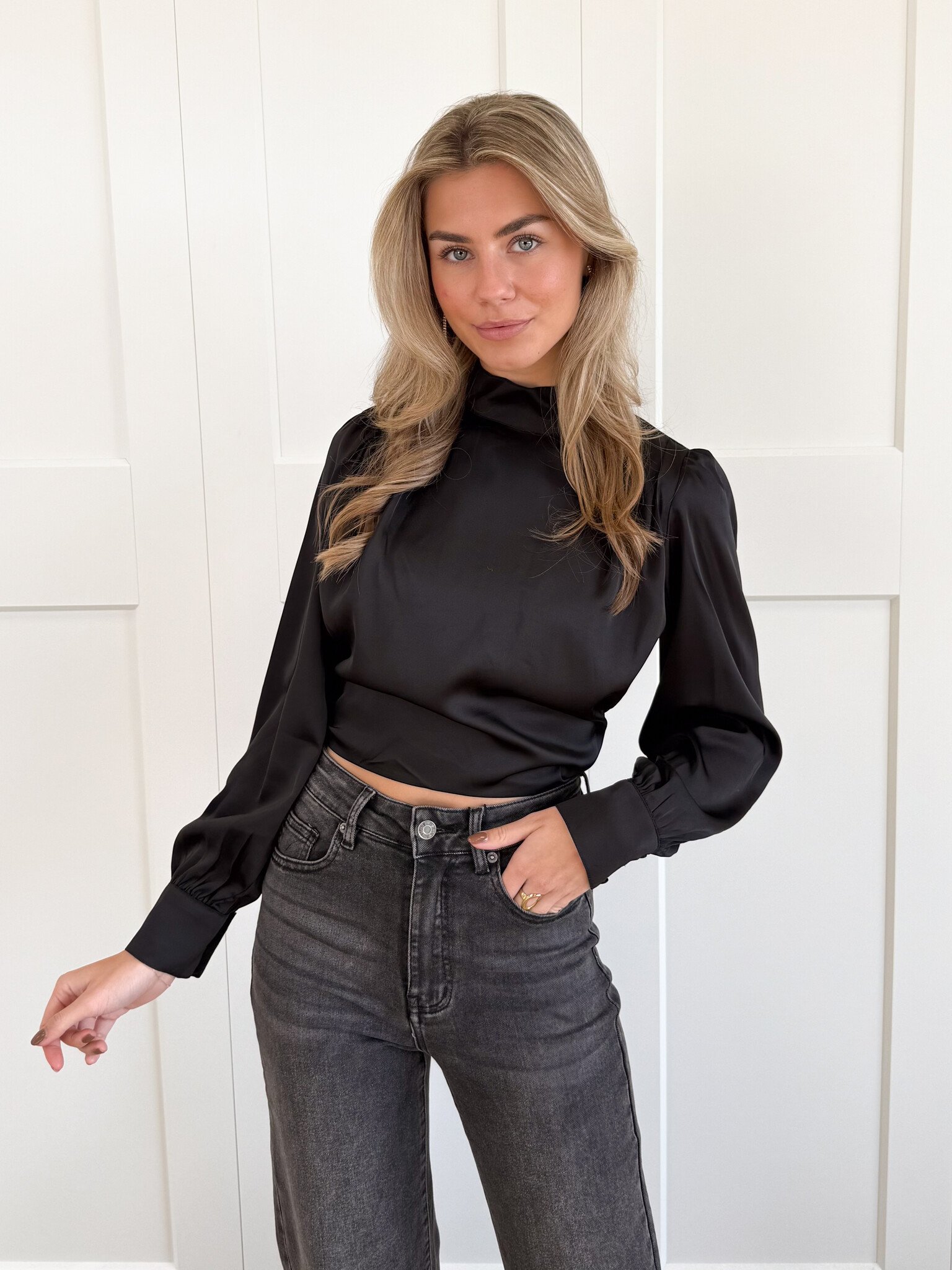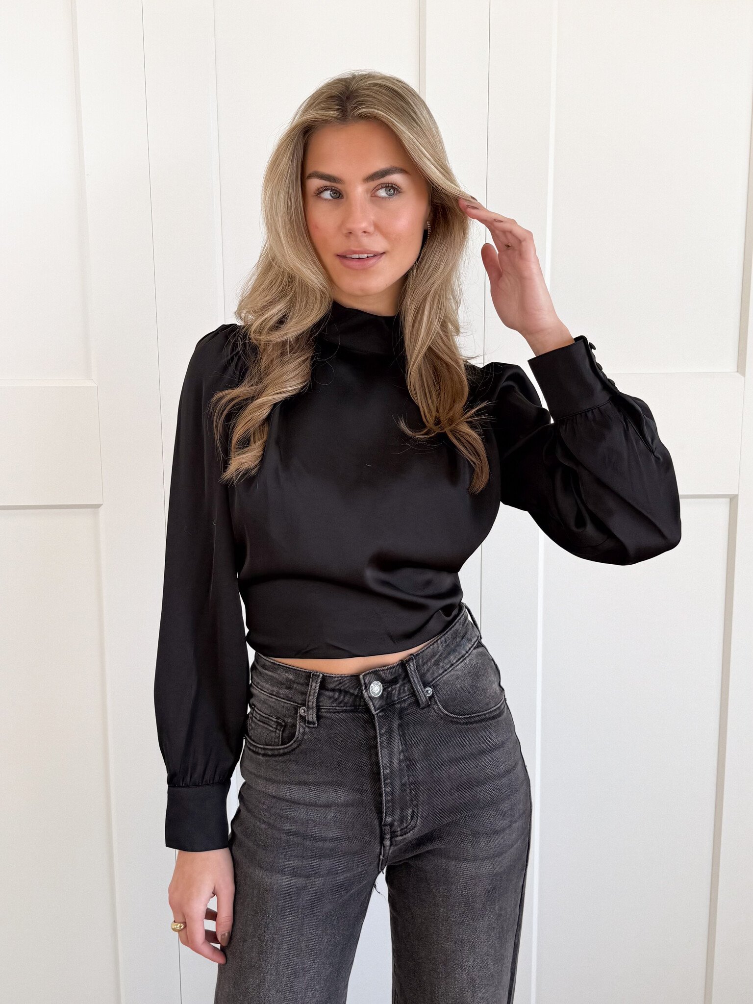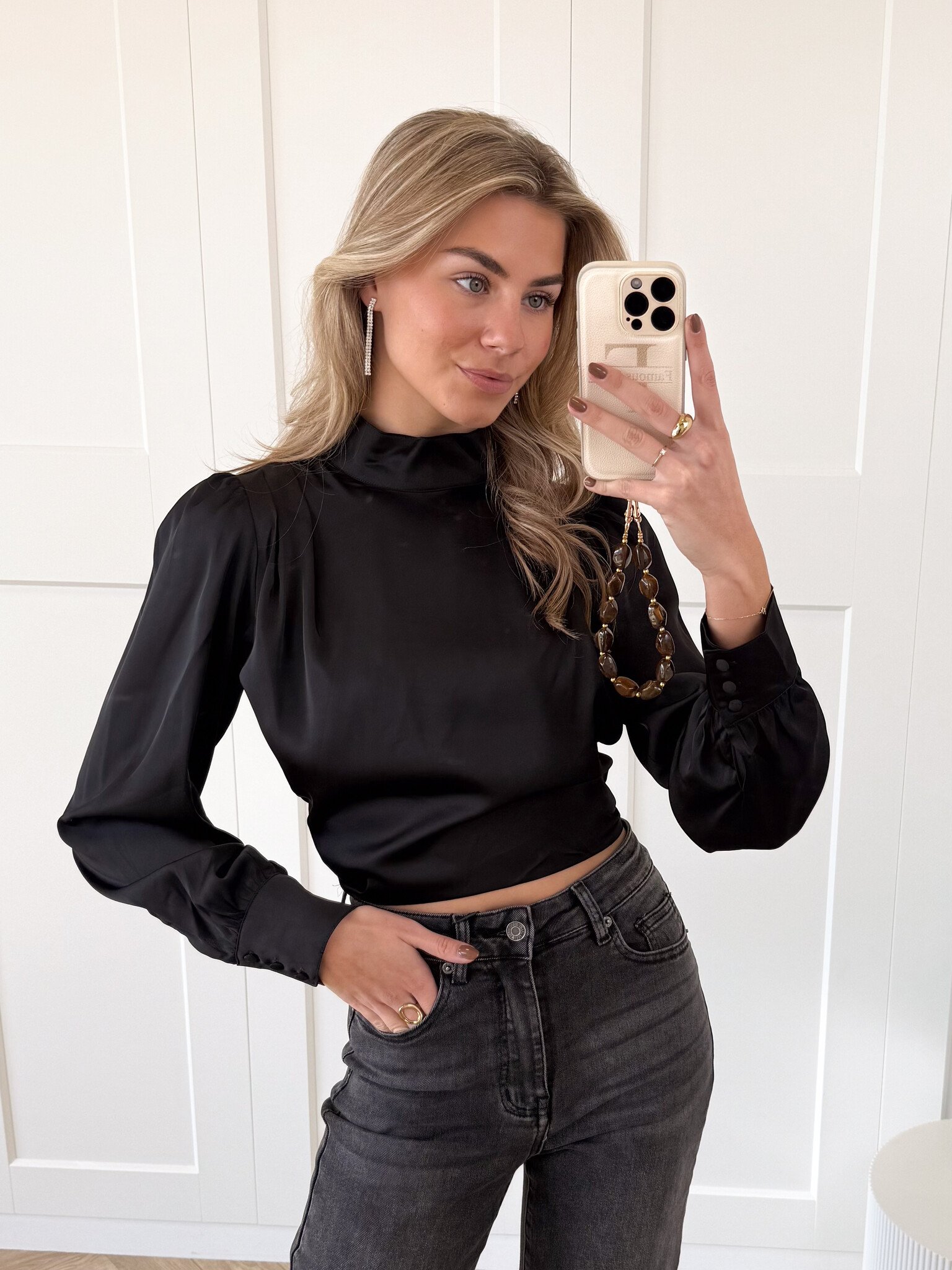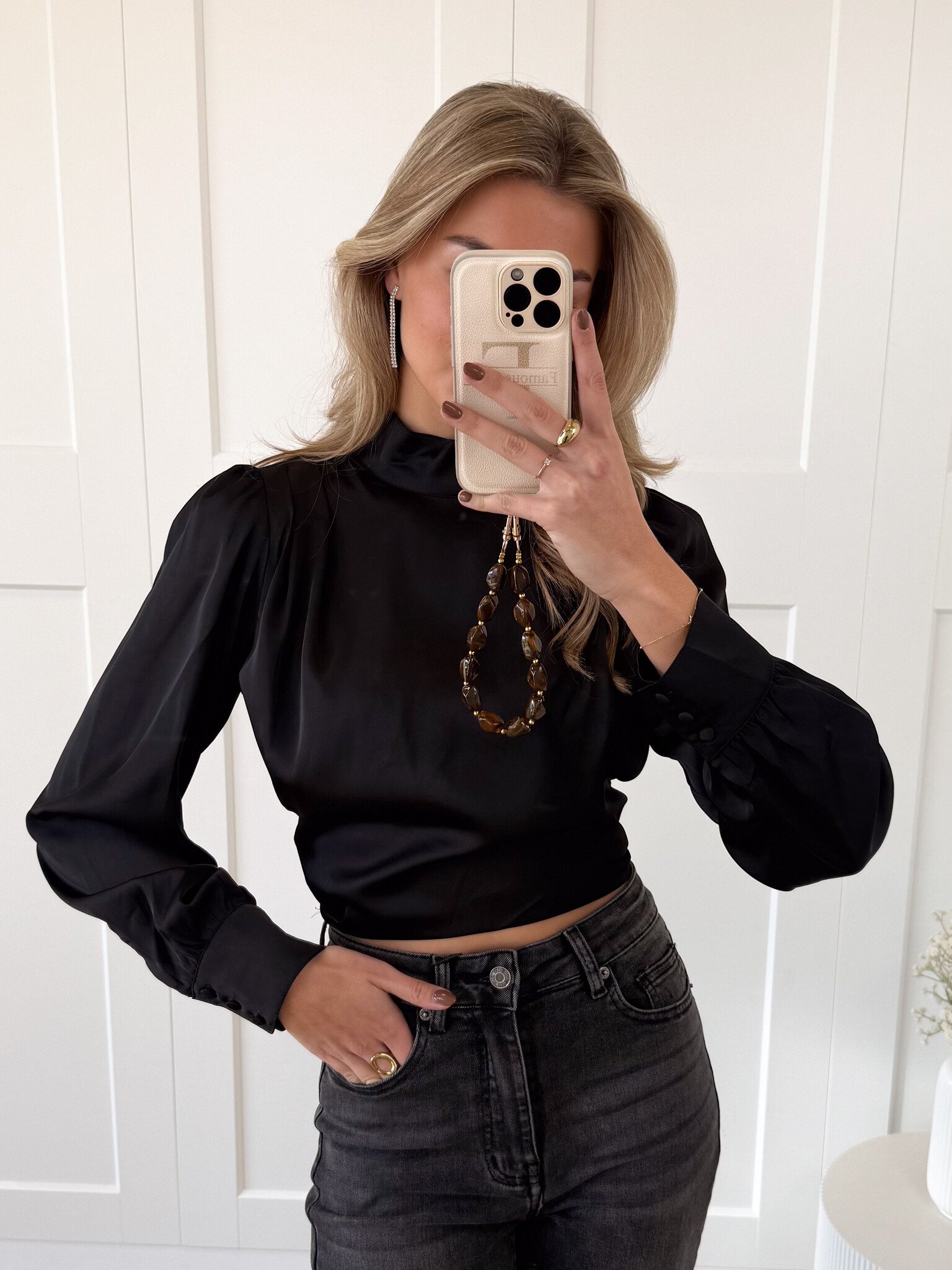 De sluiting bij de nek met knoopjes maakt het geheel af en voegt een extra elegantie toe, zodat de top zowel casual als chic gedragen kan worden. Draag hem over een jeans of een nette pantalon voor een effortless everyday look, of combineer met een rok en hakken voor een feestelijke outfit. De satijnen stof voelt zacht en licht aan, waardoor je er de hele dag comfortabel in blijft en de top prachtig valt.