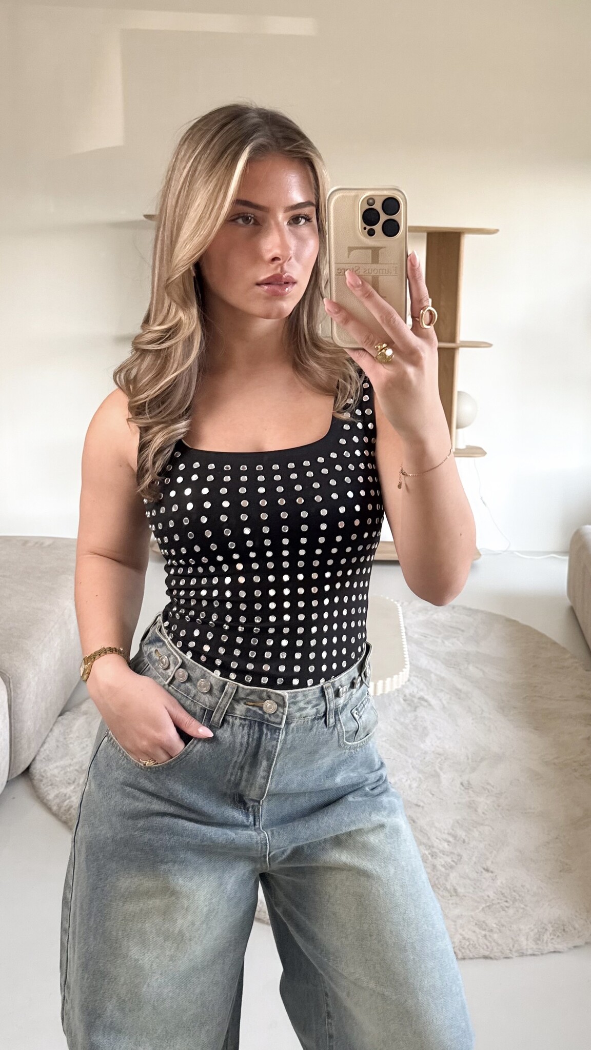 Deze body is perfect voor girls die houden van een statement look. De vierkante hals zorgt voor een vrouwelijke en trendy uitstraling, terwijl de studs een stoere, feestelijke touch geven. Dankzij de stretchstof sluit de body mooi aan op je lichaam en zit hij comfortabel, ook tijdens een lange avond uit. De pasvorm accentueert je silhouet en blijft goed op zijn plek, ideaal om te combineren met een high waist jeans, rok of pantalon. Of je nu naar een feestje, een clubnight of een avondje cocktails gaat, met dit item steel je gegarandeerd de show. Selena combineert girly vibes met een edgy twist en maakt elke party outfit compleet.