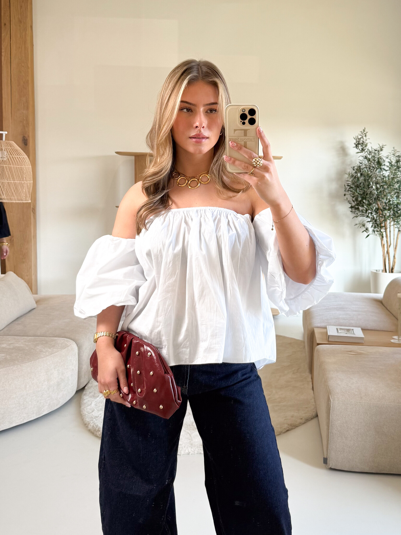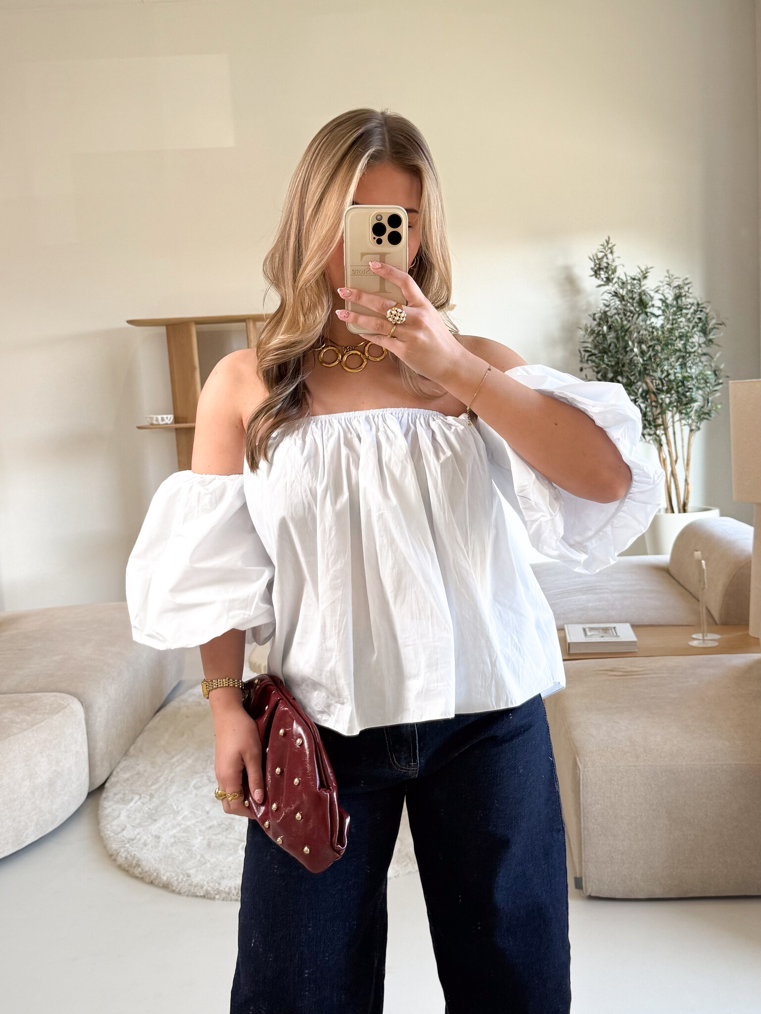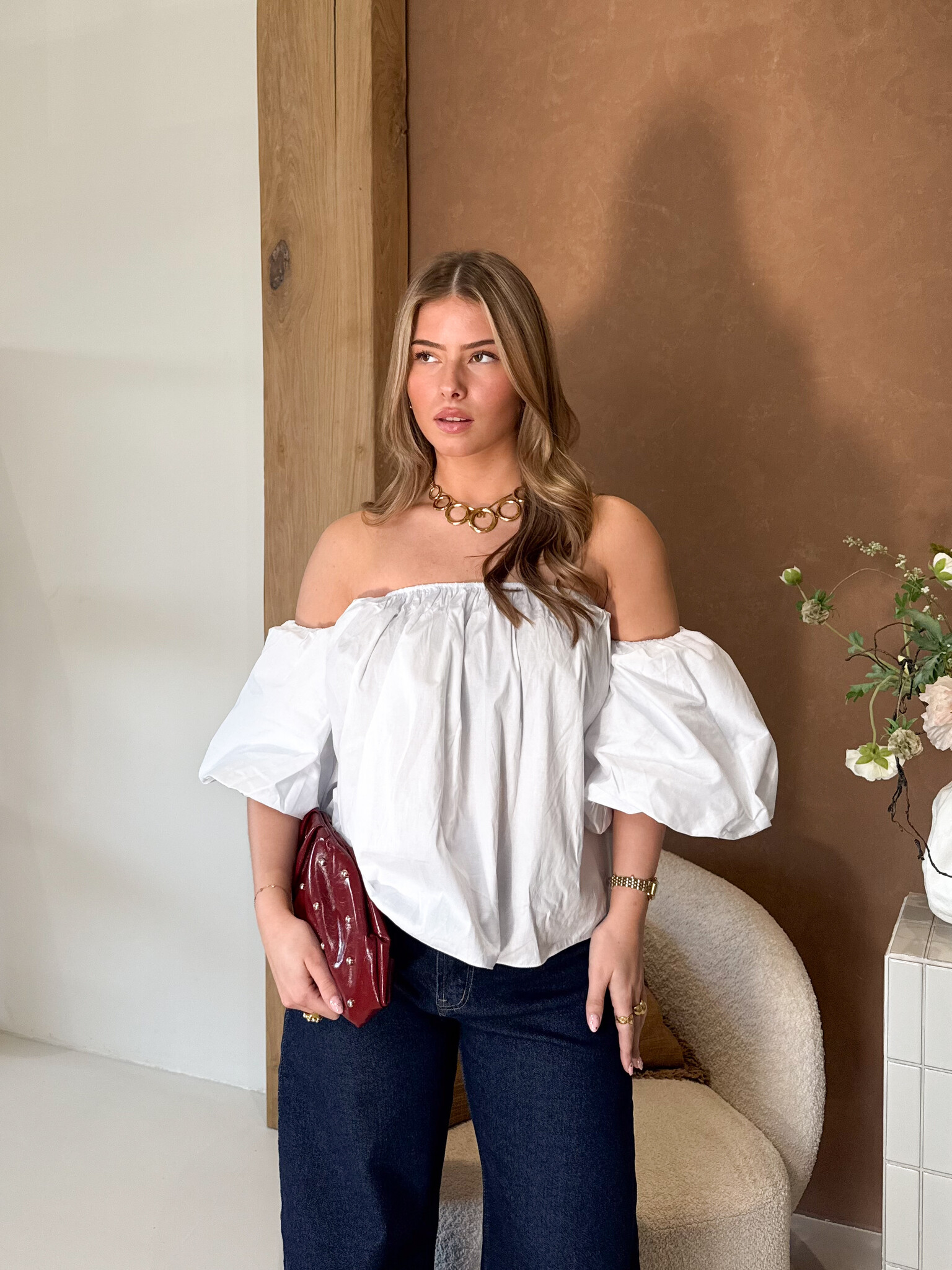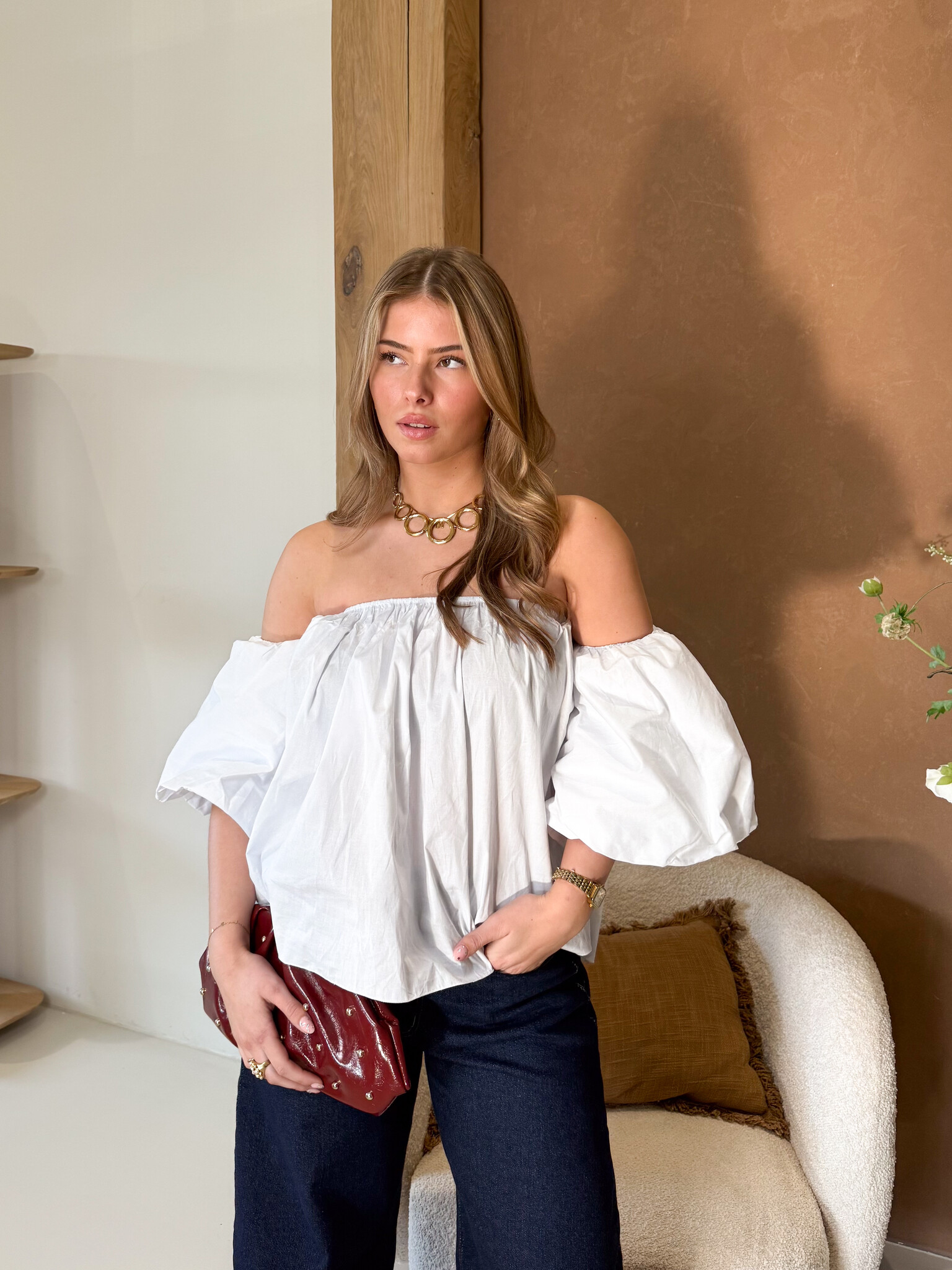 Deze top is gemaakt om indruk te maken. Het off shoulder design geeft een elegante en vrouwelijke uitstraling, terwijl de pofmouwen zorgen voor een speelse en trendy touch. De getailleerde pasvorm sluit mooi aan op het lichaam en accentueert je silhouet op een flattering manier. De korte mouwen maken dit item perfect voor warmere dagen, maar ook ideaal om te combineren met een blazer voor een avondlook. Draag ‘m met een jeans voor casual chic of met een pantalon of rok voor een classy outfit. Een echte musthave voor meiden die houden van stijl met een vleugje flair ✨