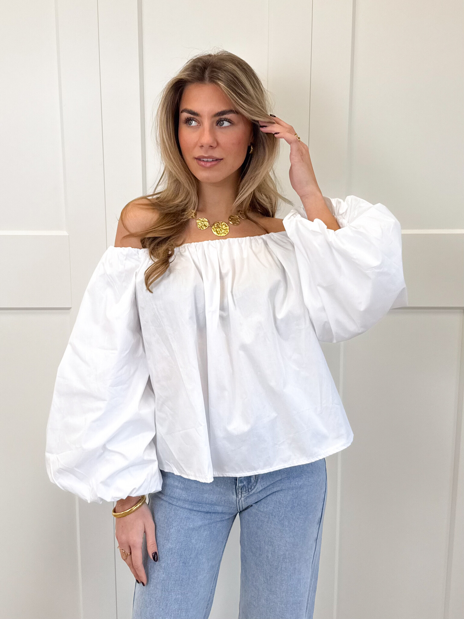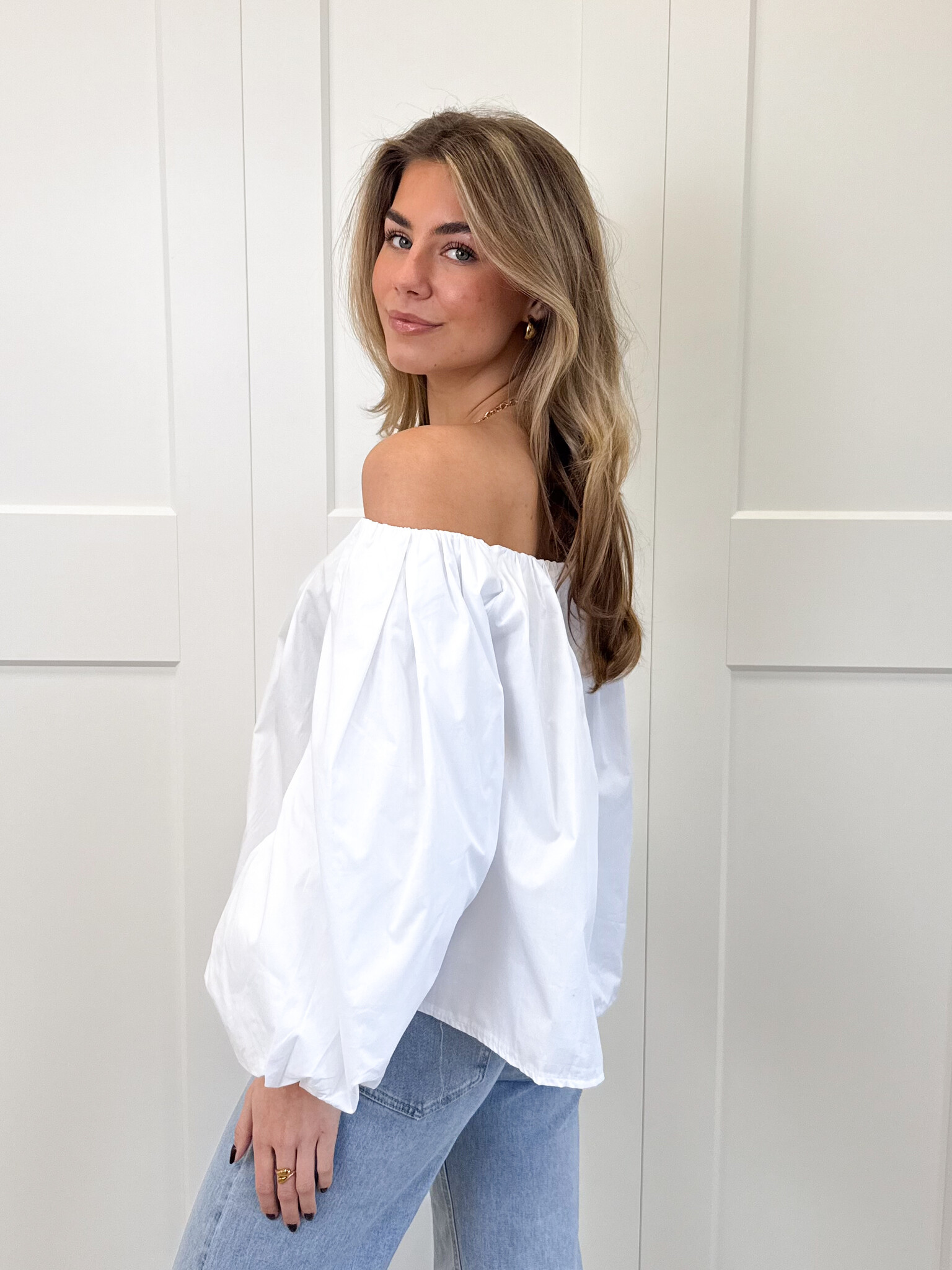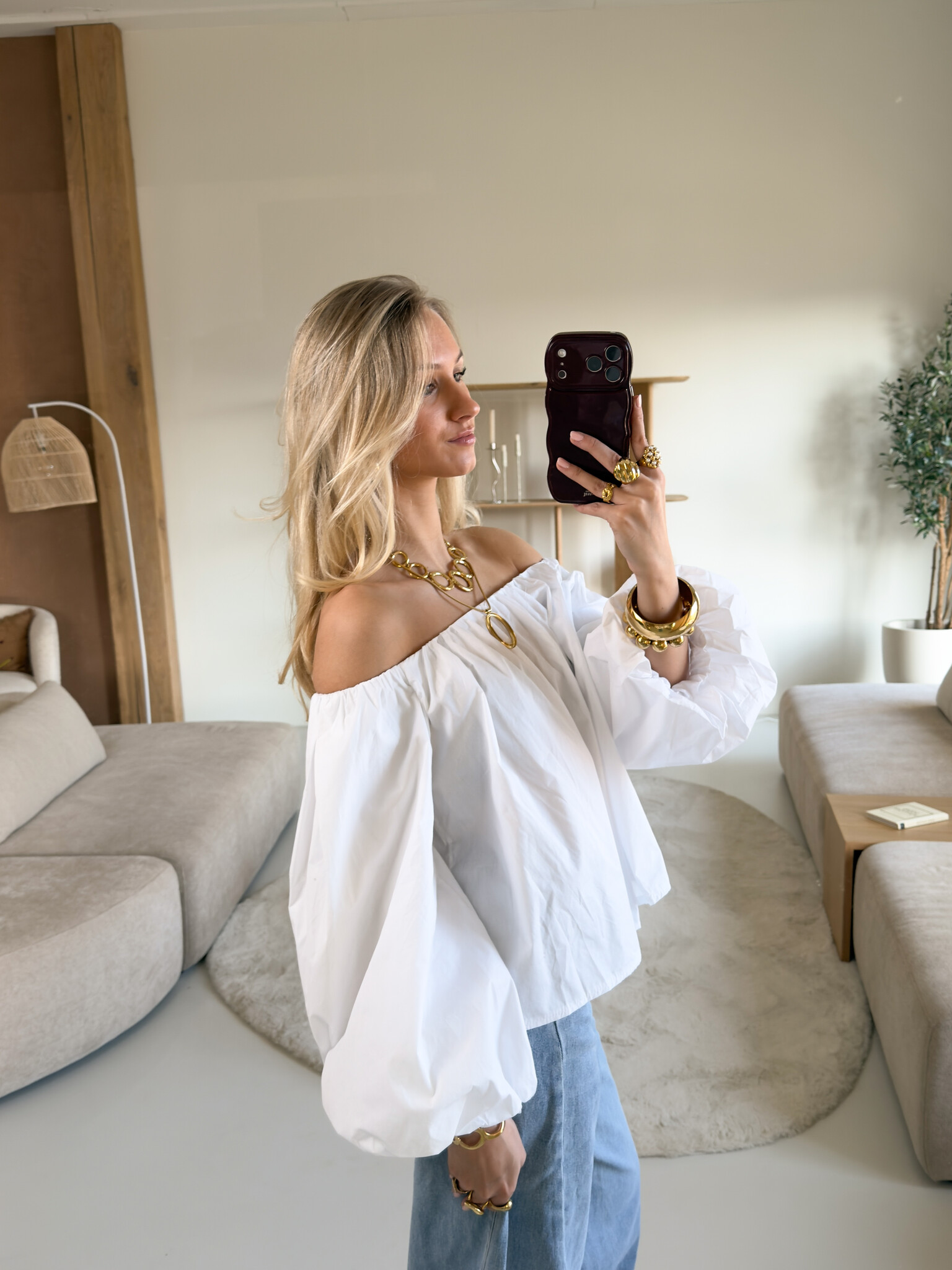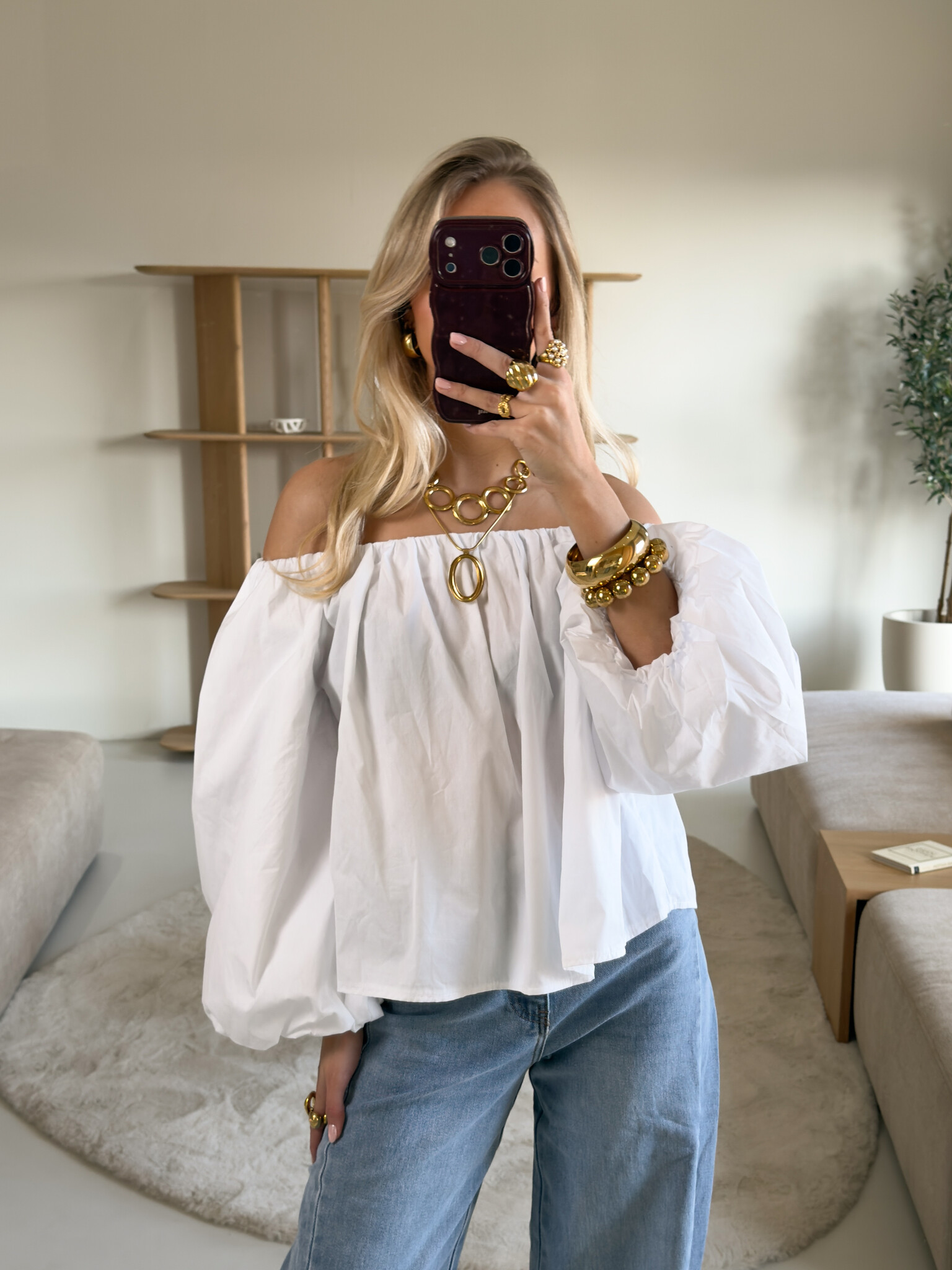 Deze witte off-shoulder top is een must-have voor elke girly garderobe. De speelse pofmouwen geven een romantische en vrouwelijke touch, terwijl de off-shoulder pasvorm zorgt voor een elegante, zomerse uitstraling. Het zachte materiaal voelt comfortabel aan en laat de top perfect vallen, waardoor hij geschikt is voor zowel casual dagen, lunchdates als zonnige uitjes met vriendinnen. Combineer de top met een high waist jeans, rok of shorts voor een effortless, girly look die zowel comfy als fashionable is. Serina is een veelzijdig item dat je outfits direct een charmante en stijlvolle twist geeft, zodat je er overal stralend uitziet.