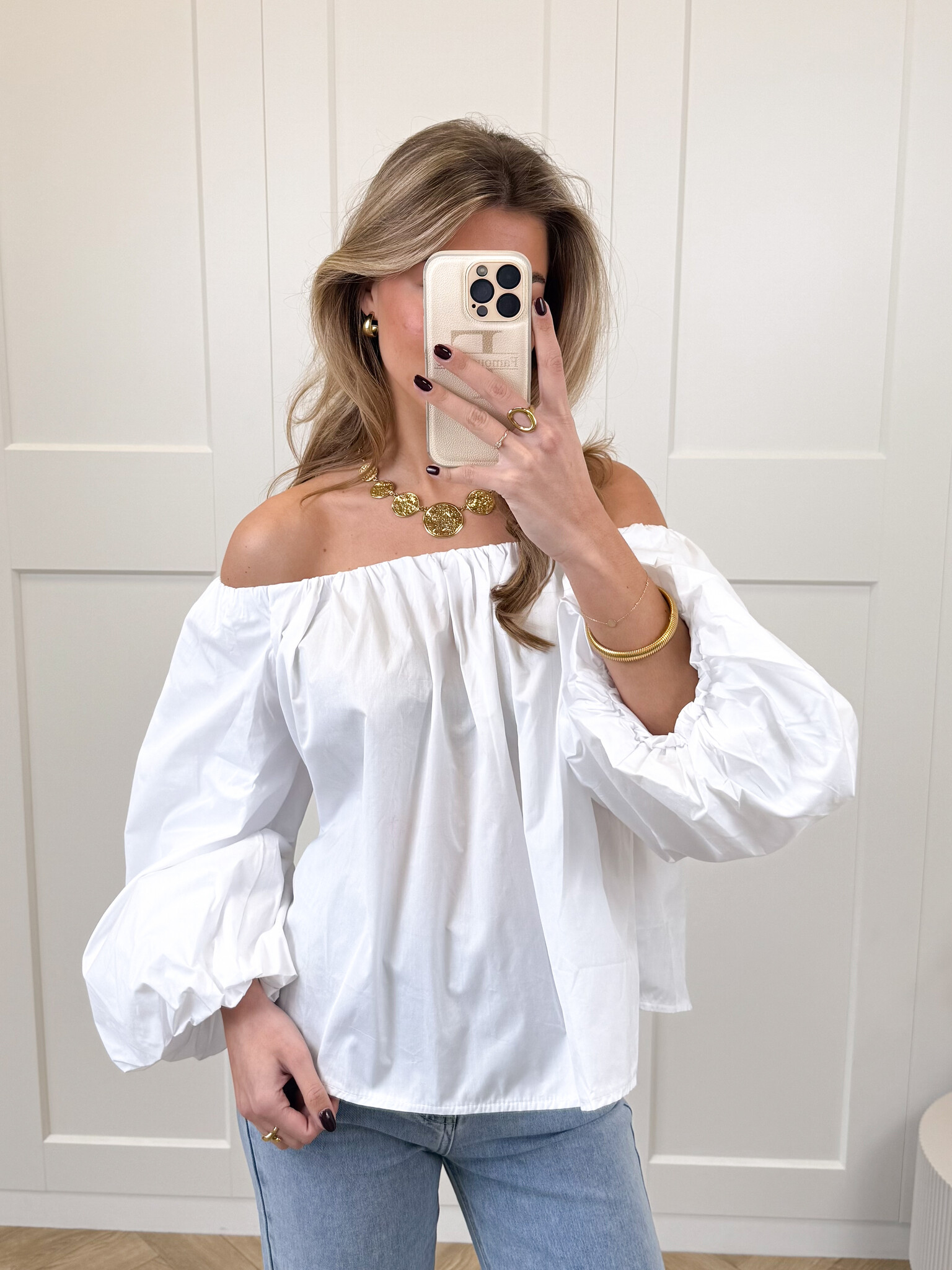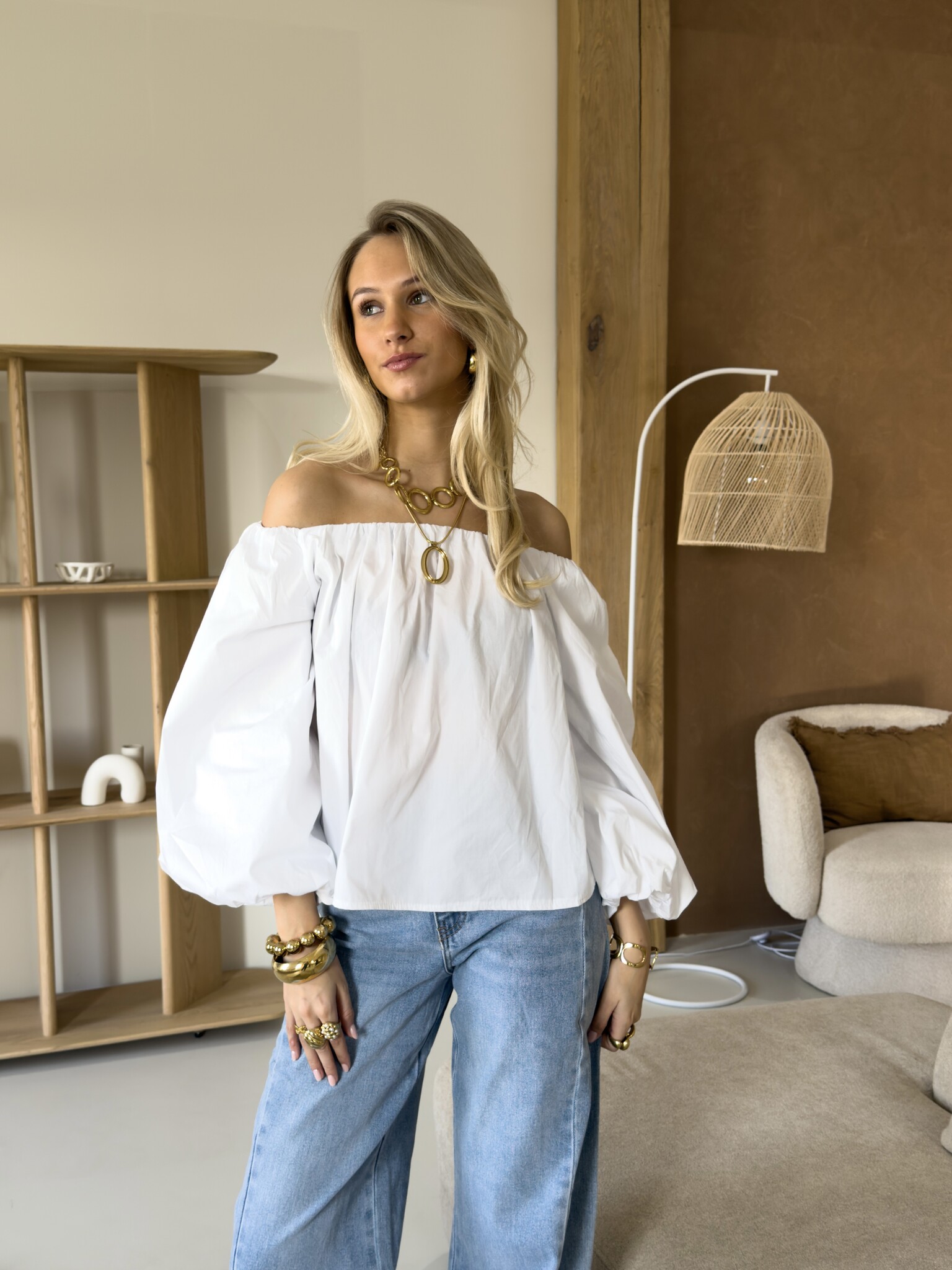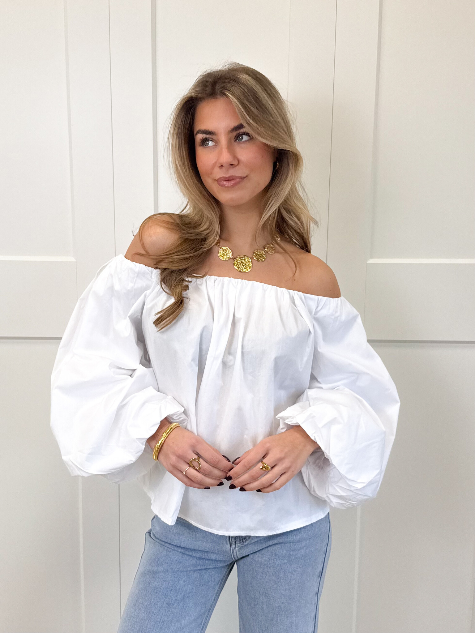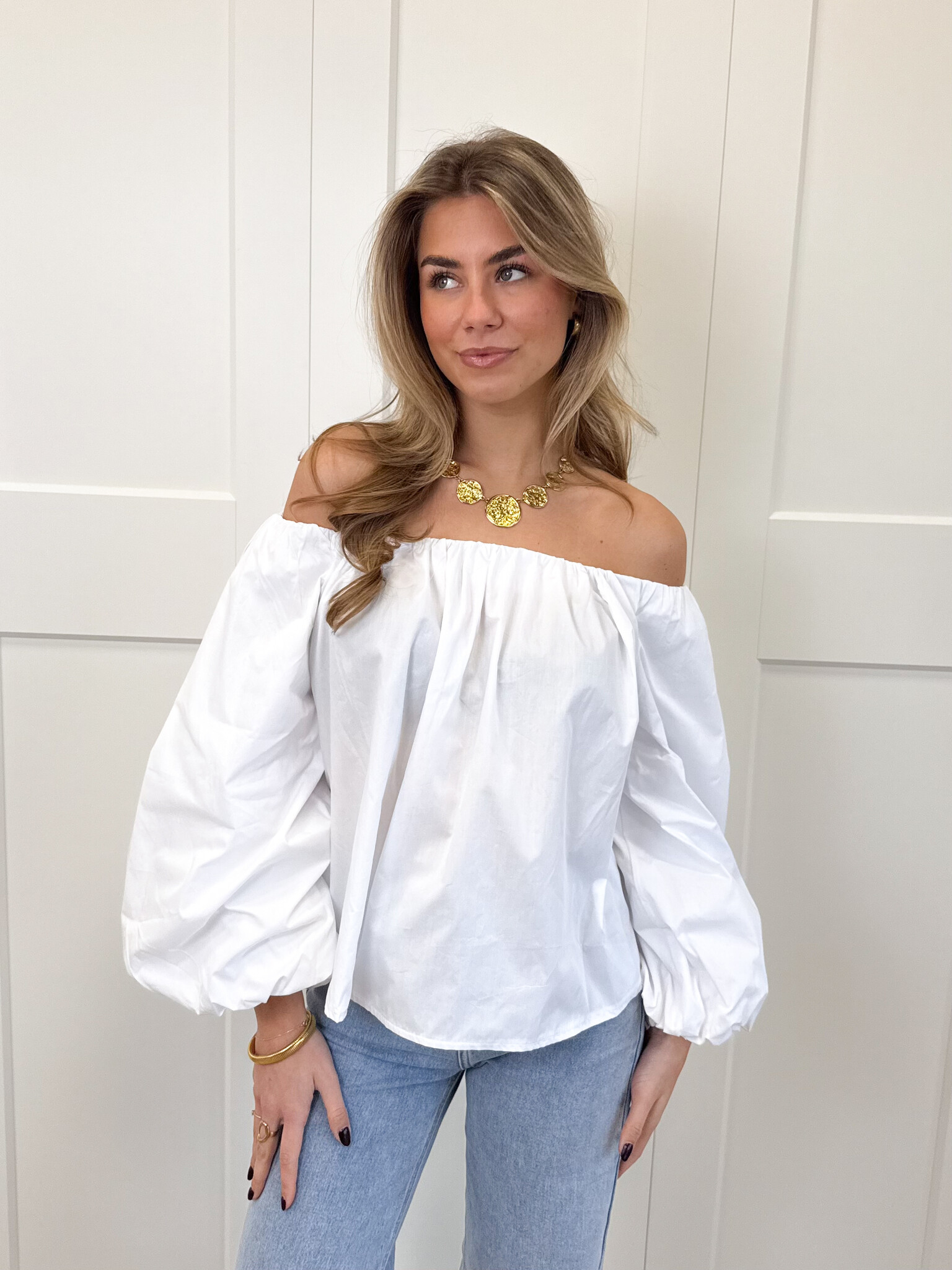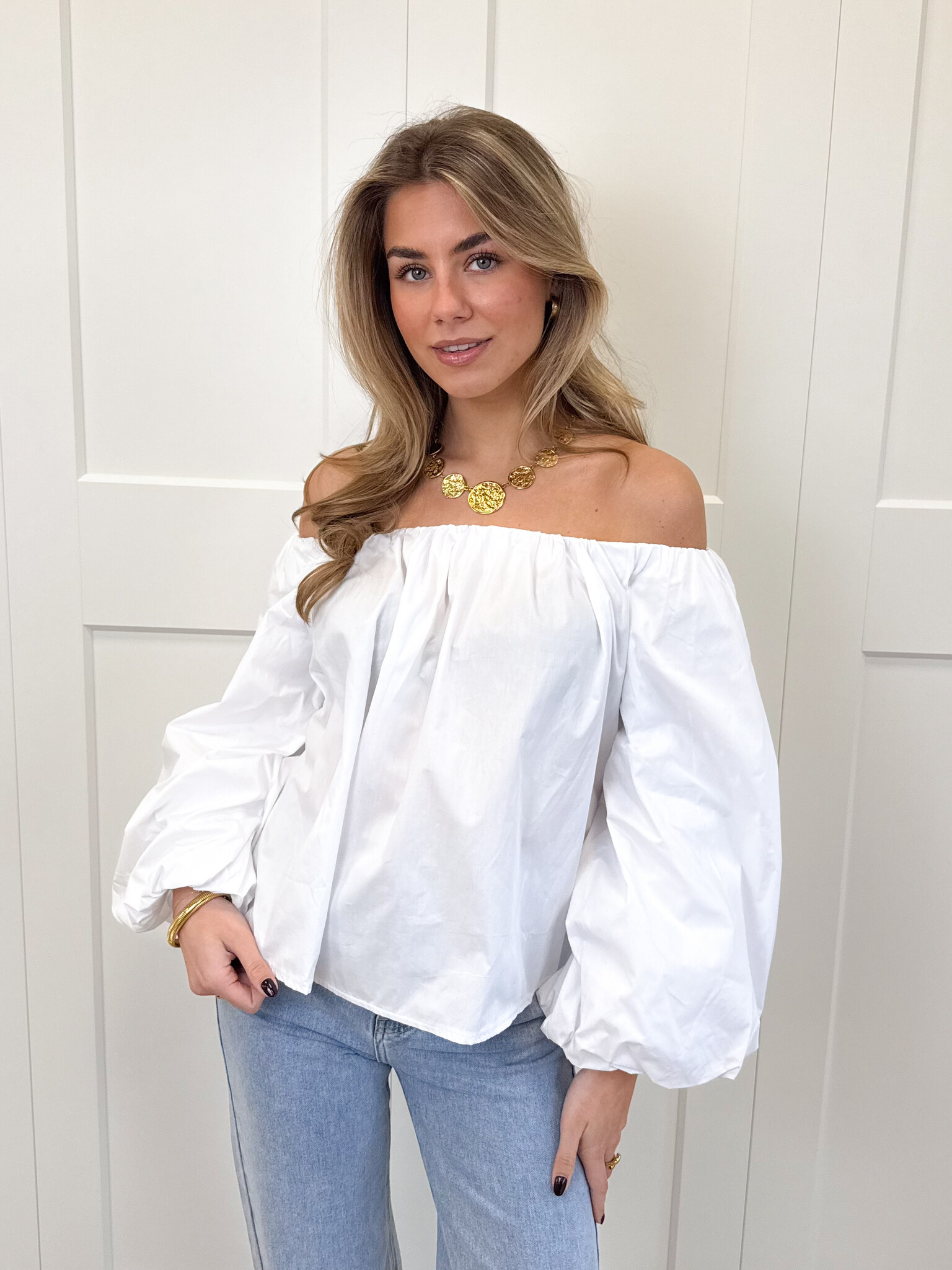 Deze witte off-shoulder top is een must-have voor elke girly garderobe. De speelse pofmouwen geven een romantische en vrouwelijke touch, terwijl de off-shoulder pasvorm zorgt voor een elegante, zomerse uitstraling. Het zachte materiaal voelt comfortabel aan en laat de top perfect vallen, waardoor hij geschikt is voor zowel casual dagen, lunchdates als zonnige uitjes met vriendinnen. Combineer de top met een high waist jeans, rok of shorts voor een effortless, girly look die zowel comfy als fashionable is. Serina is een veelzijdig item dat je outfits direct een charmante en stijlvolle twist geeft, zodat je er overal stralend uitziet.