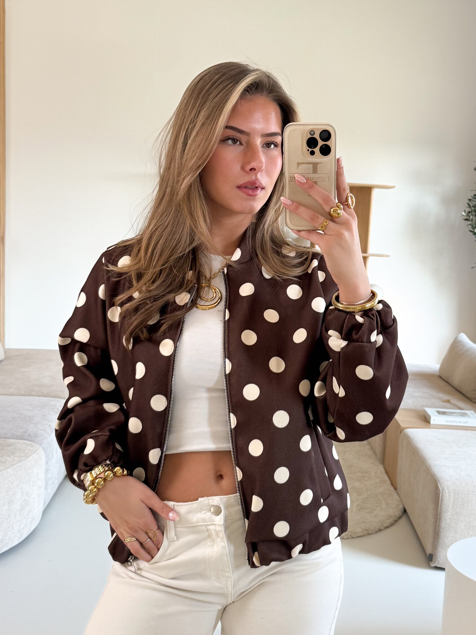 Deze jas met polkadot print is een echte eyecatcher voor je outfit. De speelse stippen geven een girly en frisse uitstraling, terwijl de ritssluiting zorgt voor een praktische en moderne touch. De jas zit comfortabel en is perfect voor dagen waarop je net een extra laagje nodig hebt. Dankzij het trendy design combineer je hem makkelijk met verschillende outfits. Draag hem casual met een jeans en sneakers of style hem met een rok en laarsjes voor een meer fashionable look. Ideaal voor een dagje shoppen, een wandeling in de stad of een gezellige lunchdate. Een leuke jas die je outfit meteen meer karakter geeft.