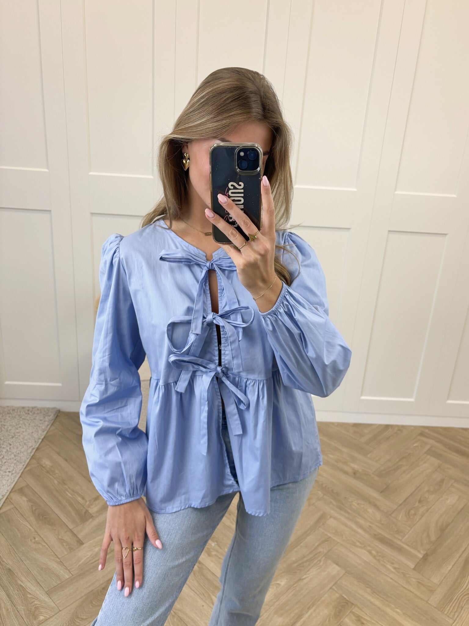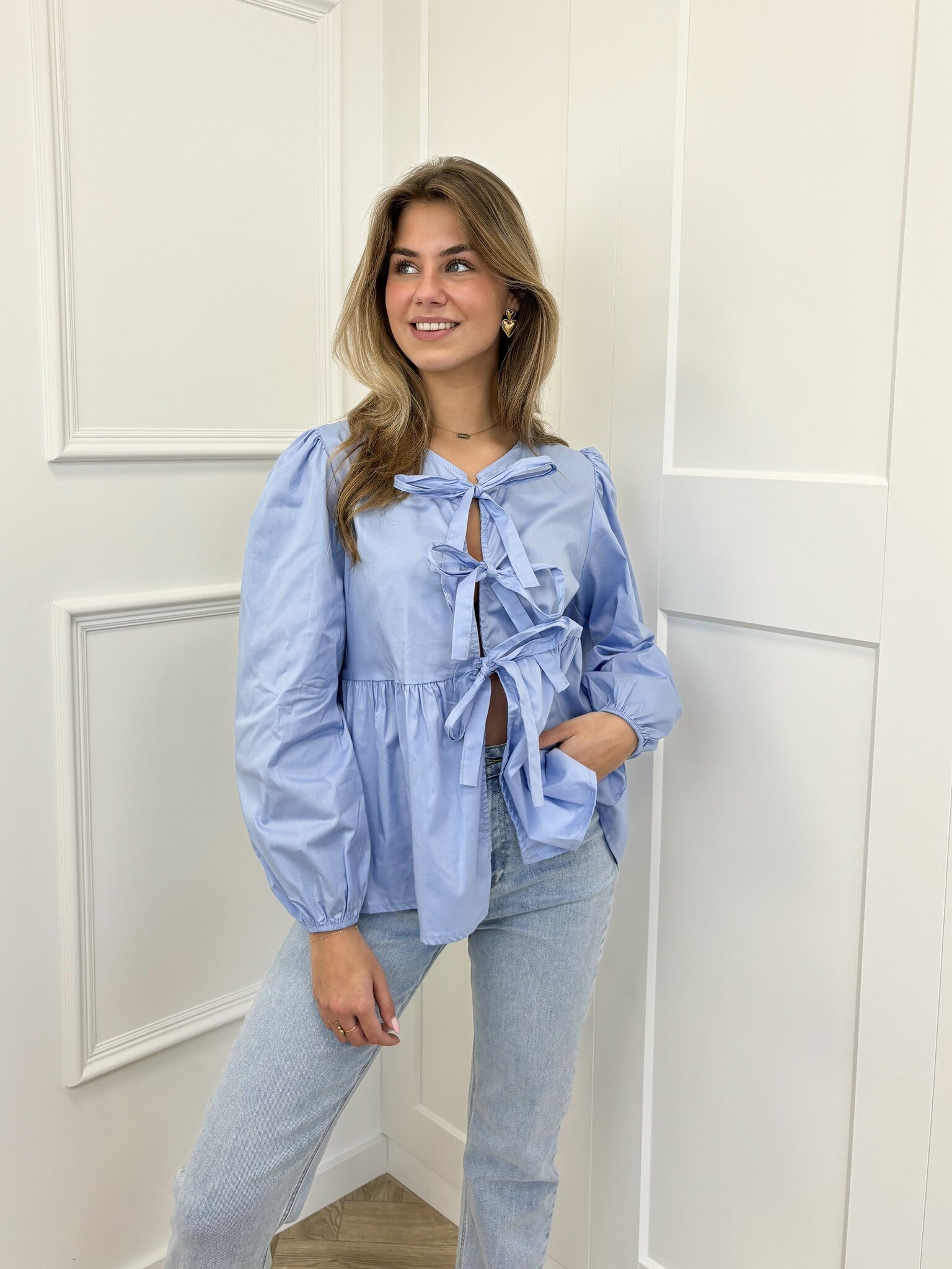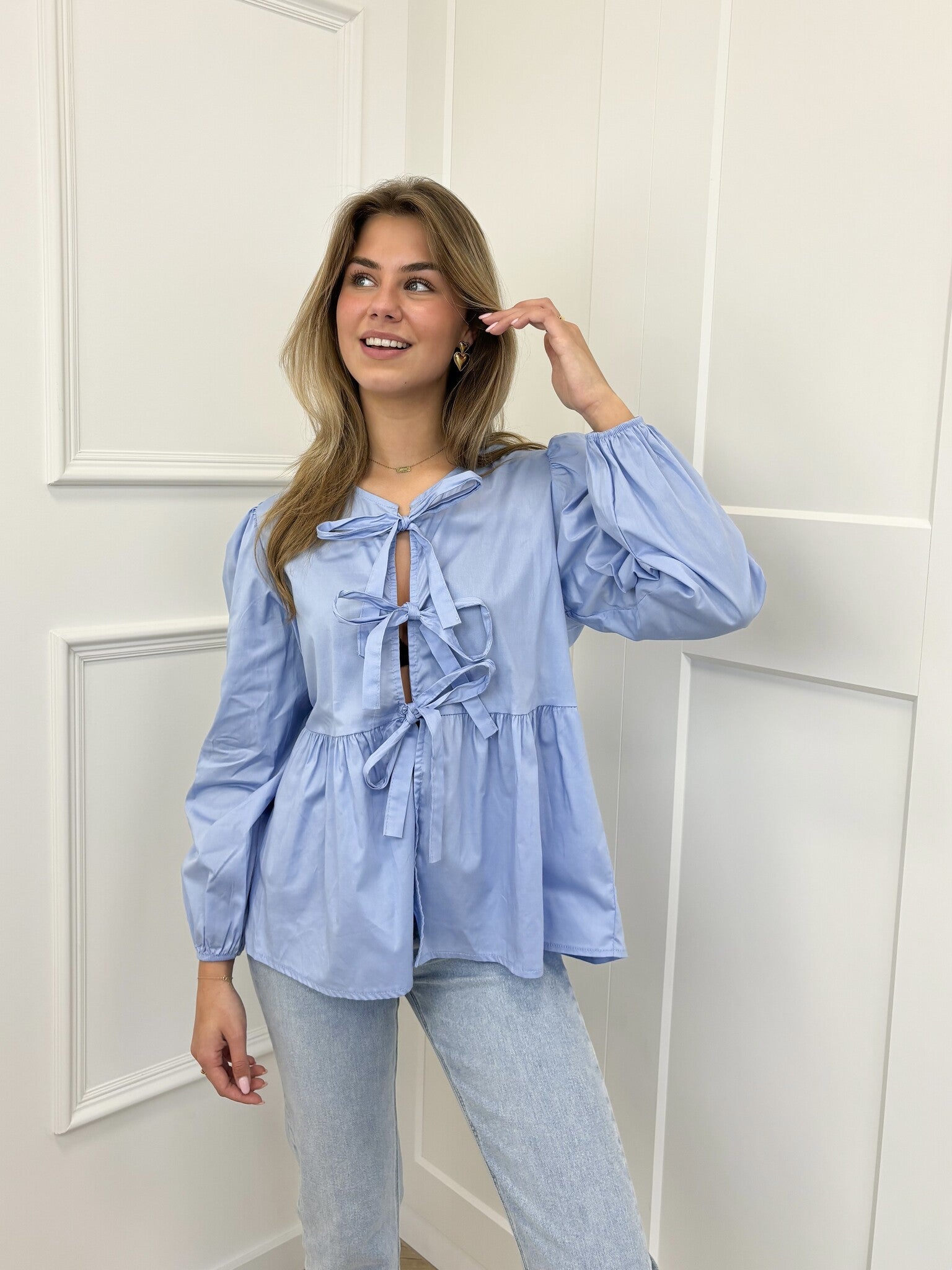 Girlsss... hoe cute is deze blouse met strikjes! Een prachtige blouse met lange mouwen en strikjes aan de voorkant. Leuk te combineren met één van onze jeans of pantalon. Je shopt dit blousje in meerdere kleuren!