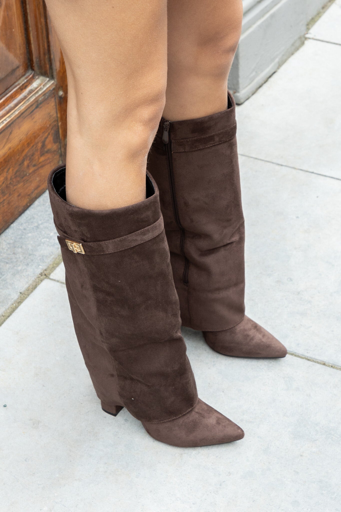 Ontmoet je nieuwe favoriete laars: de bruine suédine look met een overlapping en subtiel gouden detail op de schacht voor instant flair. Door de omgevouwen schacht krijgt je look die effortlessly cool vibe, heel easy zonder te veel proberen. Deze laars match je moeiteloos met alles: denk aan een jurk, skort of klassieke jeans, en je bent ready to slay!