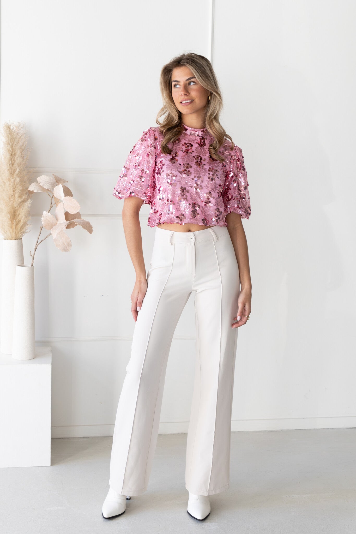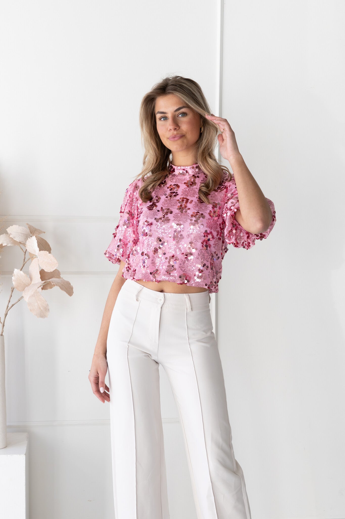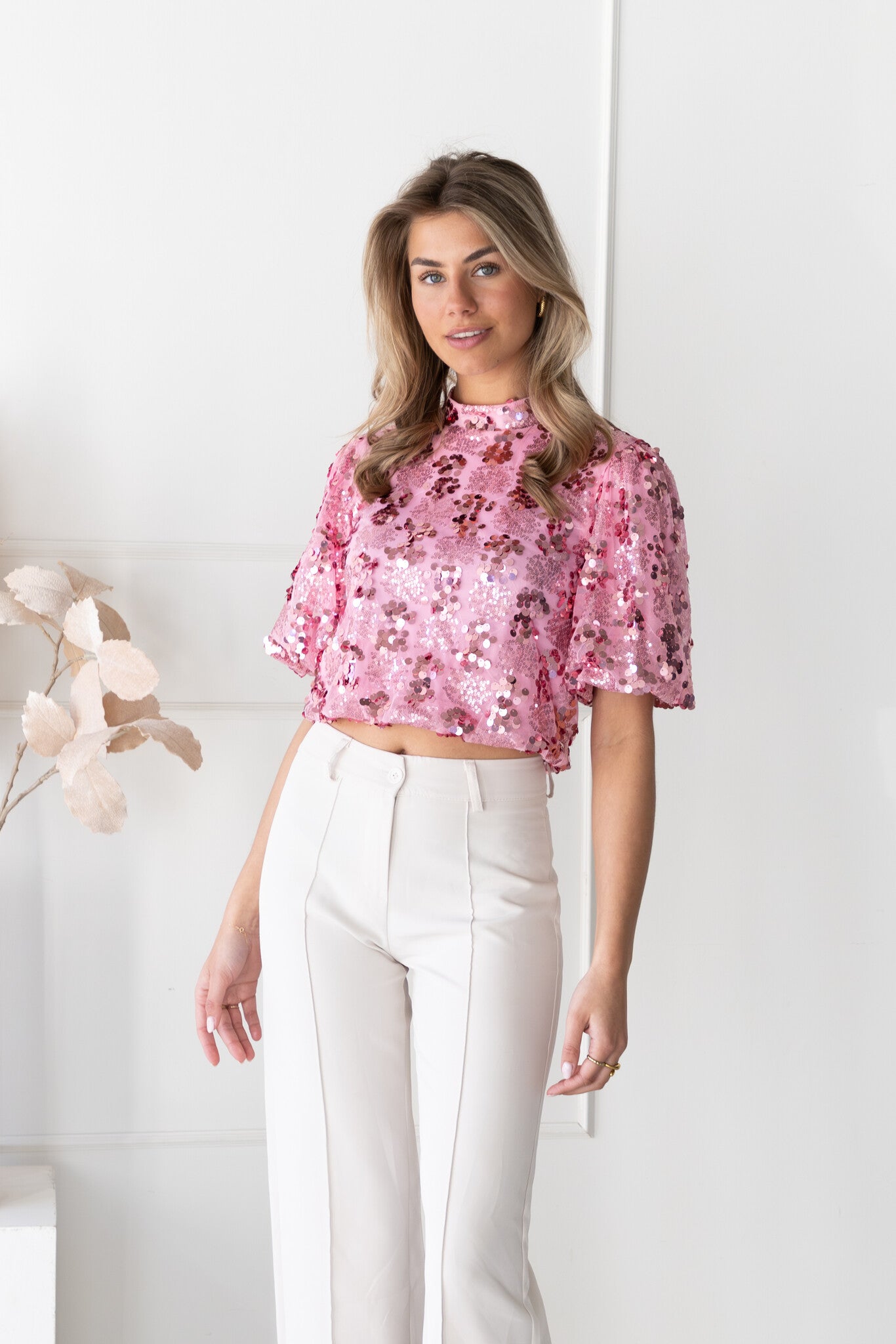 Hoe amazing is deze roze glitter top! De pofmouwen maakt deze party top een echte eye catcher. Het heeft een kleine open back en er zit een knoopsluiting aan de achterkant van de nek. Perfect voor de aankomende feestdagen of avondjes stappen met vriendinnen. Een echte eye catcher waardoor je de hele avond straalt in dit leuke pailletten feest topje!