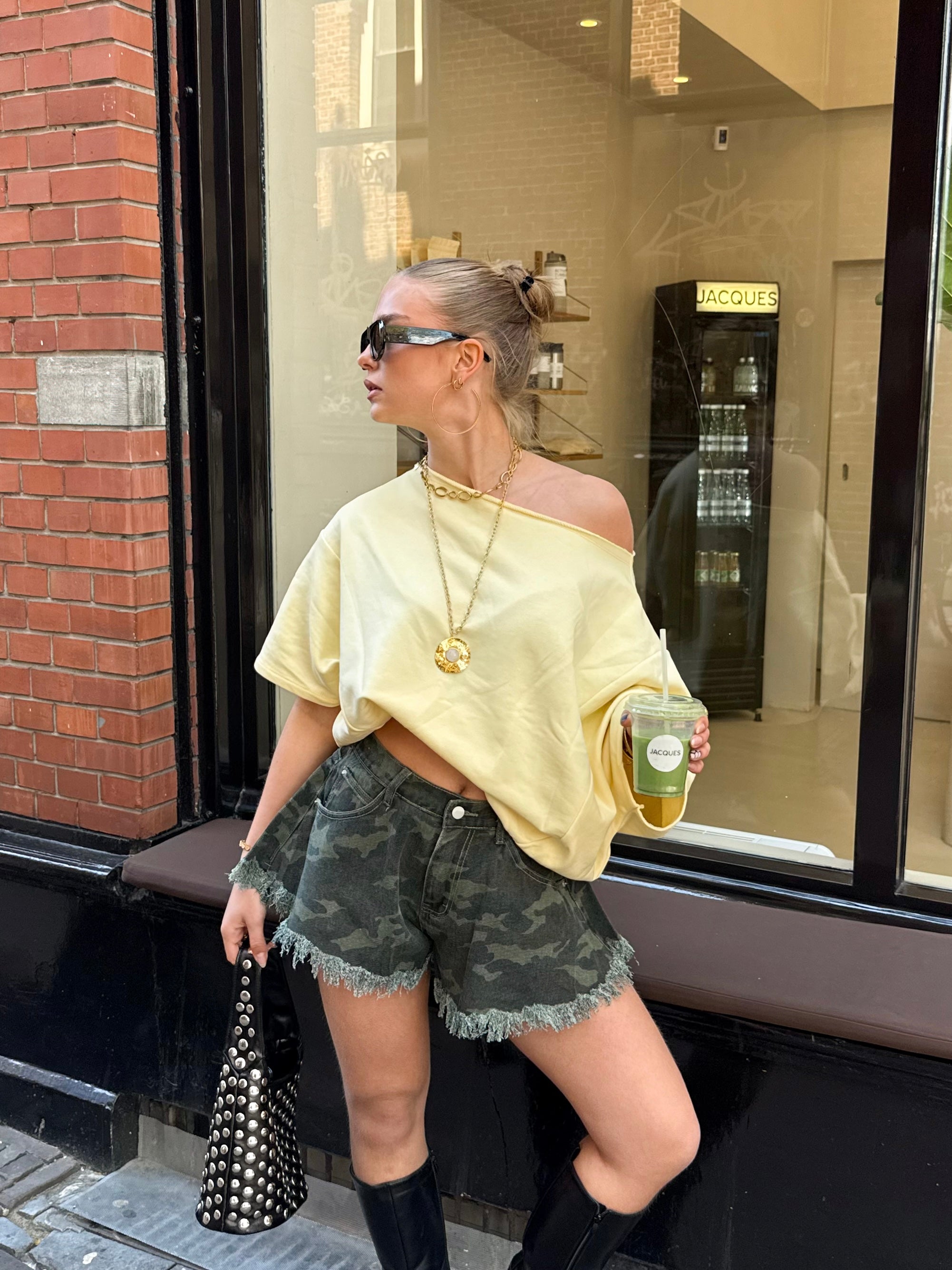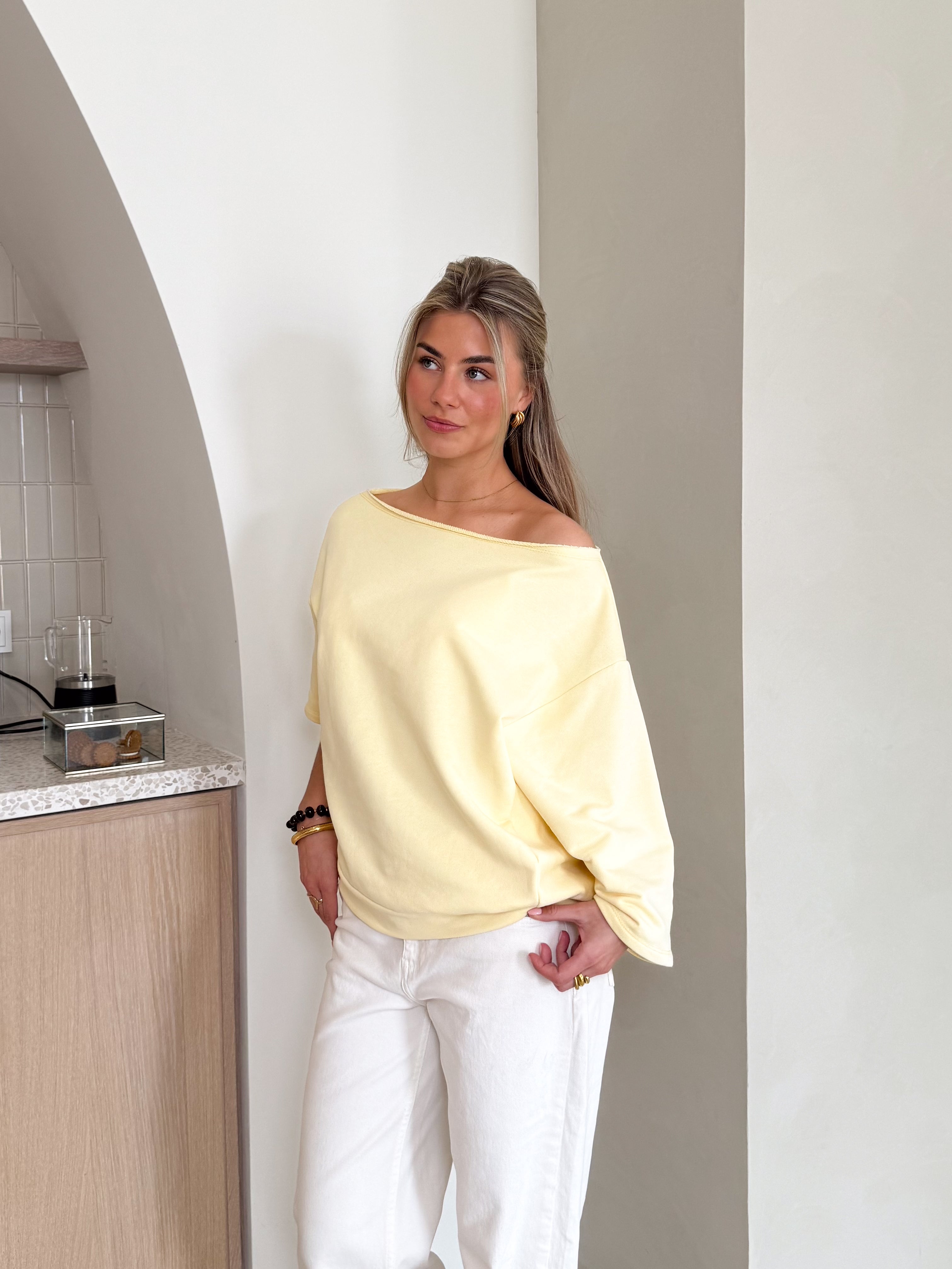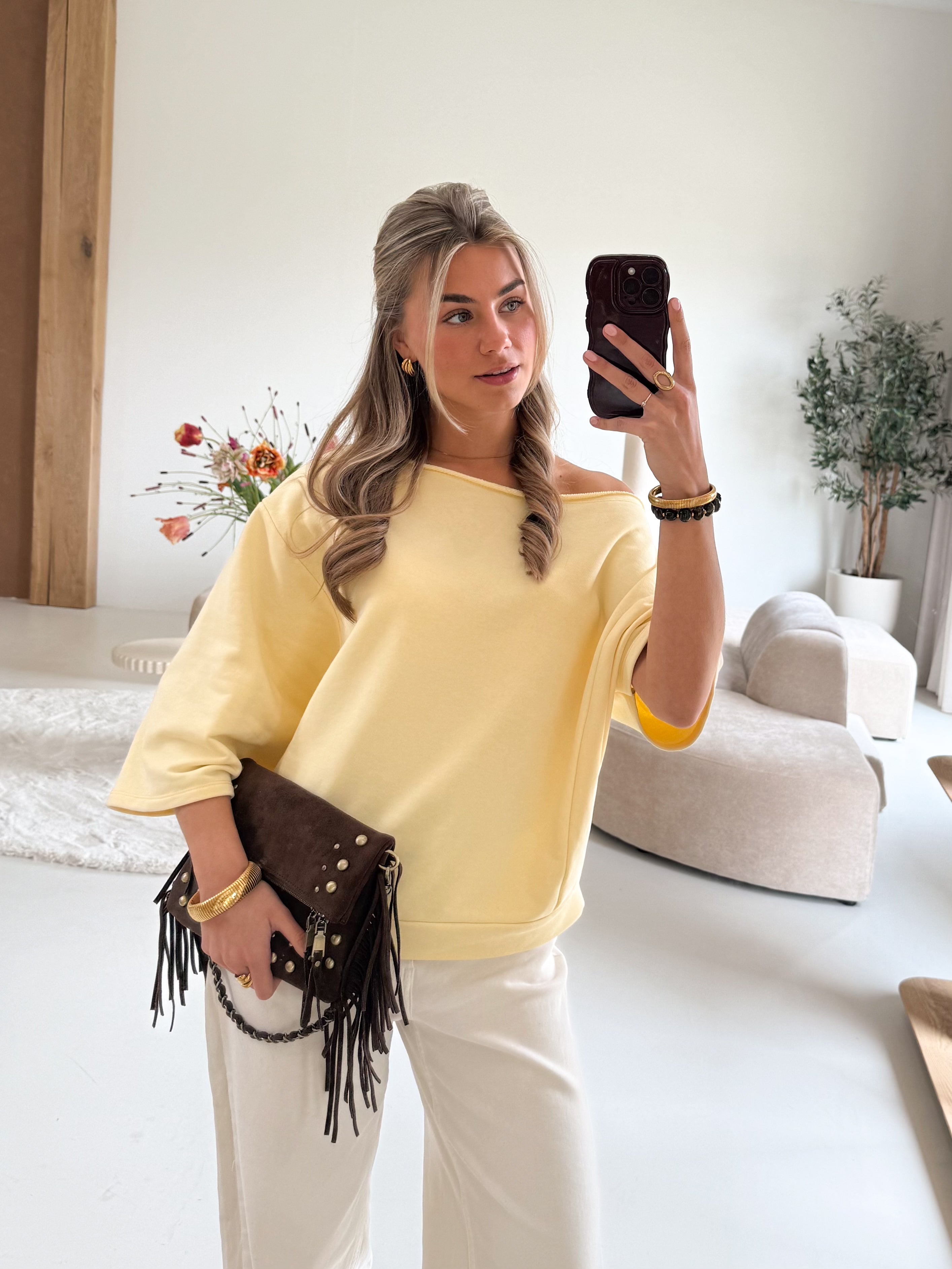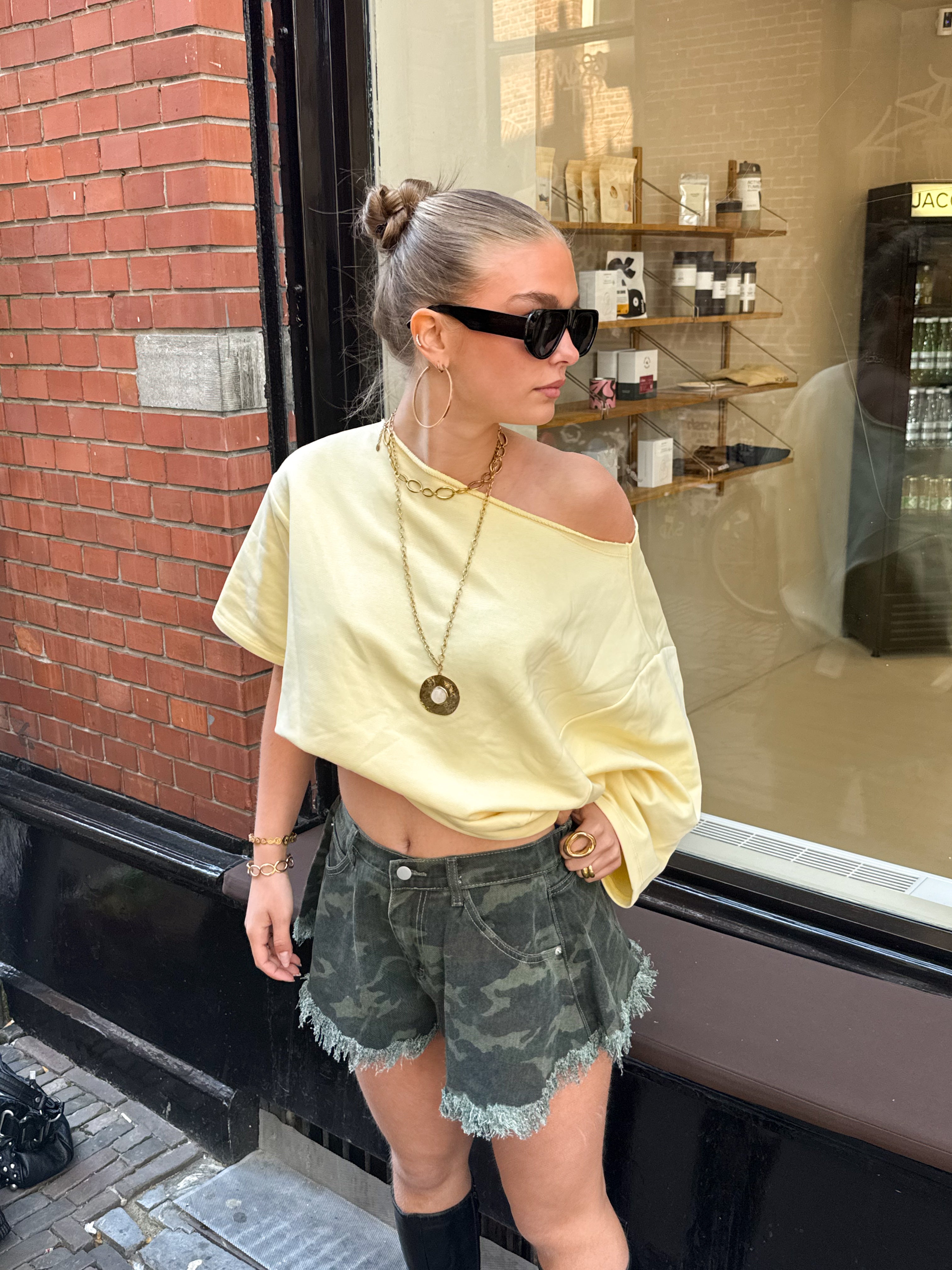 De Imke sweater heeft een off shoulder design met korte mouw voor een speels en trendy effect. Comfortabel en stijlvol tegelijk, ideaal voor een casual dagje uit of een girly everyday look met een fashionable twist.