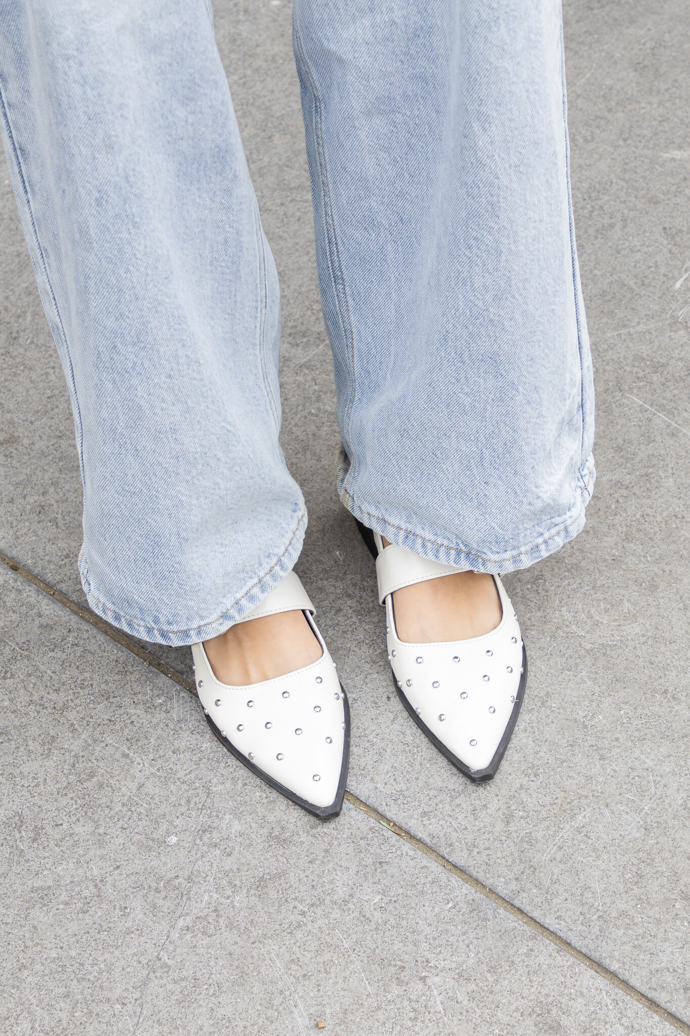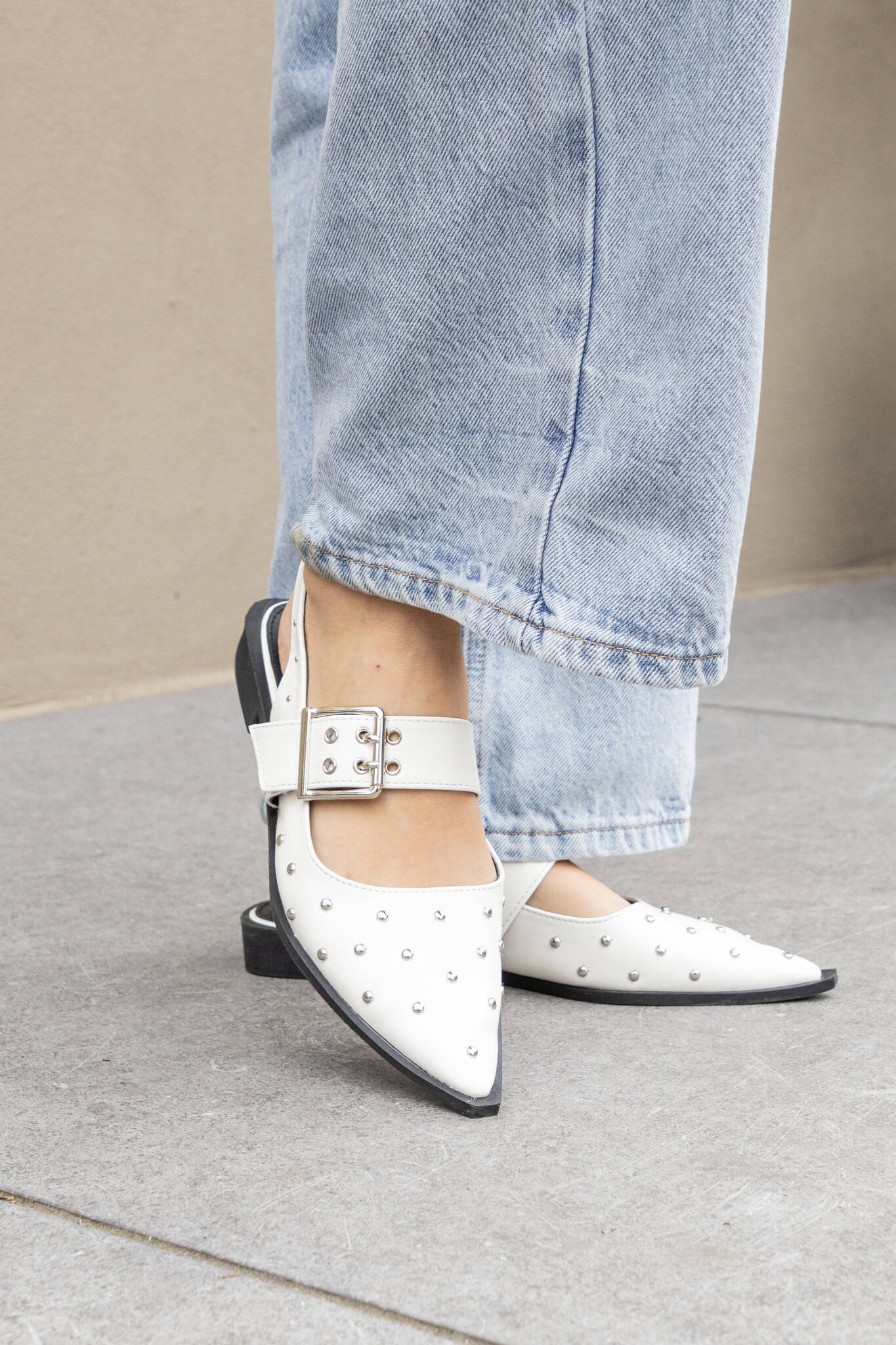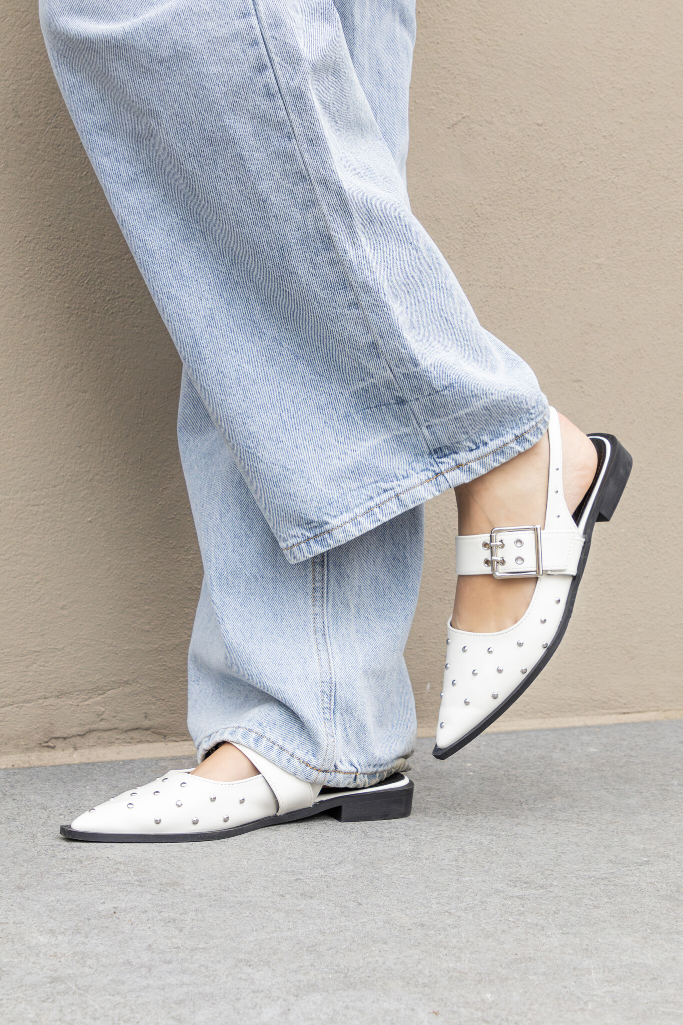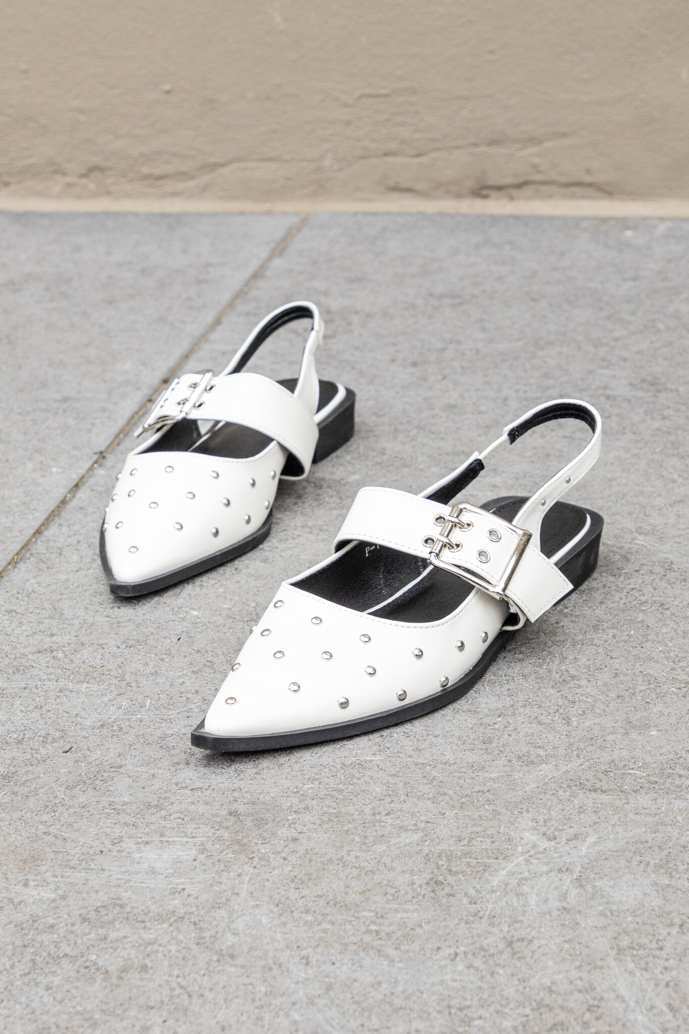 Deze loafers hebben een opvallende zilveren gesp en puntige neus. De slingback style is de look van dit moment! Door de studs krijgt je look een edgy touch. De lakleren instapschoentjes hebben een platte zool met subtiele hak wat zorgt voor een comfortabele chique look.