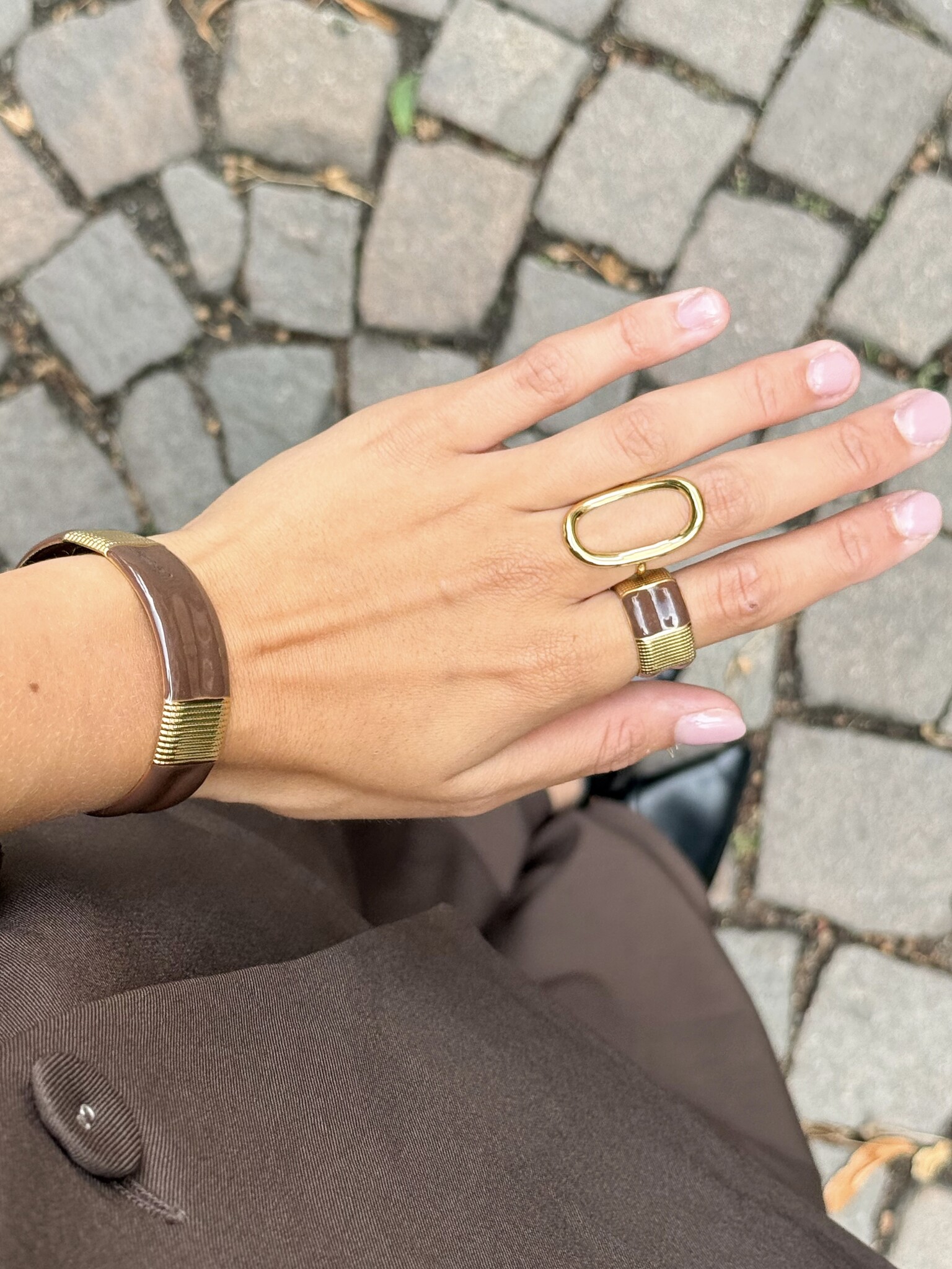Deze gouden ring van stainless steel is een echte eyecatcher. Het minimalistische design met ovale vorm geeft een moderne en elegante uitstraling, terwijl het grote formaat zorgt voor een statement look. Dankzij de verstelbare pasvorm draag je hem altijd comfortabel. Een tijdloos sieraad dat perfect combineert met andere gouden accessoires of juist solo schittert.