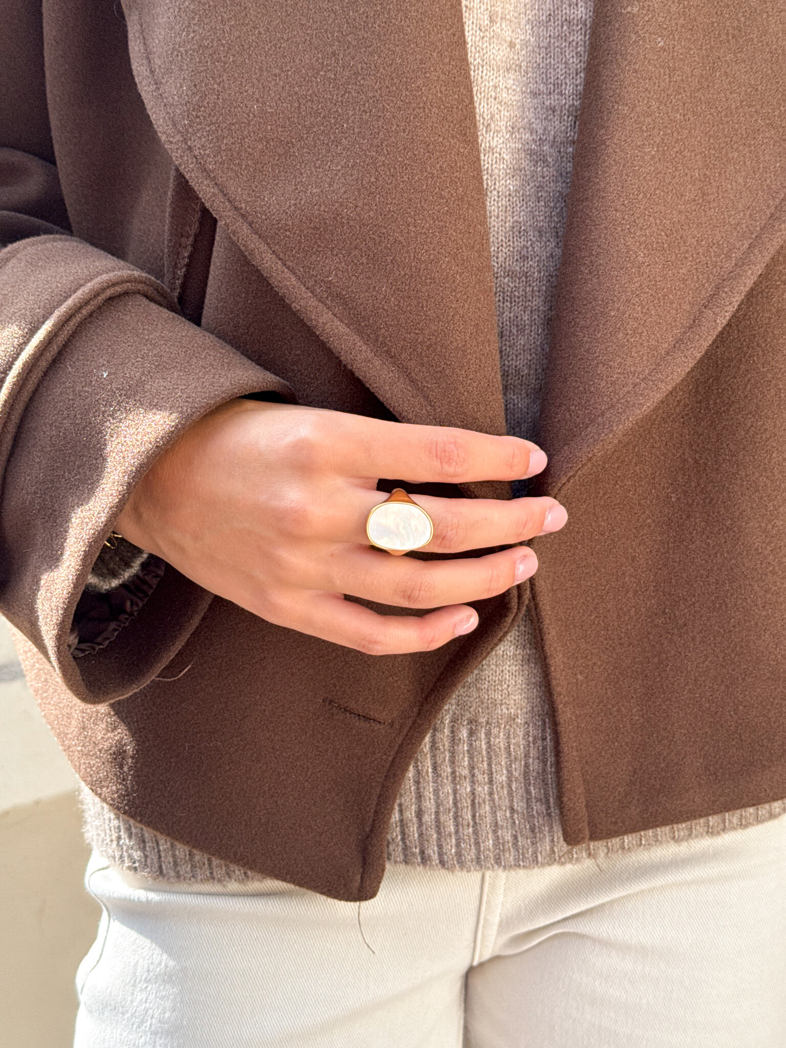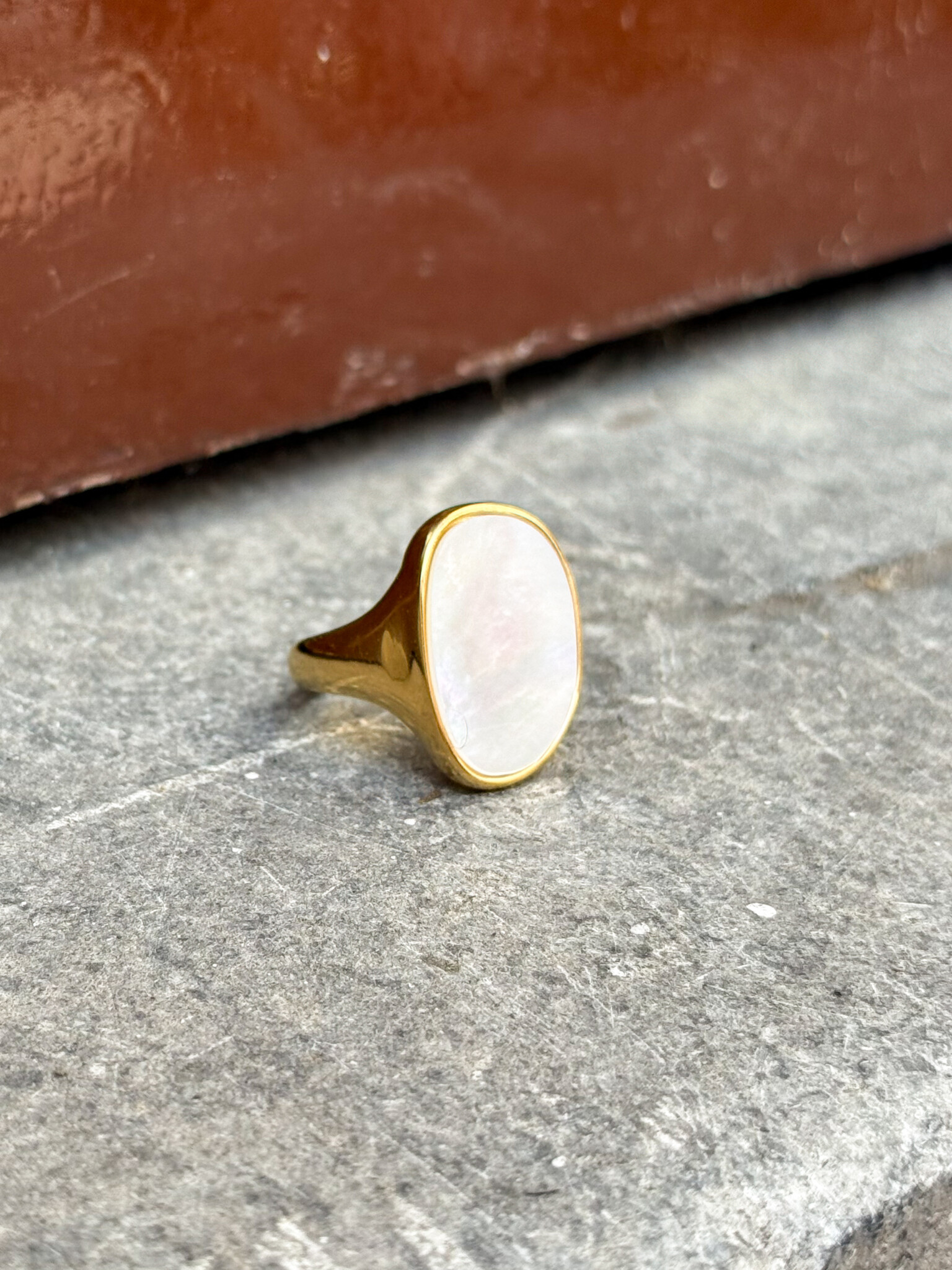 Maak kennis met Pearl Love. De ring die jouw sieradencollectie laat stralen. Deze verstelbare ring heeft een groot ovale oppervlak van parelmoer dat prachtig het licht vangt en zorgt voor een luxe uitstraling. Het ontwerp is elegant maar ook krachtig, waardoor je hem solo kunt dragen als statement piece of combineren met andere gouden sieraden voor een chique mix. Tijdloos, stijlvol en altijd on-trend.