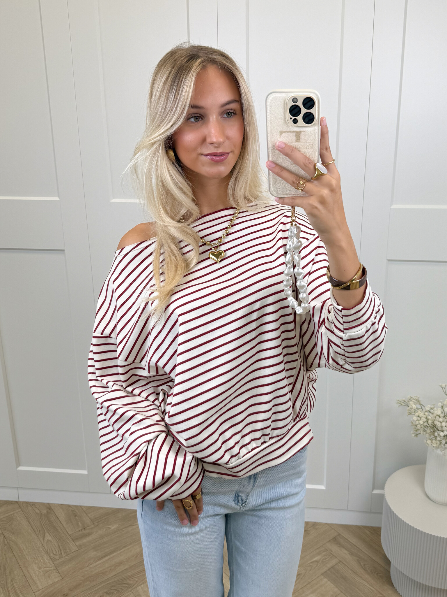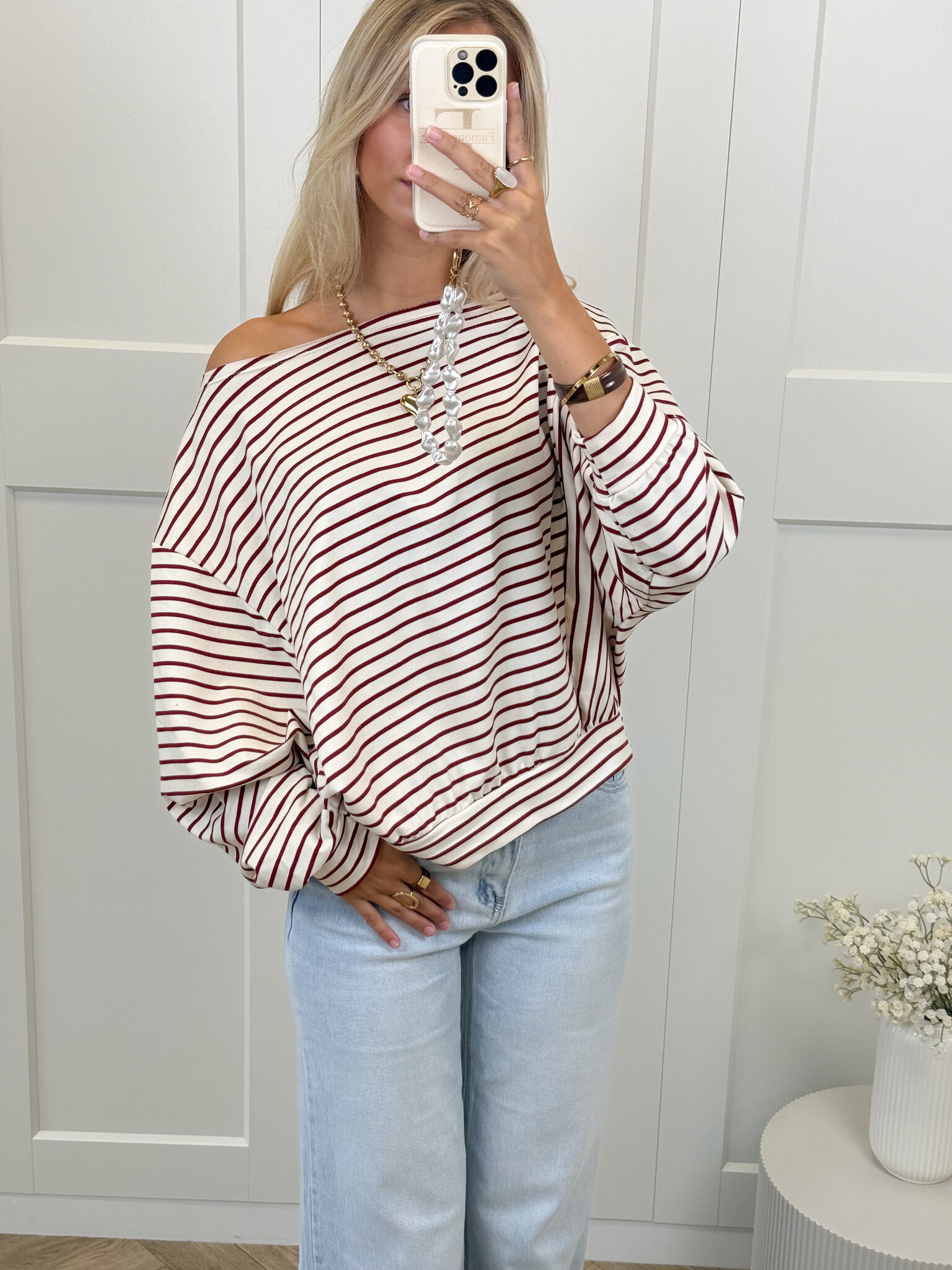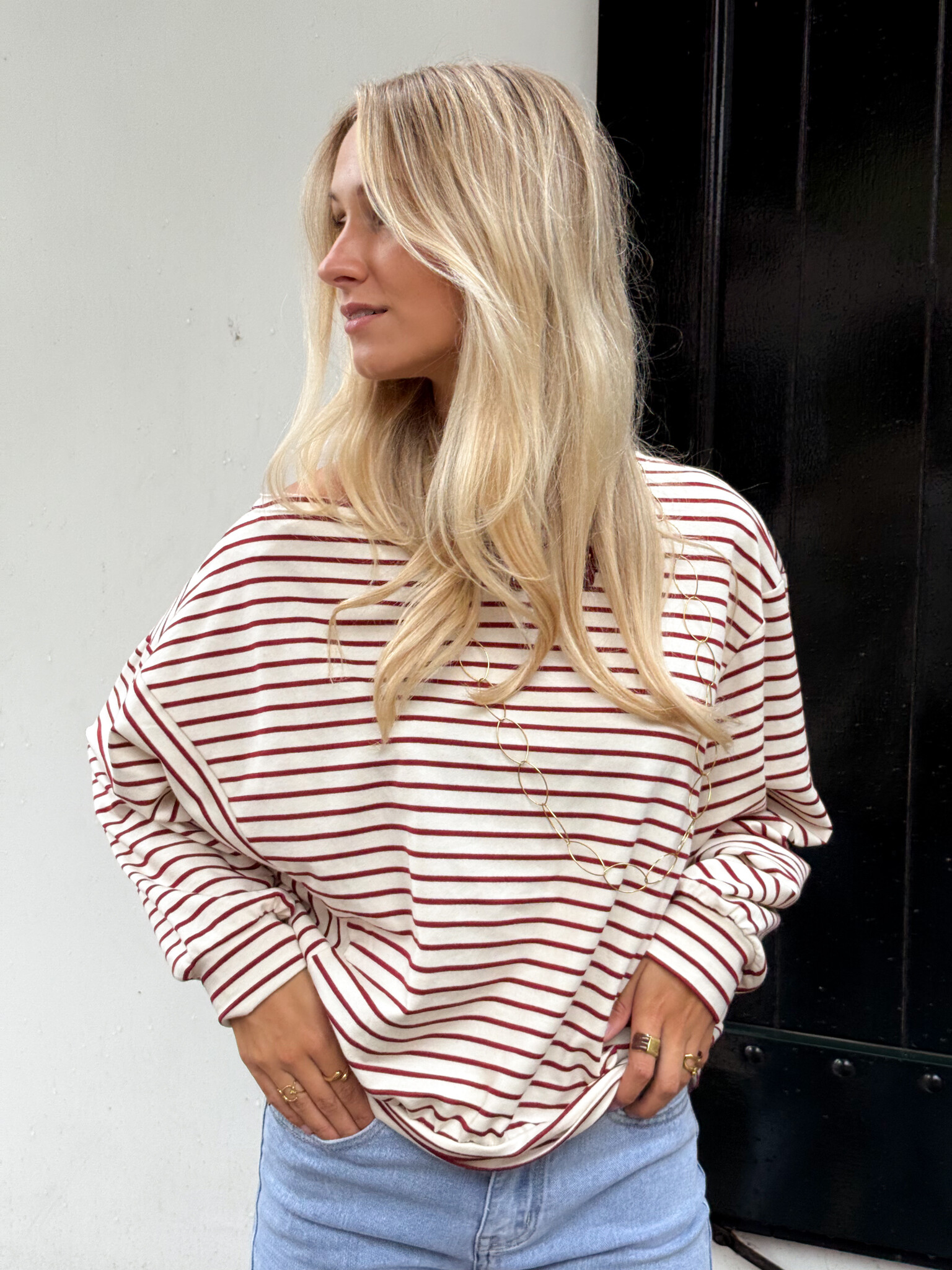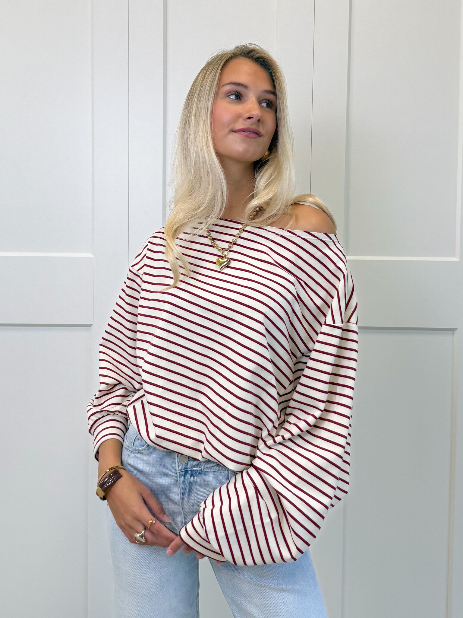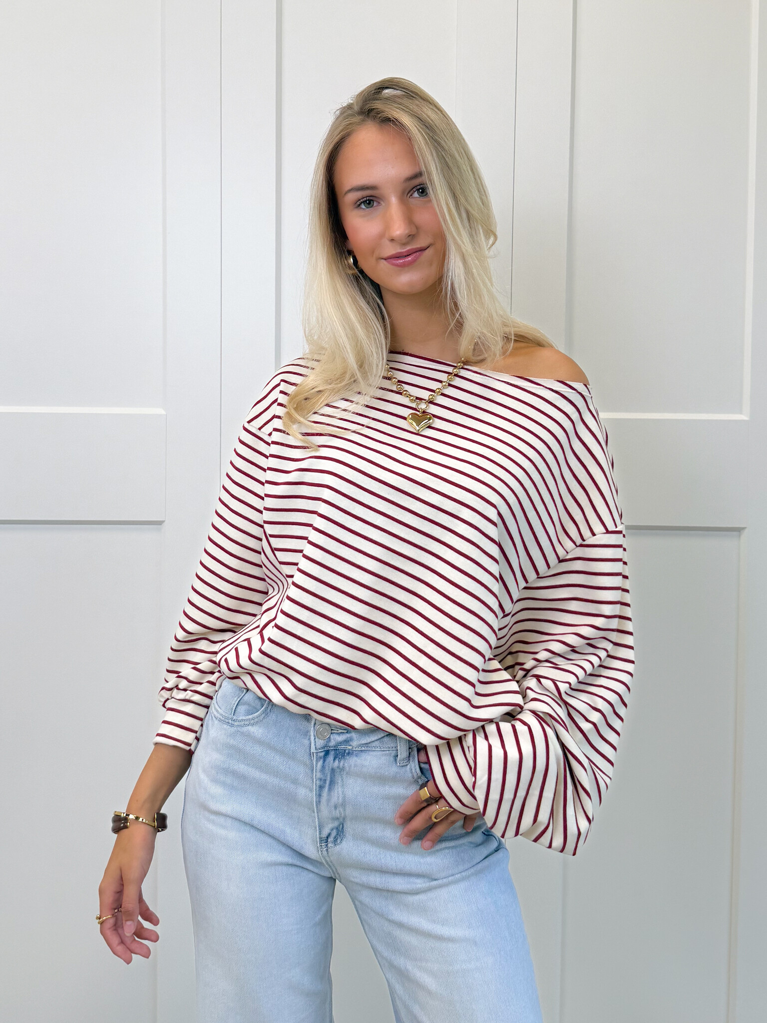 Een trui die je outfit meteen die effortless vibe geeft: dit gestreepte model is echt een musthave. Door de losse, wijde fit zit hij heerlijk comfortabel, terwijl de strakkere onderkant bij de taille zorgt dat je look toch mooi in vorm blijft. En het leukste detail? Je kunt hem offshoulder dragen, waardoor je outfit meteen een speelse en vrouwelijke uitstraling krijgt.