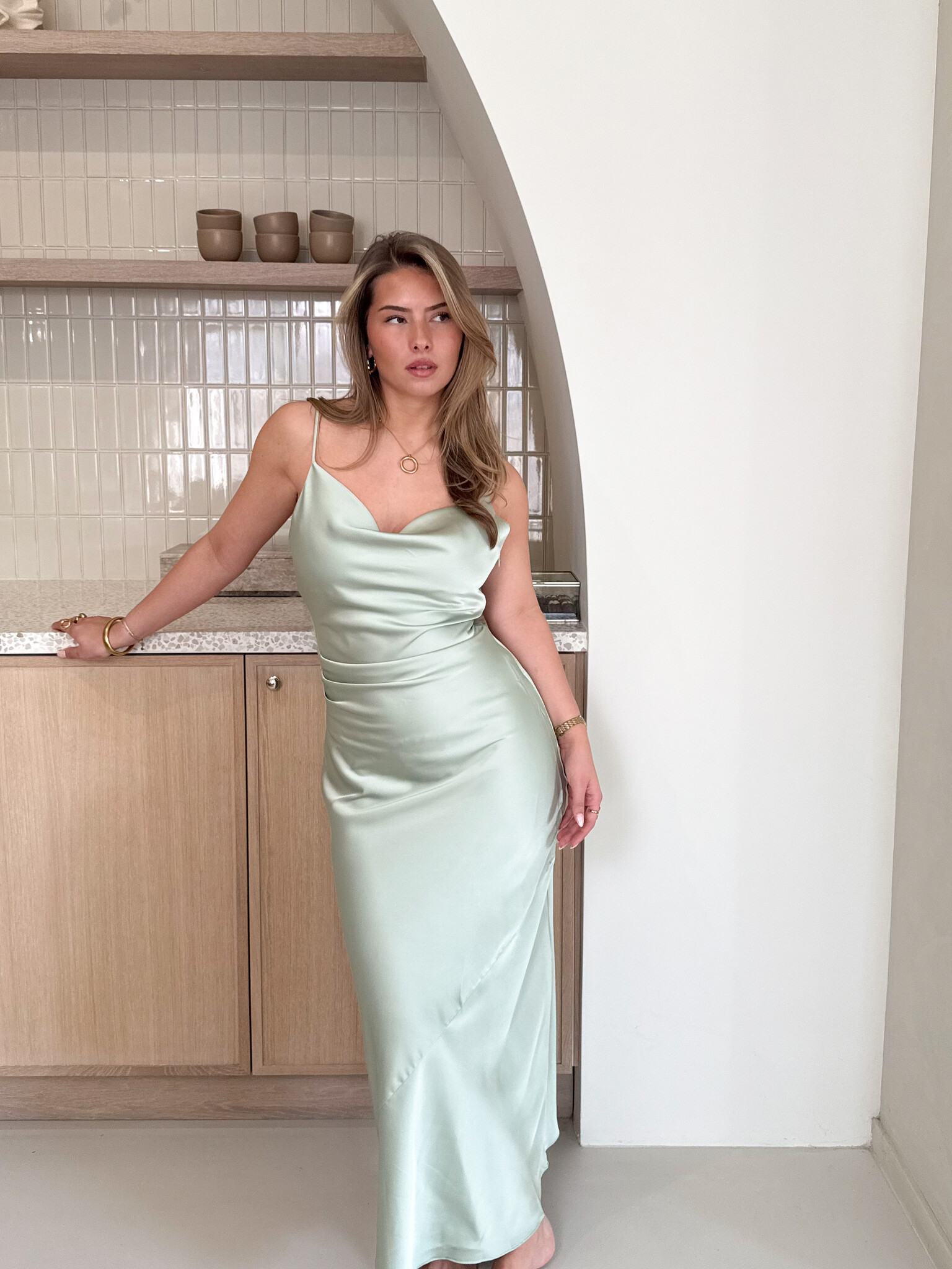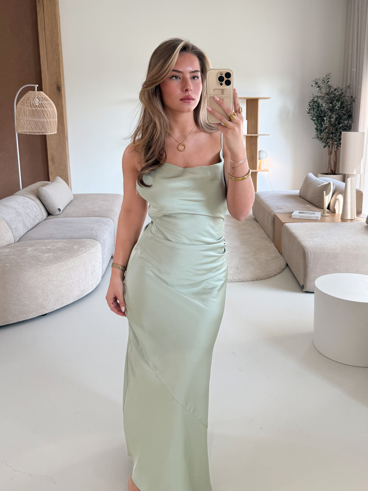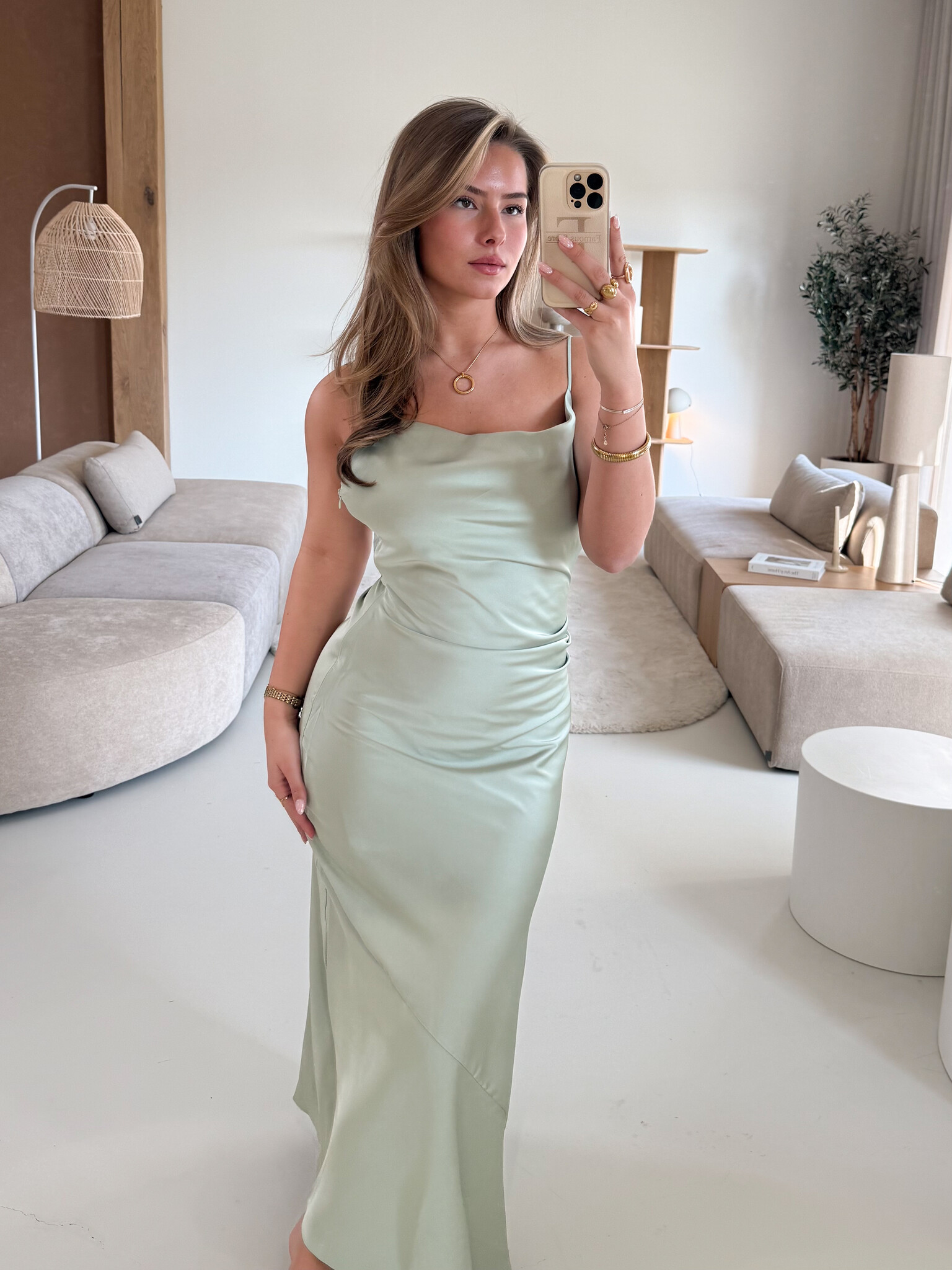 So elegant! Deze maxi-jurk is gemaakt van een glanzende satin stof. Bij de taille is hij geplooid, waardoor hij gedrapeerd valt. De jurk heeft dunne bandjes en een open rug. Prachtig voor een feestelijke gelegenheid.