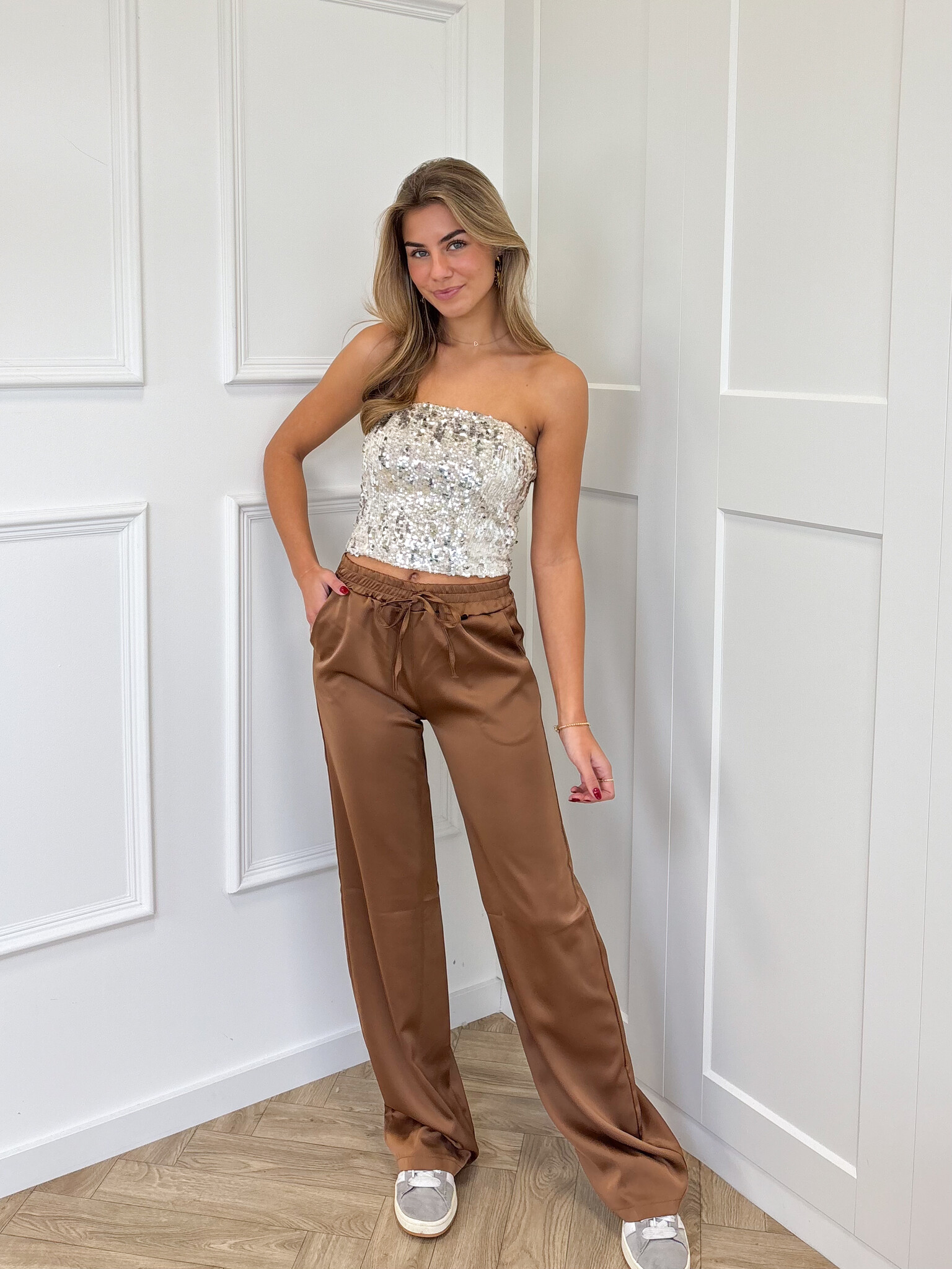 Meidennn... Hoe classy is deze broek?! Een prachtige satijnen broek met een strik touwtje. De broek valt lekker los en heeft zakken aan de voorkant. Het sluit mooi aan bij de taille door de elastische band en zit heerlijk. Je shopt deze musthave in meerdere kleuren! Satijn is een gevoelige kwetsbaren stof, wij zijn dan ook niet verantwoordelijk voor draagschades zoals haaltjes en ladders in het materiaal! (De broek valt een half maat kleiner neem voor de zekerheid als je bijvoorbeeld een M hebt maat ml)