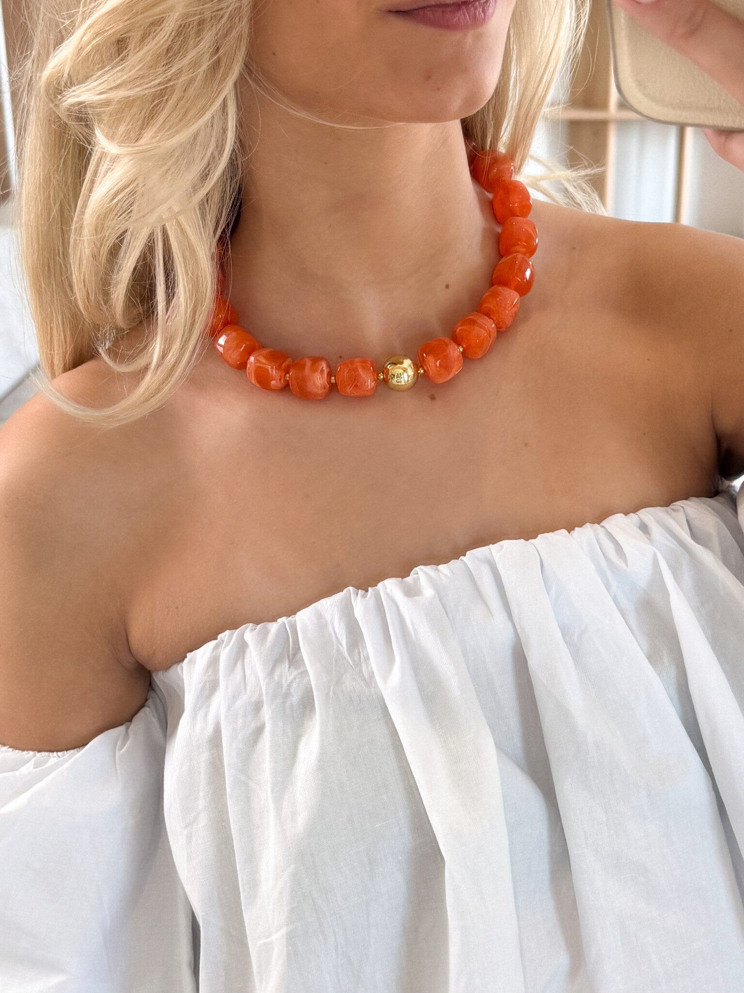 Deze opvallende oranje ketting is een echte statement accessoire voor iedere girly look. De ketting bestaat uit grove vierkante kralen met afgeronde hoeken in een warme gemarmerde oranje tint, wat zorgt voor een speelse en unieke uitstraling. Tussen de grotere kralen zitten subtiele gouden kralen, die een luxe accent toevoegen zonder te overheersen. Onderaan pronkt een glanzende goudkleurige parel, die elegantie en glamour toevoegt aan het ontwerp. De ketting is licht en comfortabel om te dragen, perfect voor zomerse festivals, citytrips, lunchdates of casual feestjes. Combineer met andere accessoires voor een trendy stacked look of draag solo voor een kleurrijke eyecatcher. Een musthave voor iedere girl die van girly en opvallende sieraden houdt.