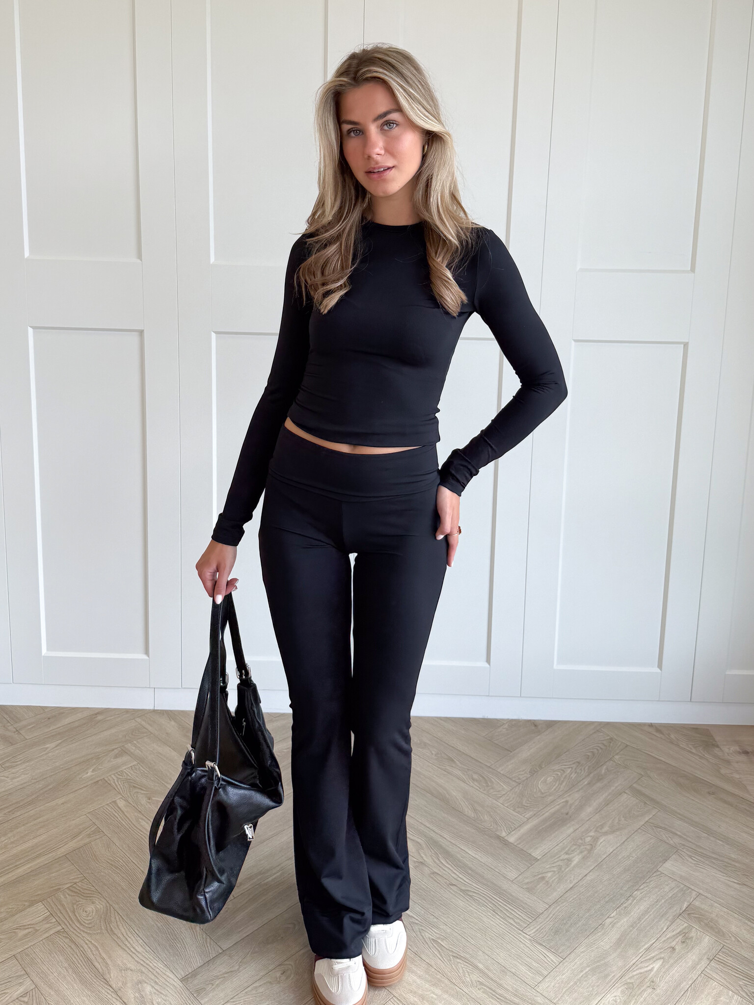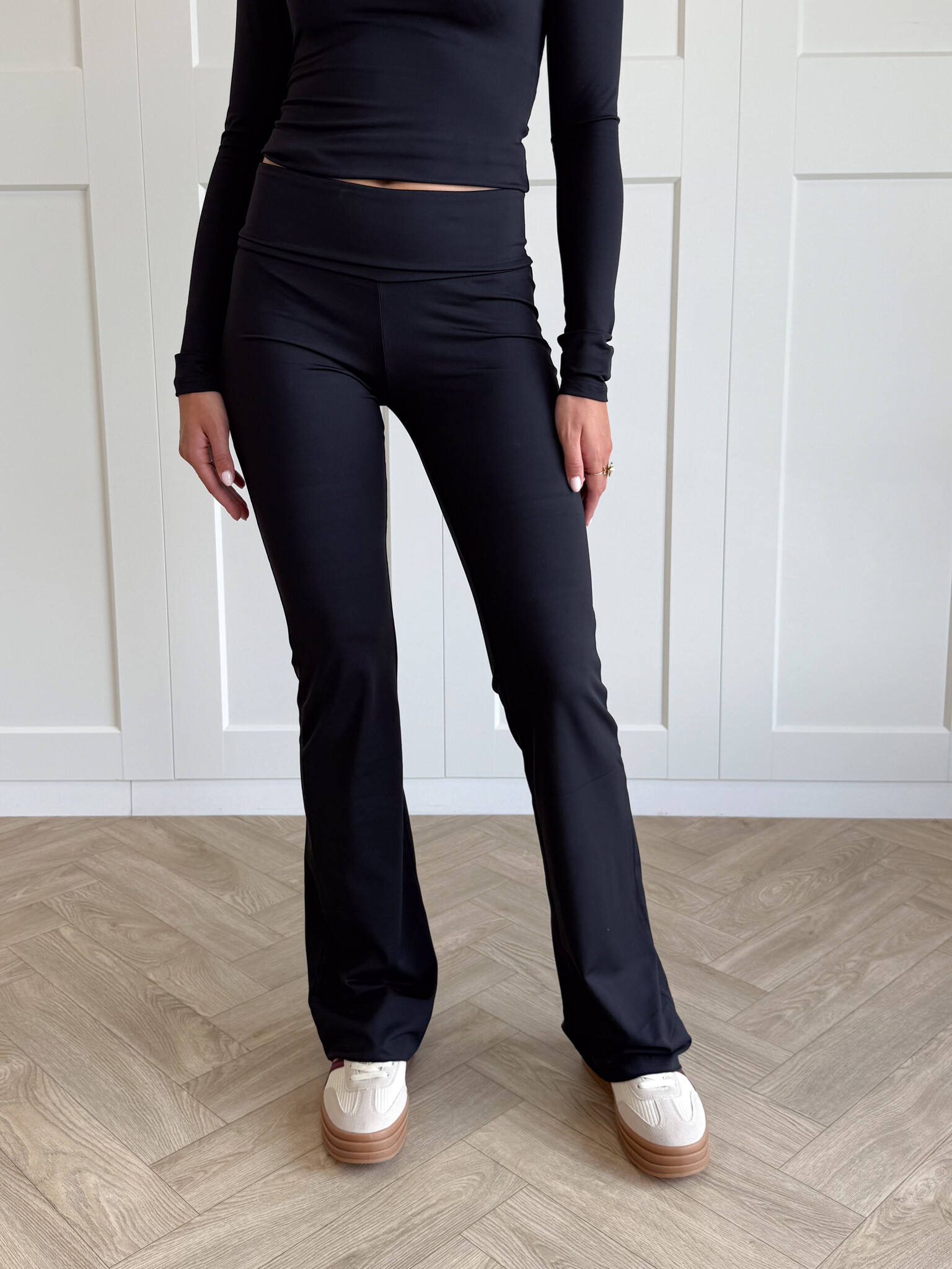 Say hi tegen jouw nieuwe favoriete sporty broek! Deze zwarte flare broek met stretch is speciaal ontworpen voor de comfy days!