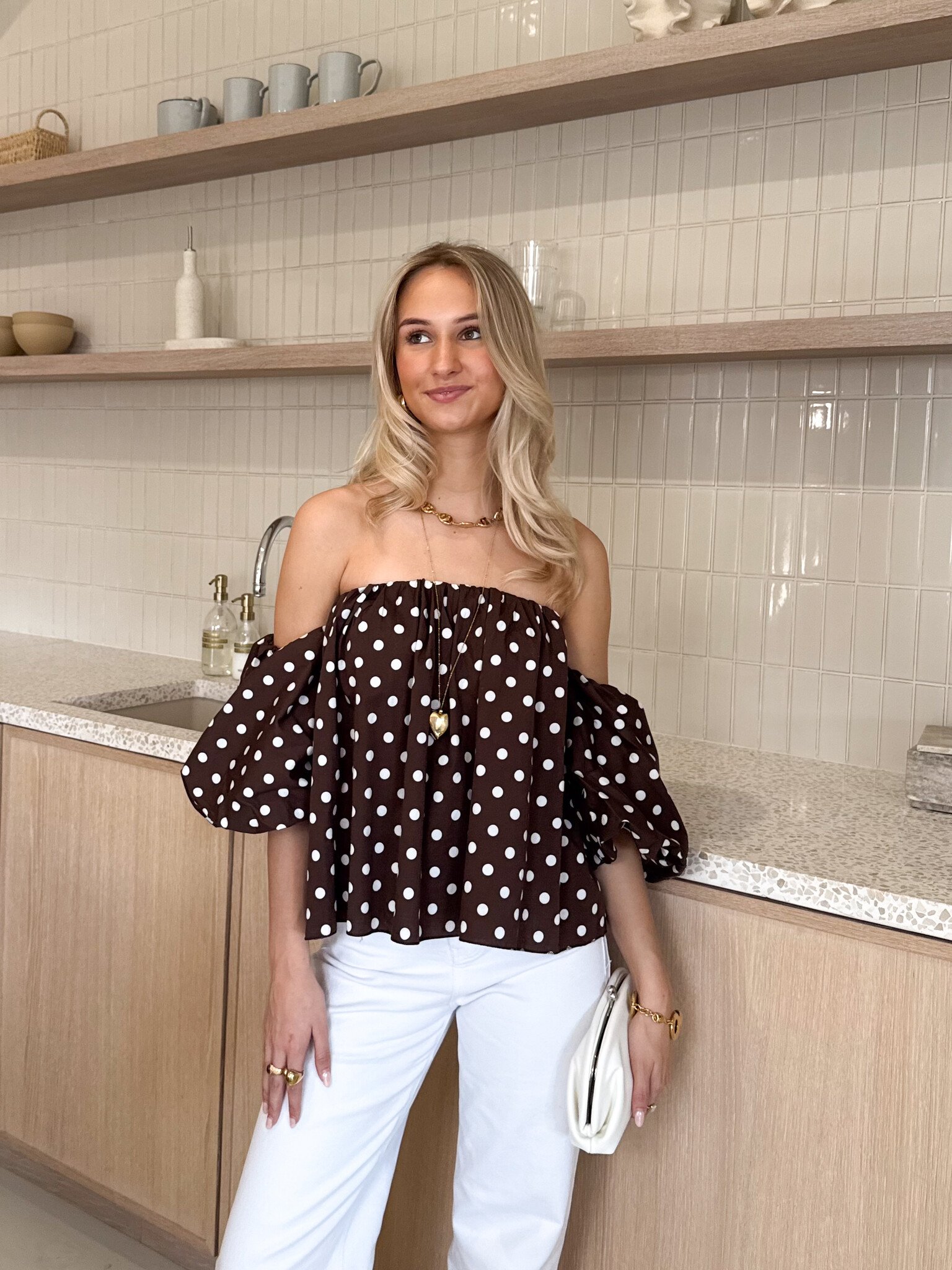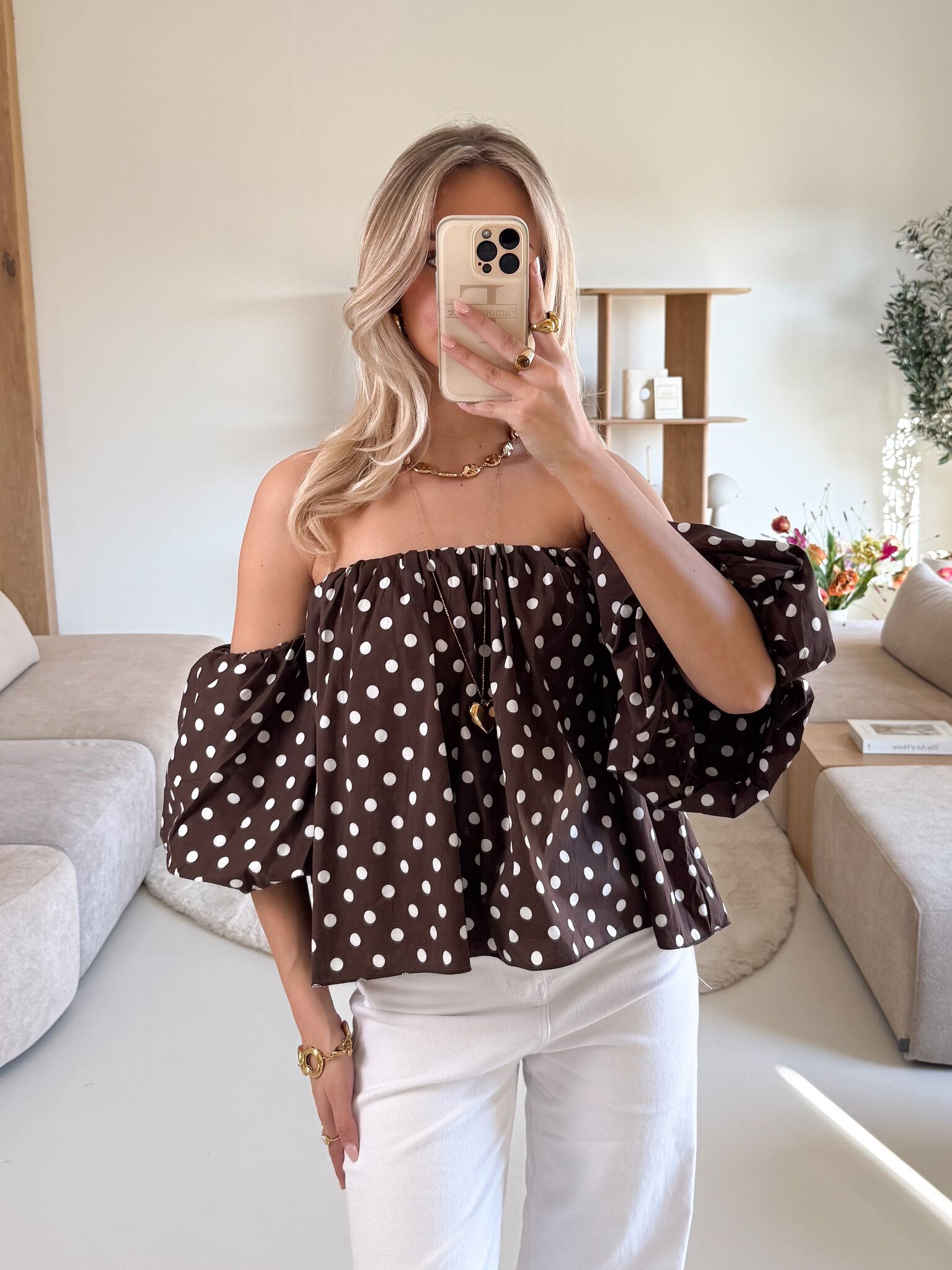 Deze off shoulder polkadots top met pofmouwen is een echte summer musthave. De off shoulder halslijn laat subtiel je schouders zien en geeft een feminine, flirty vibe. De speelse polkadot print zorgt voor een frisse en girly uitstraling, terwijl de pofmouwen extra volume en een trendy touch toevoegen. De top sluit mooi aan en zit comfortabel, waardoor je ‘m moeiteloos de hele dag draagt.